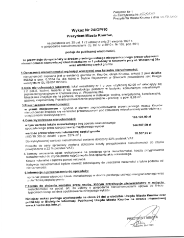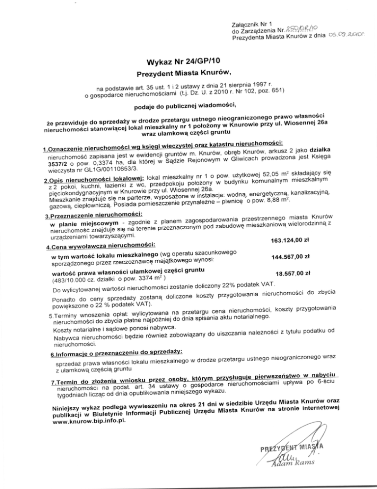 Zatacznik Nr 1 do Zarzadzenia Nr 2cDitie/ko Prezydenta Miasta KnurOw z dnia 05. 03. Zola^. Wykaz Nr 24/GP/10 Prezydent Miasta Knurdw, na podstawie art. 35 ust. 1 i 2 ustawy z dnia 21 sierpnia 1997 r. o gospodarce nieruchomoSciami (t.j. Dz. U. z 2010 r. Nr 102, poz. 651) podaje do publicznej wiadomo§ci, ie przewiduje do sprzedaiy w drodze przetargu ustnego nieograniczonego prawo wlasno§ci w Knurowie przy ul. Wiosennej 26a nieruchornoci stanowiqcej lokal mieszkalny nr 1 polo2ony wraz ulamkowq cze§ci gruntu wg ksiegi wieczystej oraz katastru nieruchomoSci: 1.0znaczen ie nieruchomo Sci dzialka zapisana jest w ewidencji gruntOw m. KnurOw. obreb KnurOw, arkusz 2 jako nieruchomo SO 3537/2 o pow. 0.3374 ha. dla ktbrej w Sqdzie Rejonowym w Gliwicach prowadzona jest Ksiega wieczysta nr GL1G/00110653/3. sktadajady sie lokal mieszkalny nr1o pow. uZytkowe j 52,05 m 2 2.0pis nieruchomoSci lokalowej: komunalnym mieszkalnym y w budynku z 2 pokoi, kuchni, lazienki z wc, przedpokoju poionn pieciokondygnacyjnym w Knurowie przy ul. Wiosennej 26a. Mieszkanie znajduje sic na parterze, wyposaZone w instalacje: wodnq, energetyczng, kanalizacyjnq, gazowq, cieplownicza,. Posiada pomieszczenie przynaleZne — piwnice o pow. 8,88 m2. 3.Przeznaczenie nieruchomoSci: miasta KnurOw - zgodnie z planem zagospodarowania przestrzenneg o w planie miejscowym pod zabudowe mieszkaniowa, wielorodzinng z m nieruchomo St znajduje sie na terenie przeznaczony urzadzeniam i towarzyszacymi. 163.124,00 zt 4.Cena wywolawcza nieruchomoSci: w tym warto§O Iokalu mieszkalneg o (wg operatu szacunkowego 144.567,00 zt sporzadzoneg o przez rzeczoznawce majqtkowego wynosi: wartosc prawa wtasno§ci ufamkowej czOci gruntu 18.557.00 zt ) (483/10.000 cz. dzialki o pow. 3374 m 2 zostanie doliczony 22% podatek VAT. Do wylicytowan e j wartoSci nieruchomoS ci Sci do zbycia Ponadto do ceny sprzedaiy zostana doliczone koszty przygotowania nieruchomo powiekszone o 22 % podatek VAT). i . koszty przygotowania 5.Terminy wnoszenia °Oat, wylicytowana na przetargu cena nieruchomoSc do zbycia platne najpb2niej do dnia spisania aktu notarialnego. nieruchomo Sci Koszty notarialne i sadowe ponosi nabywca. bedzie rOwnieZ zobowiazany do uiszczania naleZnoSci z tytutu podatku od Nabywca nieruchomoS ci nieruchomoSci. 6.Informacje o przeznacze niu do sprzedaiy: nego wraz sprzedaZ prawa wlasnoSci lokalu mieszkalnego w drodze przetargu ustnego nieograniczo z ulamkowa czeScia gruntu wo w nabyciu 7.Termin do ztoienia wniosku przez osoby, ktOrym przysluguje pierwszenst na podst. art. 34 ustawy o gospodarce nieruchomoSciami uplywa po 6-Sciu nieruchomo Sci tygodniach liczad od dnia opublikowania niniejszego wykazu. Niniejszy wykaz podlega wywieszeniu na okres 21 dni w siedzibie Urzedu Miasta Knur6w oraz publikacji w Biuletynie Informacji Publicznej Urzgdu Miasta Knurdw na stronie internetowej www.knurow.bip.info.pl . Zalqcznik Nr 2 do Zarzadzenia Nr....?1.5C1.41.sq.10 Prezydenta Miasta Knur6w z dnia 03.0g.-Z0toC Wykaz Nr 25/GP/10 Prezydent Miasta Knurdw, na podstawie art. 35 ust. 1 i 2 ustawy z dnia 21 sierpnia 1997 r. o gospodarce nieruchomoSc iami (t.j. Dz. U. z 2010 r. Nr 102, poz. 651) podaje do publicznej wiadomoci, ego prawo wtasnoci 2e przewiduje do sprzedaZy w drodze przetargu ustnego nieograniczon stanowigcej Iokal mieszkalny nr 3 poto2ony w Knurowie przy ul. Wiosennej 26b nieruchomo §ci wraz utamkowq czc§ci gruntu 1.0znaczen ie nieruchomoc i wg ksiQgi wieczystej oraz katastru nieruchomoSci: dzialka zapisana jest w ewidencji grunt6w m. Knur6w, obreb KnurOw. arkusz 2 jako u homo SO 0.3374 ha. dla ktbrej w Sqdzie Rejonowym w Gliwicach prowadzona jest Ksiega nierc 353 7/2 o p ow. wieczysta nr GL1G/00110653/3. 2 sktadajacy sie z 2.Opis nieruchomoSci lokalowej: lokal mieszkalny nr 3 o pow. u2ytkowej 74 m mieszkalnym 3 pokoi, kuchni, lazienki z wc, przedpokoju polonny w budynku komunalnym pieciokondygnacyjnym w Knurowie przy ul. Wiosennej 26b. kanalizacyjna. z Mieszkanie znajduje sie na I pietrze, wyposaZone w instalacje: wodna. energetyc nq 1 m2 Posiada pomieszczenie przynale2ne — piwnice o pow. 8,7. gazowq, cieplowniczq . 3.Przeznaczenie nieruchomoSci: - zgodnie z planem zagospodarowania przestrzennego miasta KnurOw w planie miejscowYm m pod zabudowe mieszkaniowa wielorodzinnq z nieruchomo SO znajduje sie na terenie przeznaczonY urzadzenia mi towarzyszacyrni. 4.Cena wywotawcza nieruchomotci: 239.621,00 zt w tym: warto§O lokalu mieszkalneg o (wg operatu szacunkowego 214.418,00 zt sporzadzoneg o przez rzeczoznawce majqtkowego wynosi: wartoe prawa wtasnoci utamkowej cz$CI gruntu 25.203,00 z# ) (483/10.000 cz. dzialki o pow. 3374 m . zostanie doliczony 22% podatek VAT. Do wylicytowanej wartoSci nieruchomoc i a nieruchomo ci do zbycia Ponadto do ceny sprzedaZy zostana doliczone koszty przygotowan i powiekszone o 22 `)/0 podatek VAT). i , koszty przygotowania 5.Terminy wnoszenia (Oat: wylicytowana na przetargu cena nieruchomoSc do zbycia platne najpb±niej do dnia spisania aktu notarialnego. nieruchomoc i Koszty notarialne i sqdowe ponosi nabywca. bedzie rbwnie2 zobowiqzany do uiszczania naleZno§ci z tytutu podatku od Nabywca nieruchomoS ci nieruchomoci. 6.Informacje o przeznaczen iu do sprzedaiy: sprzedaZ prawa wlasnoSci lokalu mieszkalnego w drodze przetargu ustnego nieograniczon ego wraz z uiamkowa, czOciq gruntu 7.Termin do zto2enia wniosku przez osoby, ktOrym przystuguje pierwszeristw o w nabyciu na podst. art. 34 ustawy o gospodarce nieruchomociami uplywa po nieruchomo ci tygodniach liczad od dnia opublikowan i a niniejszego wykazu. podlega wywieszeniu na okres 21 dni w siedzibie Urzgdu Miasta KnurOw oraz Niniejszy wykaz publikacji w Biuletynie Informacji Publicznej Urzcdu Miasta KnurOw na stronie internetowej www.knurow.bip.info.pl . PREZ slASTA (c, d m Rams