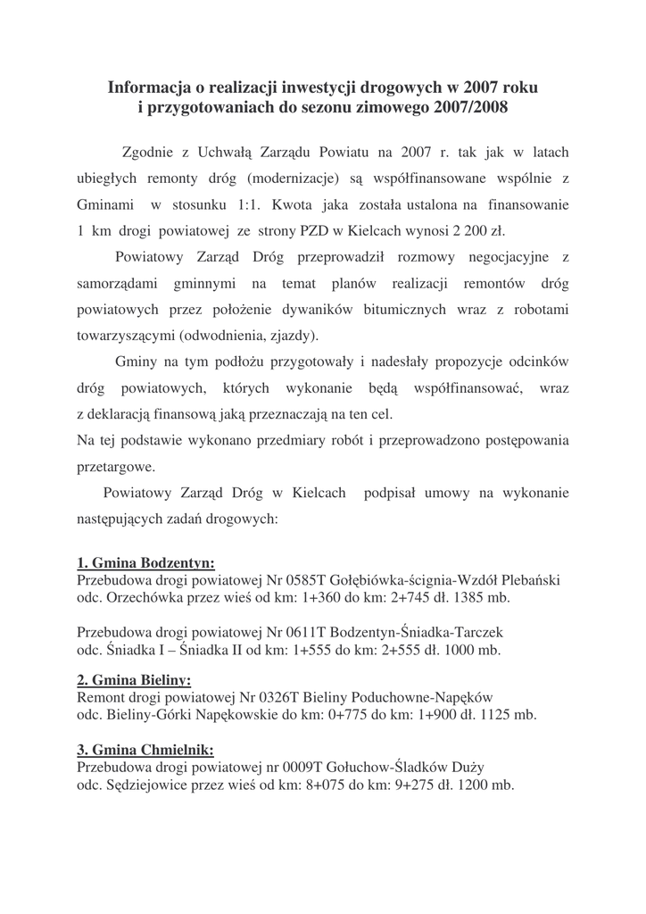 Informacja o realizacji inwestycji drogowych w 2007 roku i przygotowaniach do sezonu zimowego 2007/2008 Zgodnie z Uchwał Zarz du Powiatu na 2007 r. tak jak w latach ubiegłych remonty dróg (modernizacje) s Gminami współfinansowane wspólnie z w stosunku 1:1. Kwota jaka została ustalona na finansowanie 1 km drogi powiatowej ze strony PZD w Kielcach wynosi 2 200 zł. Powiatowy Zarz d Dróg przeprowadził rozmowy negocjacyjne z samorz dami gminnymi na temat planów realizacji remontów dróg powiatowych przez poło enie dywaników bitumicznych wraz z robotami towarzysz cymi (odwodnienia, zjazdy). Gminy na tym podło u przygotowały i nadesłały propozycje odcinków dróg powiatowych, których wykonanie b d współfinansowa , wraz z deklaracj finansow jak przeznaczaj na ten cel. Na tej podstawie wykonano przedmiary robót i przeprowadzono post powania przetargowe. Powiatowy Zarz d Dróg w Kielcach podpisał umowy na wykonanie nast puj cych zada drogowych: 1. Gmina Bodzentyn: Przebudowa drogi powiatowej Nr 0585T Goł biówka- cignia-Wzdół Pleba ski odc. Orzechówka przez wie od km: 1+360 do km: 2+745 dł. 1385 mb. Przebudowa drogi powiatowej Nr 0611T Bodzentyn- niadka-Tarczek odc. niadka I – niadka II od km: 1+555 do km: 2+555 dł. 1000 mb. 2. Gmina Bieliny: Remont drogi powiatowej Nr 0326T Bieliny Poduchowne-Nap ków odc. Bieliny-Górki Nap kowskie do km: 0+775 do km: 1+900 dł. 1125 mb. 3. Gmina Chmielnik: Przebudowa drogi powiatowej nr 0009T Gołuchow- ladków Du y odc. S dziejowice przez wie od km: 8+075 do km: 9+275 dł. 1200 mb. 2 4. Gmina Ch ciny: Przebudowa drogi powiatowej Nr 0275T Ch ciny-Zaj czków odc. PolichnoMiedzianka od km: 7+100 do km: 7+700 i od km: 3+440 do km: 4+490 dł. 1650 mb. Przebudowa drogi powiatowej Nr 0277T Skiby-dr.pow. Nr 0275T odc. Skiby przez wie od km: 0+980 do km: 1+640 dł. 660 mb. Przebudowa drogi powiatowej Nr 0276T Bolmin-Milechowy-Zaj czków odc. Bolmin-Milechowy od km: 0+000 do km: 0+500 dł. 500 mb. Przebudowa drogi powiatowej Nr 0385T Wrzosy-Staroch ciny od km: 0+350 do km: 0+650 dł. 300 mb. Przebudowa ulicy Długiej w m. Ch ciny odc. od km: 0+000 do km: 0+230 dł. 230 mb. Przebudowa drogi powiatowej Nr 0383T Wolica-Morawica odcinek Gol cinyChałupki Zbrza skie od km: 5+048 do km: 5+208 dł. 160 mb. 5. Gmina Górno: Przebudowa drogi powiatowej Nr 0316T Cedzyna-Leszczyny od drogi krajowej Nr 74 do drogi wojewódzkiej Nr 745 od km: 0+000 do km: 2+030 dł. 2030 mb. 6. Gmina Piekoszów: Przebudowa drogi powiatowej Nr 0484T Gnie dziska-Piekoszów odc. Bławatków-Rykoszyn w m. Skałka od km: 14+900 do km: 15+900 dł. 1000 mb. 7. Gmina Morawica: Przebudowa drogi powiatowej nr 0156T Sobków-Lisów odc. Łukowa-Zbrza od km: 8+176 do km: 8+484 i odc. Chałupki-Lisów od km: 16+052 do km: 16+637 dł. 893 mb. Przebudowa drogi powiatowej nr 0370T Bieleckie Młyny-Łab dziów odc. Bieleckie Młyny-Łab dziów od km: 1+241 do km: 1+911 dł. 670 mb. Przebudowa drogi powiatowej Nr 0353T Wola Morawicka-RadomicePierzchnica-Drugnia-Łagiewniki odc. w m. Wola Morawicka od km: 0+000 do km: 1+000 dł. 1000 mb. 3 Przebudowa drogi powiatowej Nr 0383T Wolica-Morawica odc. Chałupki Zbrza skie-Morawica od km: 5+208 do km: 9+200 oraz od km: 9+500 do km: 10+024 dł. 4516 mb. 8. Gmina Masłów: Przebudowa drogi powiatowej Nr 0309T D browa-Obo na Droga odc. D browa-Masłów II od km: 1+135 do km: 1+435 dł. 300 mb. Przebudowa drogi powiatowej Nr 0315T Masłów I – M chocice odc. Masłów I przez wie od km: 0+500 do km: 0+760 dł. 260 mb. Przebudowa drogi powiatowej Nr 0317T do O rodka Wypoczynkowego Ameliówka odc. Ameliówka od km: 0+000 do km: 0+325 dł. 325 mb. Przebudowa drogi powiatowej Nr 0321T M chocice Scholasteria odc. M chocice Scholasteria przez wie od km: 2+230 do km: 2+570 dł. 340 mb. Przebudowa drogi Nr 0595T Brzezinki-Barcza (budowa chodnika dł. 250 mb). 9. Gmina Mniów: Przebudowa drogi powiatowej Nr 0450T Staporków-Serbinów-GrzymałkówRuda Strawczy ska odc. Mniów przez wie od km: 15+140 do km: 16+150 dł. 1010 mb. Przebudowa drogi powiatowej Nr 0469T dr. kraj. Nr 74- mi sk Ko cielnyKobylaki-Przyjmo-P pice-Grzymałków-Smyków odc. P pice przez wie od km: 4+420 do km: 4+870 dł. 450 mb. Przebudowa drogi powiatowej Nr 0472T Kłucko-Pał gi-Wólka Kłucka odc. Pał gi przez wie od km: 1+705 do km: 2+155 dł. 450 mb. Przebudowa drogi powiatowej Nr 0466T Chyby-Kontrewers-Adamek odc. Chyby-Kontrewers od km: 0+700 do km: 1+300 dł. 600 mb. 10. Gmina Pierzchnica: Przebudowa drogi powiatowej Nr 0361T Wojciechów-Skrzelczyce-Górki-Brody odc. Wojciechów-Skrzelczyce od km: 1+780 do km: 3+110 dł. 1330 mb. Przebudowa drogi powiatowej Nr 0365T Suków-Wojciechów odc. Radomice-Komórki od km: 10+190 do km: 11+090 dł. 900 mb. 4 11.Gmina Nowa Słupia: Przebudowa drogi powiatowej Nr 0632T Sosnówka-Włochy-Wieloborowice odc. Rudki-Cz stków od km: 1+000 do km: 2+120 dł. 1120 mb. 12. Gmina Raków: Przebudowa drogi powiatowej Nr 0346T Sadków-Zbelutka-Szumsko-Lipiny odc. w m. Szumsko od km: 7+805 do km: 8+305 dł. 500 mb. Przebudowa drogi powiatowej Nr 0349T Drogowle-D bno odc. od km: 20+190 do km: 20+430 i od km: 30+830 do km: 31+060 dł. 470 mb. 13. Gmina Łagów: Przebudowa drogi powiatowej Nr 0345T Wola Łagowska-G sice-Niwa odc. Ruda-Zbelutka Nowa od km: 4+305 do km: 5+505 dł. 1200 mb. 14. Gmina Miedziana Góra: Remont drogi powiatowej Nr 0288T Laskowa-Kostomłoty Pierwsze odc. w m. Laskowa do km: 0+150 do km: 0+300 dł. 150 mb. Remont drogi powiatowej Nr 0289T Samsonów-Miedziana Góra odc. w m. Miedziana Góra od km: 6+235 do km: 6+930 dł. 695 mb. 15. Gmina Zagna sk: Przebudowa drogi powiatowej Nr 0305T Stary Szałas – droga powiatowa Nr 0437T odc. Szałas-Zaupust od km: 3+740 do km: 4+610 dł. 870 mb. 16. Gmina Łopuszno: Przebudowa drogi powiatowej Nr 0403T Jasie -Antonielow odc. Jasie -Barycz od km: 0+000 do km: 1+400 dł. 1400 mb. 17. Gmina Daleszyce: Remont drogi powiatowej Nr 0329T Radlin-Brzechów-Daleszyce odc. Brzechów-Daleszyce od km: 4+7
