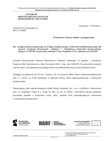 Postępowanie prowadzone w trybie przetargu nieograniczonego pn. Usługa zintegrowanego środowiska teleinformatycznego dla nowych rozwiązań biznesowych. CENTRUM PRZETWARZANIA DANYCH MINISTERSTWA FINANSÓW Warszawa, 17/05/2016 r. CPD.ZP.272.4.2016.RZE.33 PN/17/15/RZE Wykonawcy biorący udział w postępowaniu dot. postępowania przetargowego na Usługa zintegrowanego środowiska teleinformatycznego dla nowych rozwiązań biznesowych - Zadanie 3 - Rozbudowa środowiska bezpieczeństwa danych w CPD MF na potrzeby realizacji I Fazy Projektów CVP, e-finanse oraz PUESC Centrum Przetwarzania Danych Ministerstwa Finansów informuje, że zgodnie z Wyrokiem Krajowej Izby Odwoławczej z dnia 8 kwietnia 2016 r. Syg. Akt. KIO/451/16 unieważnił czynność wyboru ofert w przedmiotowym postępowaniu oraz dokonał ponownej oceny złożonych ofert. Działając na podstawie art. 92 ust. 1 ustawy z dn. 29 stycznia 2004r. Prawo zamówień publicznych (Dz. U. z 2015r. nr 2164) informuje, iż dokonał wyboru oferty najkorzystniejszej w niniejszym postępowaniu. Zamawiający, jako najkorzystniejszą wybrał ofertę Symmetry Sp. z o.o. z siedzibą w Katowicach przy ul. Zygmunta Vogla 8 z uwagi na fakt, że jest to oferta z największą łączną punktacją przyznaną zgodnie z kryteriami oceny ofert, spośród ofert niepodlegających odrzuceniu w niniejszym postępowaniu. CENTRUM PRZETWARZANIA DANYCH MINISTERSTWA FINANSÓW UL. ŚWIĘTOKRZYSKA 12, 00-916 WARSZAWA FAX. (22) 694 33 80 Sporządził: Natalia Czobot Strona 1 z 2 Zestawienie ofert l.p Nr oferty 1 1 2 2 3 3 Nazwa Wykonawcy Pkt w kryterium cena Comparex Poland sp. z o.o. ul. Równoległa 2 02-235 Warszawa Symmetry sp. z o.o. ul. Zygmunta Vogla 8 02-963 Warszawa Netology sp. z o.o. ul. Porcelanowa 23 40-246 Katowice Pkt w kryterium gwarancja Pkt ogółem ------------------------------ 95 0 95 87,68 0 87,68 Dyrektor Centrum Przetwarzania Danych Ministerstwa Finansów Michał Czech /podpis na oryginale/ CENTRUM PRZETWARZANIA DANYCH MINISTERSTWA FINANSÓW UL. ŚWIĘTOKRZYSKA 12, 00-916 WARSZAWA FAX. (22) 694 33 80 Sporządził: Natalia Czobot Strona 2 z 2