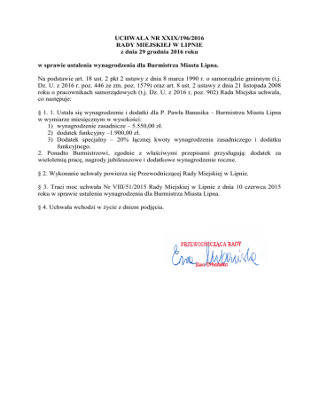 UCHWAŁA NR XXIX/196/2016 RADY MIEJSKIEJ W LIPNIE z dnia 29 grudnia 2016 roku w sprawie ustalenia wynagrodzenia dla Burmistrza Miasta Lipna. Na podstawie art. 18 ust. 2 pkt 2 ustawy z dnia 8 marca 1990 r. o samorządzie gminnym (t.j. Dz. U. z 2016 r. poz. 446 ze zm. poz. 1579) oraz art. 8 ust. 2 ustawy z dnia 21 listopada 2008 roku o pracownikach samorządowych (t.j. Dz. U. z 2016 r, poz. 902) Rada Miejska uchwala, co następuje: § 1. 1. Ustala się wynagrodzenie i dodatki dla P. Pawła Banasika – Burmistrza Miasta Lipna w wymiarze miesięcznym w wysokości: 1) wynagrodzenie zasadnicze – 5.550,00 zł. 2) dodatek funkcyjny –1.900,00 zł. 3) Dodatek specjalny – 20% łącznej kwoty wynagrodzenia zasadniczego i dodatku funkcyjnego. 2. Ponadto Burmistrzowi, zgodnie z właściwymi przepisami przysługują: dodatek za wieloletnią pracę, nagrody jubileuszowe i dodatkowe wynagrodzenie roczne. § 2. Wykonanie uchwały powierza się Przewodniczącej Rady Miejskiej w Lipnie. § 3. Traci moc uchwała Nr VIII/51/2015 Rady Miejskiej w Lipnie z dnia 10 czerwca 2015 roku w sprawie ustalenia wynagrodzenia dla Burmistrza Miasta Lipna. § 4. Uchwała wchodzi w życie z dniem podjęcia.