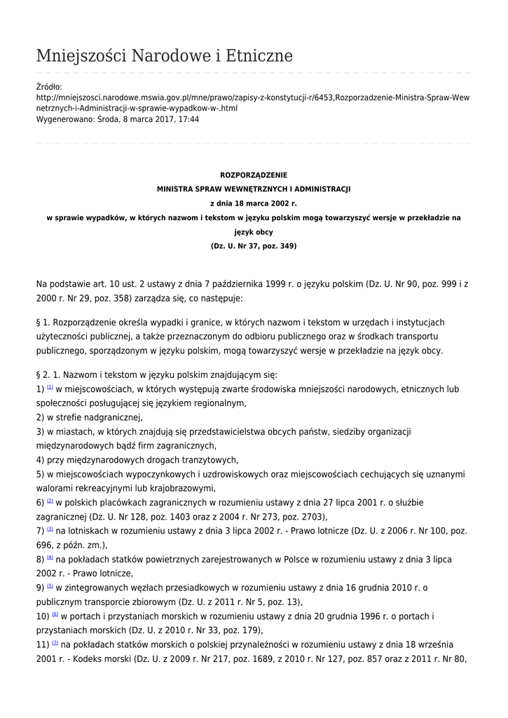 Mniejszości Narodowe i Etniczne Źródło: http://mniejszosci.narodowe.mswia.gov.pl/mne/prawo/zapisy-z-konstytucji-r/6453,Rozporzadzenie-Ministra-Spraw-Wew netrznych-i-Administracji-w-sprawie-wypadkow-w-.html Wygenerowano: Środa, 8 marca 2017, 17:44 ROZPORZĄDZENIE MINISTRA SPRAW WEWNĘTRZNYCH I ADMINISTRACJI z dnia 18 marca 2002 r. w sprawie wypadków, w których nazwom i tekstom w języku polskim mogą towarzyszyć wersje w przekładzie na język obcy (Dz. U. Nr 37, poz. 349) Na podstawie art. 10 ust. 2 ustawy z dnia 7 października 1999 r. o języku polskim (Dz. U. Nr 90, poz. 999 i z 2000 r. Nr 29, poz. 358) zarządza się, co następuje: § 1. Rozporządzenie określa wypadki i granice, w których nazwom i tekstom w urzędach i instytucjach użyteczności publicznej, a także przeznaczonym do odbioru publicznego oraz w środkach transportu publicznego, sporządzonym w języku polskim, mogą towarzyszyć wersje w przekładzie na język obcy. § 2. 1. Nazwom i tekstom w języku polskim znajdującym się: 1) (1) w miejscowościach, w których występują zwarte środowiska mniejszości narodowych, etnicznych lub społeczności posługującej się językiem regionalnym, 2) w strefie nadgranicznej, 3) w miastach, w których znajdują się przedstawicielstwa obcych państw, siedziby organizacji międzynarodowych bądź firm zagranicznych, 4) przy międzynarodowych drogach tranzytowych, 5) w miejscowościach wypoczynkowych i uzdrowiskowych oraz miejscowościach cechujących się uznanymi walorami rekreacyjnymi lub krajobrazowymi, 6) (2) w polskich placówkach zagranicznych w rozumieniu ustawy z dnia 27 lipca 2001 r. o służbie zagranicznej (Dz. U. Nr 128, poz. 1403 oraz z 2004 r. Nr 273, poz. 2703), 7) (3) na lotniskach w rozumieniu ustawy z dnia 3 lipca 2002 r. - Prawo lotnicze (Dz. U. z 2006 r. Nr 100, poz. 696, z późn. zm.), 8) (4) na pokładach statków powietrznych zarejestrowanych w Polsce w rozumieniu ustawy z dnia 3 lipca 2002 r. - Prawo lotnicze, 9) (5) w zintegrowanych węzłach przesiadkowych w rozumieniu ustawy z dnia 16 grudnia 2010 r. o publicznym transporcie zbiorowym (Dz. U. z 2011 r. Nr 5, poz. 13), 10) (6) w portach i przystaniach morskich w rozumieniu ustawy z dnia 20 grudnia 1996 r. o portach i przystaniach morskich (Dz. U. z 2010 r. Nr 33, poz. 179), 11) (7) na pokładach statków morskich o polskiej przynależności w rozumieniu ustawy z dnia 18 września 2001 r. - Kodeks morski (Dz. U. z 2009 r. Nr 217, poz. 1689, z 2010 r. Nr 127, poz. 857 oraz z 2011 r. Nr 80, poz. 432), 12) (8) na pokładach statków polskich w rozumieniu ustawy z dnia 21 grudnia 2000 r. o żegludze śródlądowej (Dz. U. z 2006 r. Nr 123, poz. 857, z późn. zm.), 13) (9) w bankomatach w rozumieniu ustawy z dnia 12 września 2002 r. o elektronicznych instrumentach płatniczych (Dz. U. Nr 169, poz. 1385, z późn. zm.), 14) (10) w automatach biletowych - mogą towarzyszyć wersje w przekładzie na język obcy. 2. Dokonywanie przekładu dotyczy nazw i tekstów: 1) umieszczonych: a) na tablicy urzędu lub instytucji użyteczności publicznej, b) w innym eksponowanym miejscu przeznaczonym do informowania, c) w środkach transportu publicznego, 2) przeznaczonych do odbioru publicznego. 3. (11) Przekład umieszcza się pod tekstem sporządzonym w języku polskim lub w formie załącznika do tego tekstu, lub w inny sposób stanowiący uzupełnienie nazw i tekstów sporządzonych w języku polskim. 4. (12) W wypadku, o którym mowa w ust. 1 pkt 1, językiem obcym powinien być w szczególności język mniejszości narodowych lub etnicznych albo język regionalny. 4a. (13) W wypadku, o którym mowa w ust. 1 pkt 2, językiem obcym powinien być w szczególności język urzędowy sąsiadującego państwa. 4b. (14) W wypadkach, o których mowa w ust. 1 pkt 3-14, językiem obcym powinien być jeden z języków urzędowych Unii Europejskiej. 5. Przekładu nazw i tekstów można dokonywać na więcej niż jeden język obcy. § 3. 1. Przekład, o którym mowa w § 2, obejmuje: 1) nazwę urzędu lub instytucji użyteczności publicznej, 2) zasady wstępu do urzędu lub instytucji użyteczności publicznej, 3) informację pozwalającą osobie zainteresowanej na skierowanie sprawy do właściwej komórki organizacyjnej urzędu lub instytucji użyteczności publicznej, 4) inne informacje ułatwiające korzystanie z działalności podmiotów, o których mowa w pkt 1, 5) (15) informacje istotne ze względów bezpieczeństwa oraz ułatwiające korzystanie z obiektów oraz urządzeń, o których mowa w § 2 ust. 1 pkt 7-14. 2. W środkach transportu publicznego przekład obejmuje: 1) najważniejsze postanowienia regulaminu przejazdu, 2) sposób posługiwania się urządzeniami znajdującymi się w środkach przejazdu, 3) inne informacje ułatwiające korzystanie ze środków transportu publicznego. § 4. Rozporządzenie wchodzi w życie po upływie 14 dni od dnia ogłoszenia. Przypisy: 1) § 2 ust. 1 pkt 1 zmieniony przez § 1 pkt 1 lit. a) rozporządzenia z dnia 19 kwietnia 2006 r. (Dz.U.2006.75.526) zmieniającego nin. rozporządzenie z dniem 19 maja 2006 r. 2) § 2 ust. 1 pkt 6 dodany przez § 1 pkt 1 lit. b) rozporządzenia z dnia 19 kwietnia 2006 r. (Dz.U.2006.75.526) zmieniającego nin. rozporządzenie z dniem 19 maja 2006 r. 3) § 2 ust. 1 pkt 7 dodany przez § 1 pkt 1 lit. a) rozporządzenia z dnia 29 września 2011 r. (Dz.U.2011.224.1349) zmieniającego nin. rozporządzenie z dniem 3 listopada 2011 r. 4) § 2 ust. 1 pkt 8 dodany przez § 1 pkt 1 lit. a) rozporządzenia z dnia 29 września 2011 r. (Dz.U.2011.224.1349) zmieniającego nin. rozporządzenie z dniem 3 listopada 2011 r. 5) § 2 ust. 1 pkt 9 dodany przez § 1 pkt 1 lit. a) rozporządzenia z dnia 29 września 2011 r. (Dz.U.2011.224.1349) zmieniającego nin. rozporządzenie z dniem 3 listopada 2011 r. 6) § 2 ust. 1 pkt 10 dodany przez § 1 pkt 1 lit. a) rozporządzenia z dnia 29 września 2011 r. (Dz.U.2011.224.1349) zmieniającego nin. rozporządz
