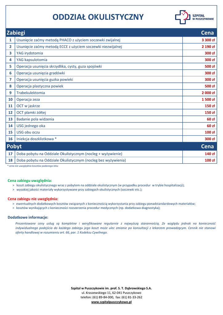 ODDZIAŁ OKULISTYCZNY Zabiegi Cena 1 Usunięcie zaćmy metodą PHACO z użyciem soczewki zwijalnej 3 300 zł 2 Usunięcie zaćmy metodą ECCE z użyciem soczewki niezwijalnej 2 190 zł 3 YAG irydotomia 300 zł 4 YAG kapsulotomia 300 zł 5 Operacja usunięcia skrzydlika, cysty, guza spojówki 500 zł 6 Operacja usunięcia gradówki 300 zł 7 Operacja usunięcia guzka powieki 300 zł 8 Operacja plastyczna powiek 500 zł 9 Trabekulektomia 2 000 zł 10 Operacja zeza 1 500 zł 11 OCT w jaskrze 150 zł 12 OCT plamki żółtej 150 zł 13 Badanie pola widzenia 60 zł 14 USG jednego oka 60 zł 15 USG obu oczu 100 zł 16 Iniekcja doszklistkowa * 300 zł Pobyt Cena 17 Doba pobytu na Oddziale Okulistycznym (nocleg + wyżywienie) 140 zł 18 Doba pobytu na Oddziale Okulistycznym (nocleg bez wyżywienia) 100 zł * cena nie uwzględnia kosztów podanego leku Cena zabiegu uwzględnia: > koszt zabiegu okulistycznego wraz z pobytem na oddziale okulistycznym (w przypadku procedur w trybie hospitalizacji); > wysokiej jakości materiały wykorzystywane przy zabiegach okulistycznych (soczewki etc.); Cena zabiegu nie uwzględnia: > ewentualnych dodatkowych kosztów związanych z koniecznością wykorzystania przy zabiegu ponadstandardowych materiałów; > kosztów wynikających z konieczności rozszerzenia procedur medycznych (np. dodatkowa diagnostyka); Dodatkowe informacje: Prezentowane ceny usług są kompletne i weryfikowane regularnie z najwyższą starannością. Ze względu jednak na konieczność indywidualnego podejścia do każdego zabiegu jego koszt może ulec zmianie po konsultacji z lekarzem prowadzącym. Cennik nie stanowi oferty handlowej w rozumieniu art. 66, par. 1 Kodeksu Cywilnego. Szpital w Puszczykowie im. prof. S. T. Dąbrowskiego S.A. ul. Kraszewskiego 11, 62-041 Puszczykowo telefon: (61) 89-84-000, fax: (61) 81-33-262 www.szpitalpuszczykowo.pl