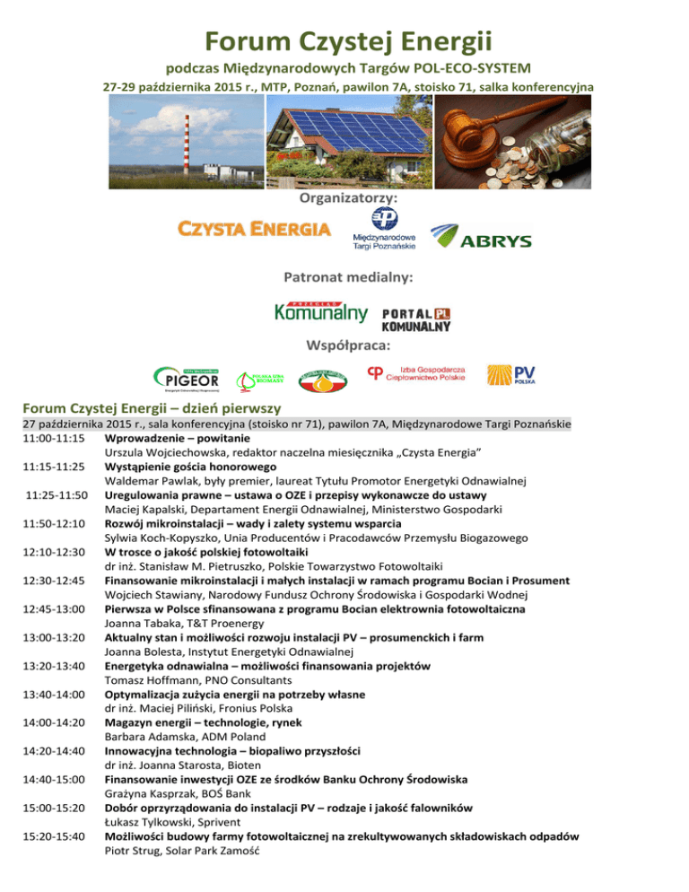Forum Czystej Energii podczas Międzynarodowych Targów POL-ECO-SYSTEM 27-29 października 2015 r., MTP, Poznań, pawilon 7A, stoisko 71, salka konferencyjna Organizatorzy: Patronat medialny: Współpraca: Forum Czystej Energii – dzień pierwszy 27 października 2015 r., sala konferencyjna (stoisko nr 71), pawilon 7A, Międzynarodowe Targi Poznańskie 11:00-11:15 Wprowadzenie – powitanie Urszula Wojciechowska, redaktor naczelna miesięcznika „Czysta Energia” 11:15-11:25 Wystąpienie gościa honorowego Waldemar Pawlak, były premier, laureat Tytułu Promotor Energetyki Odnawialnej 11:25-11:50 Uregulowania prawne – ustawa o OZE i przepisy wykonawcze do ustawy Maciej Kapalski, Departament Energii Odnawialnej, Ministerstwo Gospodarki 11:50-12:10 Rozwój mikroinstalacji – wady i zalety systemu wsparcia Sylwia Koch-Kopyszko, Unia Producentów i Pracodawców Przemysłu Biogazowego 12:10-12:30 W trosce o jakość polskiej fotowoltaiki dr inż. Stanisław M. Pietruszko, Polskie Towarzystwo Fotowoltaiki 12:30-12:45 Finansowanie mikroinstalacji i małych instalacji w ramach programu Bocian i Prosument Wojciech Stawiany, Narodowy Fundusz Ochrony Środowiska i Gospodarki Wodnej 12:45-13:00 Pierwsza w Polsce sfinansowana z programu Bocian elektrownia fotowoltaiczna Joanna Tabaka, T&T Proenergy 13:00-13:20 Aktualny stan i możliwości rozwoju instalacji PV – prosumenckich i farm Joanna Bolesta, Instytut Energetyki Odnawialnej 13:20-13:40 Energetyka odnawialna – możliwości finansowania projektów Tomasz Hoffmann, PNO Consultants 13:40-14:00 Optymalizacja zużycia energii na potrzeby własne dr inż. Maciej Piliński, Fronius Polska 14:00-14:20 Magazyn energii – technologie, rynek Barbara Adamska, ADM Poland 14:20-14:40 Innowacyjna technologia – biopaliwo przyszłości dr inż. Joanna Starosta, Bioten 14:40-15:00 Finansowanie inwestycji OZE ze środków Banku Ochrony Środowiska Grażyna Kasprzak, BOŚ Bank 15:00-15:20 Dobór oprzyrządowania do instalacji PV – rodzaje i jakość falowników Łukasz Tylkowski, Sprivent 15:20-15:40 Możliwości budowy farmy fotowoltaicznej na zrekultywowanych składowiskach odpadów Piotr Strug, Solar Park Zamość Forum Czystej Energii – dzień drugi sesja specjalna: Polskie ciepłownie – koncepcje modernizacji 28 października 2015 r., sala konferencyjna (stoisko 71), pawilon 7A, Międzynarodowe Targi Poznańskie Współpraca: 10:30-10:35 10:35-10:55 10:55-11:20 11:20-11:50 11:50-12:10 12:10-12:30 12:30-12:50 12:50-13:10 13:10-13:30 13:30-16:00 Partner sesji: Wprowadzenie – powitanie Urszula Wojciechowska, redaktor naczelna miesięcznika „Czysta Energia” Efektywny system ciepłowniczy – na obecnym i przyszłym rynku ciepła Bogusław Regulski, Izba Gospodarcza Ciepłownictwo Polskie Potencjał biomasy możliwy do wykorzystania w polskich ciepłowniach Wojciech Mazurkiewicz, Alternative Global Trade Nowoczesne ciepłownictwo sieciowe zamiast przestarzałych kotłowni – sposób na likwidację niskiej emisji Paweł Smoleń, Erbud Odzysk energii z odpadów komunalnych w świetle zapisów ustawy o OZE Maciej Szambelańczyk, WKB Wierciński, Kwieciński, Baehr Wykorzystanie paliw alternatywnych do produkcji energii cieplnej w małych i średnich miastach Wojciech Rychlicki, Ekokogeneracja Wykorzystanie lokalnej sieci ciepłowniczej pracującej w oparciu o odnawialne źródło energii Janusz Starościk, Stowarzyszenie Producentów i Importerów Urządzeń Grzewczych Jak wspierać rozwój ciepłownictwa i kogeneracji? Jaki jest potencjał rozwoju ciepłownictwa sieciowego w dobie coraz bardziej energooszczędnych domów? Andrzej Rubczyński, Departament Regulacji i Relacji Zewnętrznych PGNiG TERMIKA Energetyka rozproszona – skandynawski model wykorzystania biomasy Piotr Antczak, CEE Business Development Director Panel: „Polskie ciepłownie – koncepcje modernizacji” moderowany przez Bogusława Regulskiego Paneliści: Paweł Smoleń, Andrzej Rubczyński, Janusz Starościk, Wojciech Rychlicki, Andrzej Schoeneich (dyrektor Izby Gospodarczej Gazownictwa) Forum Czystej Energii – dzień trzeci 29 października 2015 r., sala konferencyjna (stoisko 71), pawilon 7A, Międzynarodowe Targi Poznańskie Partner sesji: 10:30-10:35 10:35-11:00 11:00-11:15 11:15-11:30 11:30-12:00 12:00-16:00 Wprowadzenie – powitanie Urszula Wojciechowska, redaktor naczelna miesięcznika „Czysta Energia” Co wybrać – wsparcie w postaci taryfy gwarantowanej czy dofinansowanie ze środków programu Prosument? Co dla kogo lepsze? Radosław Wasiak, Kancelaria Prawna Wardyński i Wspólnicy Monitoring mikro i małych instalacji fotowoltaicznych – zbyteczny gadżet czy strażnik jakości? Paweł Jeliński, SolarLog Program EU ETV – realne wsparcie dla innowacyjnych technologii branży OZE Agnieszka Wawrzyniak, kierownik JWTS-ITP Przykłady modeli wsparcia OZE wybranych rynków Grzegorz Szymczak, Europen Energy Twoja firma na aukcji OZE – samodzielnie czy za pośrednictwem fachowego operatora? Panel dyskusyjny moderowany przez Michała Tarkę, BTK-LEGAL Paneliści: Wiesław Piosik, Janusz Gajowiecki, Marcin Trupkiewicz - przygotowanie do pierwszej aukcji OZE - przebieg i organizacja aukcji OZE - wykaz i realizacja obowiązków wytwórców energii z OZE - obliczanie pomocy publicznej, obowiązki dokumentacyjne względem URE - doświadczenia z przeprowadzonej przez PSEW próbnej aukcji energii z OZE - rola i kompleksowa oferta Operatora Systemu Aukcji OZE Stan na 19.10.2015 r. *Organizatorzy zastrzegają sobie prawo do zmian w programie Zgłoś swój udział na Forum Czystej Energii! Dzień: • 27.10.2015 r. • 28.10.2015 r. • 29.10.2015r. Imię:__________________________________________________________________ Nazwisko:______________________________________________________________ Nazwa organizacji:_______________________________________________________ Stanowisko:____________________________________________________________ Telefon:______________________