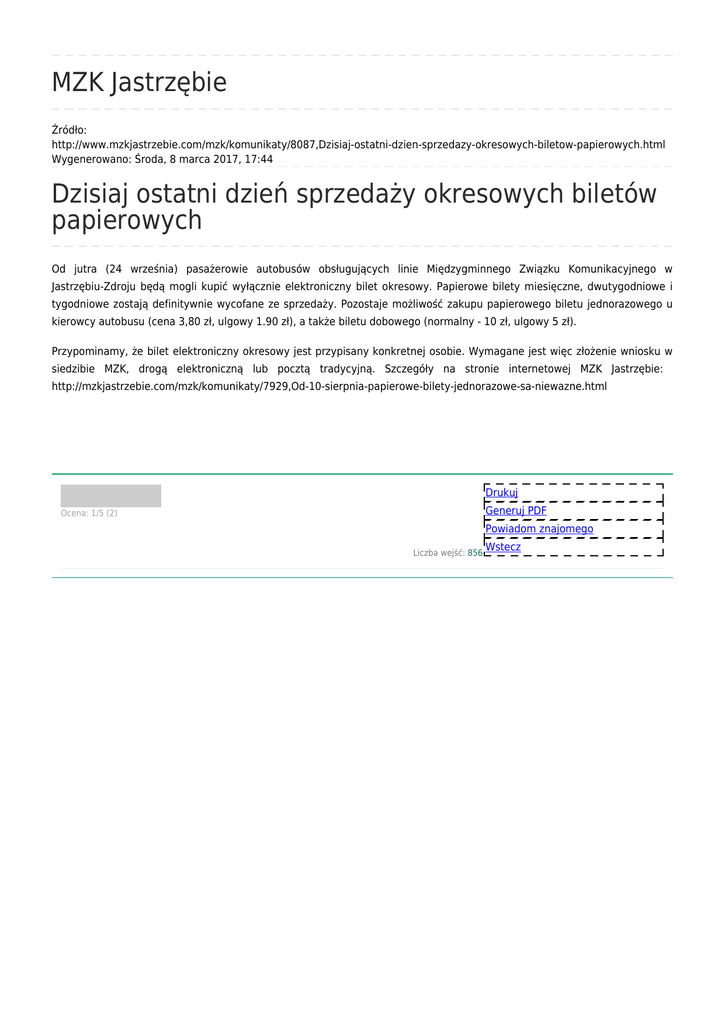 MZK Jastrzębie Źródło: http://www.mzkjastrzebie.com/mzk/komunikaty/8087,Dzisiaj-ostatni-dzien-sprzedazy-okresowych-biletow-papierowych.html Wygenerowano: Środa, 8 marca 2017, 17:44 Dzisiaj ostatni dzień sprzedaży okresowych biletów papierowych Od jutra (24 września) pasażerowie autobusów obsługujących linie Międzygminnego Związku Komunikacyjnego w Jastrzębiu-Zdroju będą mogli kupić wyłącznie elektroniczny bilet okresowy. Papierowe bilety miesięczne, dwutygodniowe i tygodniowe zostają definitywnie wycofane ze sprzedaży. Pozostaje możliwość zakupu papierowego biletu jednorazowego u kierowcy autobusu (cena 3,80 zł, ulgowy 1.90 zł), a także biletu dobowego (normalny - 10 zł, ulgowy 5 zł). Przypominamy, że bilet elektroniczny okresowy jest przypisany konkretnej osobie. Wymagane jest więc złożenie wniosku w siedzibie MZK, drogą elektroniczną lub pocztą tradycyjną. Szczegóły na stronie internetowej MZK Jastrzębie: http://mzkjastrzebie.com/mzk/komunikaty/7929,Od-10-sierpnia-papierowe-bilety-jednorazowe-sa-niewazne.html Drukuj Generuj PDF Ocena: 1/5 (2) Powiadom znajomego Liczba wejść: 856 Wstecz