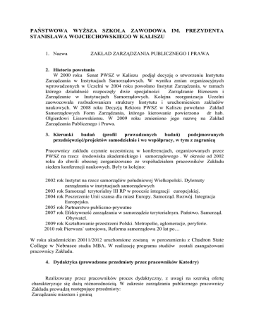 PAŃSTWOWA WYŻSZA SZKOŁA ZAWODOWA IM. PREZYDENTA STANISŁAWA WOJCIECHOWSKIEGO W KALISZU 1. Nazwa ZAKŁAD ZARZĄDZANIA PUBLICZNEGO I PRAWA 2. Historia powstania W 2000 roku Senat PWSZ w Kaliszu podjął decyzję o utworzeniu Instytutu Zarządzania w Instytucjach Samorządowych. W wyniku zmian organizacyjnych wprowadzonych w Uczelni w 2004 roku powołano Instytut Zarządzania, w ramach którego działalność rozpoczęły dwie specjalności Zarządzanie Biznesem i Zarządzanie w Instytucjach Samorządowych. Kolejna reorganizacja Uczelni zaowocowała rozbudowaniem struktury Instytutu i uruchomieniem zakładów naukowych. W 2008 roku Decyzją Rektora PWSZ w Kaliszu powołano Zakład Samorządowych Form Zarządzania, którego kierowanie powierzono dr hab. Olgierdowi Lissowskiemu. W 2009 roku zmieniono jego nazwę na Zakład Zarządzania Publicznego i Prawa. 3. Kierunki badań (profil prowadzonych badań) podejmowanych przedsięwzięć/projektów samodzielnie i we współpracy, w tym z zagranicą Pracownicy zakładu czynnie uczestniczą w konferencjach, organizowanych przez PWSZ na rzecz środowiska akademickiego i samorządowego . W okresie od 2002 roku do chwili obecnej zorganizowano ze współudziałem pracowników Zakładu siedem konferencji naukowych. Były to kolejno: 2002 rok Instytut na rzecz samorządów południowej Wielkopolski. Dylematy zarządzania w instytucjach samorządowych 2003 rok Samorząd terytorialny III RP w procesie integracji europejskiej. 2004 rok Poszerzenie Unii szansa dla miast Europy. Samorząd. Rozwój. Integracja Europejska. 2005 rok Partnerstwo publiczno-prywatne 2007 rok Efektywność zarządzania w samorządzie terytorialnym. Państwo. Samorząd. Obywatel. 2009 rok Kształtowanie przestrzeni Polski. Metropolie, aglomeracje, peryferie. 2010 rok Pierwsza` ustrojowa, Reforma samorządowa 20 lat po… W roku akademickim 20011/2012 uruchomione zostaną w porozumieniu z Chadron State College w Nebrasce studia MBA. W realizację programu studiów zostali zaangażowani pracownicy Zakładu. 4. Dydaktyka (prowadzone przedmioty przez pracowników Katedry) Realizowany przez pracowników proces dydaktyczny, z uwagi na szeroką ofertę charakteryzuje się dużą różnorodnością. W zakresie zarządzania publicznego pracownicy Zakładu prowadzą następujące przedmioty: Zarządzanie miastem i gminą Zarządzanie przedsiębiorstwem komunalnym Zarządzanie biurem samorządowym Praktyczne aspekty funkcjonowania władzy lokalnej i regionalnej 5.Skład osobowy Zakładu (imię, nazwisko i tytuł) dr hab. Olgierd Lissowski- kierownik Zakładu dr Andrzej Kwiatkowski dr Zbyszko Szmaj dr Marek Urbaniak dr Beata Wenerska dr Janusz Zawadzki mgr Olga Czekalska-Kubisiak mgr Bogdan Derwich mgr Izabela Rącka mgr Waldemar Wilczyński mgr Michał Włodarek mgr Marzena Ziółkowska 6.Publikacje pracowników Zakładu Kierownik Zakładu dr hab. Olgierd Lissowski 1. Zarządzanie publiczne i zamówienia publiczne. Wyd. CONTACT, Poznań 2009. 2. red.nauk.,Partnerstwo publiczno- prywatne w zarządzaniu publicznym, wyd.PWSZ, Kalisz 2010 3. Przedsiębiorstwo w obrocie międzynarodowym. Materiały pomocnicze do studiowania przedmiotu. Wyd. Politechniki Poznańskiej, 2010. 4. Prawo cywilne, gospodarcze i handlowe. Materiały pomocnicze do studiowania przedmiotu. Wyd. politechniki Poznańskiej 2010. Dr Lechosław Cichowski 1. Małe i średnie przedsiębiorstwa a innowacje (w:) Małe i średnie przedsiębiorstwa, Szkice o współczesnej przedsiębiorczości, red.nauk. T.Łuczka, Wyd. Politechniki Poznańskiej , Poznań 2007. 2. Rola funduszy strukturalnych w finansowaniu strukturalnych w finansowaniu innowacji polskich przedsiębiorstw(w: ) Zeszyty Naukowe PP Organizacja i Zarządzanie nr 48 , Poznań 2007. 3. Determinanty innowacyjności polskich małych przedsiębiorstw(w: ) Zarządzanie organizacjami w warunkach konkurencyjnej gospodarki, red. nauk. S. Lachniewicz, A.Zakrzewska-Bielawska, Monografie Politechniki Łódzkiej, Łódź 2009. 4. Istota i modele innowacji( w: ) Analiza sytuacji Wielkopolski w kontekście transformacji wiedzy w sieciach gospodarczych red.nauk. M.Wyrwicka, Wyd. Politechniki Poznańskiej, Poznań 2010. 5. Zarządzanie innowacjami (w: ) Zarządzanie wiedzą i innowacjami we współczesnych organizacjach, red nauk S.Lachniewicz, A.Zakrzewska-Bielawska, Monografie Politechniki Łódzkiej, Łódź 2010. 6. Partnerstwo publiczno-prywatne w zakresie wspierania przedsiębiorczości i innowacyjności w Polsce (w: ) Partnerstwo publiczno- prywatne w zarządzaniu publicznym, red.nauk. O.Lissowski wyd.PWSZ, Kalisz 2010 Dr Andrzej Kwiatkowski 1. Przekształcanie zadań z zakresu bezpieczeństwa i porządku publicznego (w: ) Partnerstwo publiczno- prywatne w zarządzaniu publicznym, red.nauk. O.Lissowski wyd.PWSZ, Kalisz 2010 Mgr Izabela Rącka 1. Identyfikacja czynników wpływających na wartość nieruchomości na podstawie analizy kaliskiego rynku gruntów niezabudowanych o przeznaczeniu mieszkaniowym jednorodzinnym (w: ) Problemy społeczno-gospodarcze w podregionie kaliskim, red nauk. H. Mizgajska, wyd. PWSZ , Kalisz 2010. 2. Potrzeba określenia wartości nieruchomości wobec wybranych aspektów zrównoważonego rozwoju miasta (w:) Współczesne zarządzanie organizacją. Determinanty koncepcji zrównoważonego rozwoju, red nauk. P. Bartkowiak, wyd. PWSZ ,Kalisz 2010. 3. Oznaki kryzysu na rynku nieruchomości mieszkaniowych na przykładzie wybranych miast Wielkopolski (w: ) Rynek nieruchomości gminnych w czasie kryzysu i po kryzysie, red. nauk M.Nowak, T.Skotarczak, Wyd. CEDEWU, 2010. Dr inż. Zbyszko Szmaj 1.Funkcjonowanie organu wykonawczego samorządu gminnego w aspekcie kolegialnym i jednoosobowym w opinii wójtów i burmistrzów. (w:) Efektywność zarządzania w samorządzie terytorialnym, red.nauk. S.Kowal, B.Wenerska, Wyd. PWSZ, Zeszyt Naukowy nr 13. Kalisz 2008. 2. Ostrzeszów jako gmina peryferyjna aglomeracji kalisko-ostrowskiej. (w:) Kształtowanie przestrzeni Pol