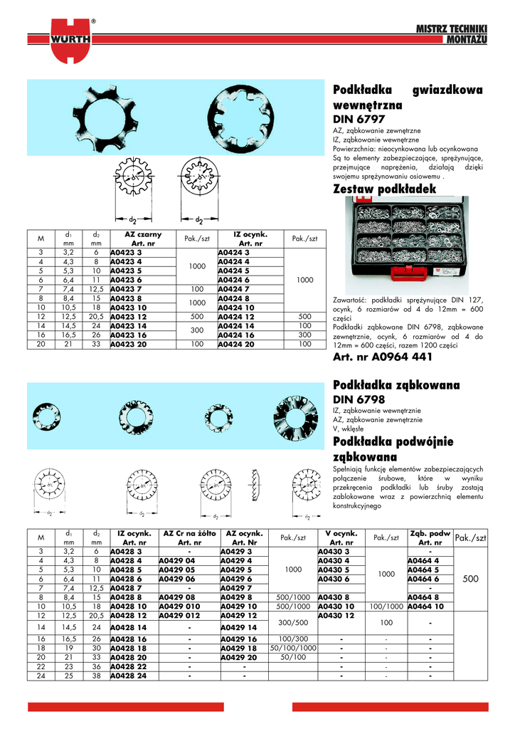 Podkładka gwiazdkowa wewnętrzna DIN 6797 AZ, ząbkowanie zewnętrzne IZ, ząbkowanie wewnętrzne Powierzchnia: nieocynkowana lub ocynkowana Są to elementy zabezpieczające, sprężynujące, przejmujące naprężenia, działają dzięki swojemu sprężynowaniu osiowemu . Zestaw podkładek M 3 4 5 6 7 8 10 12 14 16 20 d1 mm 3,2 4,3 5,3 6,4 7,4 8,4 10,5 12,5 14,5 16,5 21 d2 mm 6 8 10 11 12,5 15 18 20,5 24 26 33 AZ czarny Art. nr A0423 3 A0423 4 A0423 5 A0423 6 A0423 7 A0423 8 A0423 10 A0423 12 A0423 14 A0423 16 A0423 20 Pak./szt 1000 100 1000 500 300 100 IZ ocynk. Art. nr A0424 3 A0424 4 A0424 5 A0424 6 A0424 7 A0424 8 A0424 10 A0424 12 A0424 14 A0424 16 A0424 20 Pak./szt 1000 500 100 300 100 Zawartość: podkładki sprężynujące DIN 127, ocynk, 6 rozmiarów od 4 do 12mm = 600 części Podkładki ząbkowane DIN 6798, ząbkowane zewnętrznie, ocynk, 6 rozmiarów od 4 do 12mm = 600 części, razem 1200 części Art. nr A0964 441 Podkładka ząbkowana DIN 6798 IZ, ząbkowanie wewnętrznie AZ, ząbkowanie zewnętrznie V, wklęsłe Podkładka podwójnie ząbkowana Spełniają funkcję elementów zabezpieczających połączenie śrubowe, które w wyniku przekręcenia podkładki lub śruby zostają zablokowane wraz z powierzchnią elementu konstrukcyjnego 3 4 5 6 7 8 10 12 d1 mm 3,2 4,3 5,3 6,4 7,4 8,4 10,5 12,5 d2 mm 6 8 10 11 12,5 15 18 20,5 14 14,5 24 A0428 14 - A0429 14 16 18 20 22 24 16,5 19 21 23 25 26 30 33 36 38 A0428 A0428 A0428 A0428 A0428 - A0429 16 A0429 18 A0429 20 - M IZ ocynk. Art. nr A0428 3 A0428 4 A0428 5 A0428 6 A0428 7 A0428 8 A0428 10 A0428 12 16 18 20 22 24 AZ Cr na żółto Art. nr A0429 04 A0429 05 A0429 06 A0429 08 A0429 010 A0429 012 AZ ocynk. Art. Nr A0429 3 A0429 4 A0429 5 A0429 6 A0429 7 A0429 8 A0429 10 A0429 12 Pak./szt 1000 500/1000 500/1000 300/500 100/300 50/100/1000 50/100 V ocynk. Art. nr A0430 3 A0430 4 A0430 5 A0430 6 A0430 8 A0430 10 A0430 12 - Ząb. podw Art. nr A0464 4 A0464 5 1000 A0464 6 A0464 8 100/1000 A0464 10 Pak./szt 100 - - - Pak./szt 500