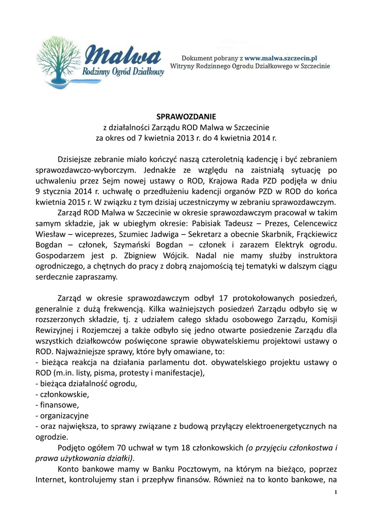 SPRAWOZDANIE z działalności Zarządu ROD Malwa w Szczecinie za okres od 7 kwietnia 2013 r. do 4 kwietnia 2014 r. Dzisiejsze zebranie miało kończyć naszą czteroletnią kadencję i być zebraniem sprawozdawczo-wyborczym. Jednakże ze względu na zaistniałą sytuację po uchwaleniu przez Sejm nowej ustawy o ROD, Krajowa Rada PZD podjęła w dniu 9 stycznia 2014 r. uchwałę o przedłużeniu kadencji organów PZD w ROD do końca kwietnia 2015 r. W związku z tym dzisiaj uczestniczymy w zebraniu sprawozdawczym. Zarząd ROD Malwa w Szczecinie w okresie sprawozdawczym pracował w takim samym składzie, jak w ubiegłym okresie: Pabisiak Tadeusz – Prezes, Celencewicz Wiesław – wiceprezes, Szumiec Jadwiga – Sekretarz a obecnie Skarbnik, Frąckiewicz Bogdan – członek, Szymański Bogdan – członek i zarazem Elektryk ogrodu. Gospodarzem jest p. Zbigniew Wójcik. Nadal nie mamy służby instruktora ogrodniczego, a chętnych do pracy z dobrą znajomością tej tematyki w dalszym ciągu serdecznie zapraszamy. Zarząd w okresie sprawozdawczym odbył 17 protokołowanych posiedzeń, generalnie z dużą frekwencją. Kilka ważniejszych posiedzeń Zarządu odbyło się w rozszerzonych składzie, tj. z udziałem całego składu osobowego Zarządu, Komisji Rewizyjnej i Rozjemczej a także odbyło się jedno otwarte posiedzenie Zarządu dla wszystkich działkowców poświęcone sprawie obywatelskiemu projektowi ustawy o ROD. Najważniejsze sprawy, które były omawiane, to: - bieżąca reakcja na działania parlamentu dot. obywatelskiego projektu ustawy o ROD (m.in. listy, pisma, protesty i manifestacje), - bieżąca działalność ogrodu, - członkowskie, - finansowe, - organizacyjne - oraz największa, to sprawy związane z budową przyłączy elektroenergetycznych na ogrodzie. Podjęto ogółem 70 uchwał w tym 18 członkowskich (o przyjęciu członkostwa i prawa użytkowania działki). Konto bankowe mamy w Banku Pocztowym, na którym na bieżąco, poprzez Internet, kontrolujemy stan i przepływ finansów. Również na to konto bankowe, na 1 każdej poczcie, możemy dokonywać bezpłatnie należnych opłat na rzecz ogrodu. Na koncie podstawowym trzymane są niezbędne środki finansowe a pozostałe środki finansowe na koncie oprocentowanym i lokatach terminowych. Prosimy, aby jeszcze w większym stopniu regulować należności na rzecz ogrodu wpłacając na konto bankowe. Dla naszego bezpieczeństwa jest to lepsze, niż noszenie pieniędzy (nieraz znacznych sum) do banku. Dlatego wpłaty mogą być realizowane we wszystkich Urzędach Pocztowych, bezpłatnie na nasze konto. Zgodnie z preliminarzem finansowym w ub.r. dokonaliśmy niezbędnych zakupów, nie przekraczając zaplanowanych kosztów. Ze względu na zniszczenie lub awarię, musieliśmy zdjąć ze stanu drukarkę atramentową i kosiarkę spalinową, gdyż koszty ich naprawy były prawie równe zakupu nowego sprzętu. W związku z tym zakupiliśmy drukarkę a w tym roku zamierzamy zakupić w miejsce kosiarki – dobrą kosę spalinową. Zakupiliśmy też program komputerowy do pełnej obsługi ogrodu i od tego roku będziemy m.in. prowadzić księgowość elektroniczną, a także pozostałe sprawy ogrodowe. Za Państwa zgodą, chcielibyśmy też (do dyskusji) zakupić nowe lekkie zadaszenie placu działkowca, bo obecne (bardzo ciężkie) już się zużyło. Sprawozdanie finansowe za 2013 rok przedstawi Skarbnik Zarządu, p. J. Szumiec. Opłaty za działki – elementem normalnego funkcjonowania ogrodu jest terminowe opłacanie składek za użytkowanie działek. W u.br. ostatnie 4 wpłaty za działkę dokonane zostały w sierpniu (do 19 sierpnia). Uważamy to za duży postęp. Ostatniego sierpnia 2013 r. tradycyjnie zorganizowaliśmy coroczny Dzień Działkowca, na którym podsumowaliśmy działalność ogrodu. Rozstrzygnięto Konkurs na Najładniejszą działkę 2013 r., czego efektem jest m. in. to, że nasze działki, poprzez ich modernizację i dbałość o nie, są coraz ładniejsze. I o to m.in. nam chodziło. Rozstrzygnięto także II konkurs fotograficzny ZDJĘCIE Roku 2013 ROD Malwa, który cieszył się już dużym zainteresowaniem. Laureatom ww. konkursów zostały wręczone stosowne nagrody rzeczowe, no i oczywiście, są oni przedstawieni na naszej stronie internetowej a także wywieszone w biurze SM BRYZA! Dalej chcielibyśmy (przy Państwa akceptacji) w podobny sposób te nasze coroczne święto zorganizować. W tym roku chcemy trochę zmienić formę konkursów i zaproponować w miejsce Konkursu na Najładniejszą Działkę nowy konkurs pt.: 1. CIEKAWOSTKA DZIAŁKOWA na ROD MALWA w 2014 roku oraz 2. Konkurs na ZDJĘCIE Roku 2014 ROD Malwa Serdecznie zapraszamy do udziału w tych corocznych konkursach. Modernizacja naszych działek to zadanie na lata, powinniśmy zadbać o 2 estetykę naszych działek jak i naszego ogrodu. Generalnie wyglądamy dobrze, wspólnie powinniśmy dbać dalej o wygląd nie tylko naszych działek, z ogrodzeniem włącznie, ale i alejek. Dobrze byłoby, gdyby były one obsiane trawą i sukcesywnie koszone, bo zgodnie z regulaminem każdy działkowiec zobowiązany jest do dbałości o przylegającą do działki alejkę. W tej sprawie jeszcze trochę mamy do zrobienia. Przypominamy ponownie, że alejka nie jest miejscem nasadzeń roślin czy krzewów – alejka ma być przejezdna i bezpieczna. Zakazane jest m.in. palenie na nich jakichkolwiek ognisk (zresztą na całym ogrodzie). Będziemy zwracać na to uwagę. Już dziś apelujemy o usunięcie z alejek wszelkich nasadzeń. Zaniedbane działki, a jest ich jeszcze trochę, będą w bieżącym roku „pod szczególną opieką” Zarządu ogrodu. Informuję, że posiadamy stosowną literaturę, m.in. „Vademecum działkowca” z ponad 50 różnych projektów zagospodarowania działek w ROD”, w biurze ogrodu każdy chętny może wypożyczyć literaturę fachową – książki, broszury, biuletyny związkowe oraz czasopismo Działkowiec, warto z t