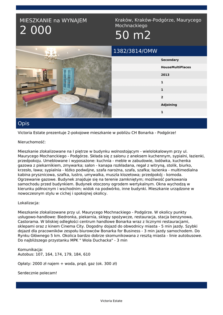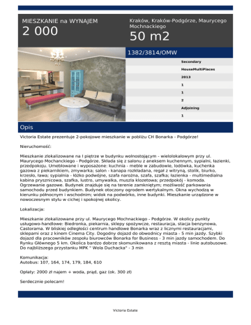 MIESZKANIE na WYNAJEM 2 000 Kraków, Kraków-Podgórze, Maurycego Mochnackiego 50 m2 1382/3814/OMW Secondary HouseMultiPlaces 2013 1 1 2 Adjoining 1 Opis Victoria Estate prezentuje 2-pokojowe mieszkanie w pobliżu CH Bonarka - Podgórze! Nieruchomość: Mieszkanie zlokalizowane na I piętrze w budynku wolnostojącym - wielolokalowym przy ul. Maurycego Mochanckiego - Podgórze. Składa się z salonu z aneksem kuchennym, sypialni, łazienki, przedpokoju. Umeblowane i wyposażone: kuchnia - meble w zabudowie, lodówka, kuchenka gazowa z piekarnikiem, zmywarka; salon - kanapa rozkładana, regał z witryną, stolik, biurko, krzesło, ława; sypialnia - łóżko podwójne, szafa narożna, szafa, szafka; łazienka - multimedialna kabina prysznicowa, szafka, lustro, umywalka, muszla klozetowa; przedpokój - komoda. Ogrzewanie gazowe. Budynek znajduje się na terenie zamkniętym; możliwość parkowania samochodu przed budynkiem. Budynek otoczony ogrodem wertykalnym. Okna wychodzą w kierunku północnym i wschodnim; widok na podwórko, inne budynki. Mieszkanie urządzone w nowoczesnym stylu w cichej i spokojnej okolicy. Lokalizacja: Mieszkanie zlokalizowane przy ul. Maurycego Mochnackiego - Podgórze. W okolicy punkty usługowo-handlowe: Biedronka, piekarnia, sklepy spożywcze, restauracja, stacja benzynowa, Castorama. W bliskiej odległości centrum handlowe Bonarka wraz z licznymi restauracjami, sklepami oraz z kinem Cinema City. Dogodny dojazd do obwodnicy miasta - 5 min jazdy. Szybki dojazd dla pracowników zespołu biurowców Bonarka for Business - 3 min jazdy samochodem. Do Rynku Głównego 5 km. Okolica bardzo dobrze skomunikowana z resztą miasta - linie autobusowe. Do najbliższego przystanku MPK " Wola Duchacka" - 3 min Komunikacja: Autobus: 107, 164, 174, 179, 184, 610 Opłaty: 2000 zł najem + woda, prąd, gaz (ok. 300 zł) Serdecznie polecam! Victoria Estate Małgorzata Wicha tel. +48 511 560 721 email: [email protected] Victoria Estate Powered by TCPDF (www.tcpdf.org)