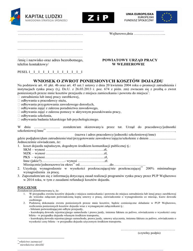 kZ i Pk ___________________________________________________________________________________________________________________________________________________________________________________________________________ ………………………………………….…… Wejherowo,dnia ……………………... ………………………………………………. ………………………………………………. ………………………………………………. /imię i nazwisko oraz adres bezrobotnego, telefon kontaktowy/ POWIATOWY URZĄD PRACY W WEJHEROWIE PESEL I__I__I__I__I__I__I__I__I__I__I__I WNIOSEK O ZWROT PONIESIONYCH KOSZTÓW DOJAZDU Na podstawie art. 41 pkt. 4b oraz art. 45 ust.1 ustawy z dnia 20 kwietnia 2004 roku o promocji zatrudnienia i instytucjach rynku pracy (t.j. Dz.U. z 26.03.2013 r. poz. 674 z późn. zm) zwracam się z prośbą o zwrot poniesionych przeze mnie kosztów przejazdu z miejsca zamieszkania i powrotu do miejsca∗: zatrudnienia lub innej pracy zarobkowej, odbywania u pracodawcy stażu, odbywania przygotowania zawodowego dorosłych, odbywania zajęć z zakresu poradnictwa zawodowego, odbywania zajęć z zakresu pomocy w aktywnym poszukiwaniu pracy, odbywania szkolenia, odbywania badania lekarskiego lub psychologicznego. W dniu …………………. zostałem/am skierowany/a przez tut. Urząd do pracodawcy/jednostki szkoleniowej/inne** ………………………………………………………………………………………………, (nazwa i adres pracodawcy/jednostki szkoleniowej/inne) gdzie podjąłem/ęłam zatrudnienie/staż/przygotowanie zawodowe/zajęcia/szkolenie z dniem ……….................. Jednocześnie oświadczam, że: 1. koszt dojazdu najtańszym, dogodnym środkiem komunikacji publicznej tj.: SKM – wynosi ………………………………………….zł, MZK – wynosi ………………………………………….zł, PKS – wynosi…………………………………...............zł, Inne (jakie?)………………..- wynosi …………………..zł. Miesięcznie/jednorazowo/za okres** od……………………..do……………………… 2. Uzyskuję wynagrodzenie w wysokości przekraczającej/nie przekraczającej** 200% minimalnego wynagrodzenia za pracę. 3. Zapoznałem/am się z informacją dotyczącą zasad realizacji programów rynku pracy przez PUP Wejherowo w 2014 roku, w tym z zasadami refundacji kosztów dojazdu. POUCZENIE Zostałem/am poinformowany/a, że: 1. W przypadku zwrotu kosztów dojazdu z miejsca zamieszkania i powrotu do miejsca zatrudnienia lub innej pracy zarobkowej do wniosku załączam poświadczoną kopię umowy o pracę, zaświadczenie o wynagrodzeniu co miesiąc, ksero dowodu osobistego 2. Podstawą dokonania zwrotu poniesionych przeze mnie kosztów, będzie comiesięczne składanie w PUP Wejherowo, rozliczenia poniesionych kosztów dojazdu wraz z wymaganymi załącznikami tj.: - biletami potwierdzającymi odbyte przejazdy, - kserokopią dowodu rejestracyjnego samochodu i prawa jazdy, imienna faktura za paliwo, oświadczenie o wysokości ceny biletu - w przypadku dojazdu własnym środkiem transportu, - kserokopią dowodu rejestracyjnego samochodu, prawa jazdy, umowy użyczenia, imienna faktura za paliwo, oświadczenie o wysokości ceny biletu - w przypadku dojazdu użyczonym środkiem transportu. …………………………………… (czytelny podpis) ∗ właściwe zaznaczyć niewłaściwe skreślić ** __________________________________________________________________________________________________________________________________________________________________________________________________________