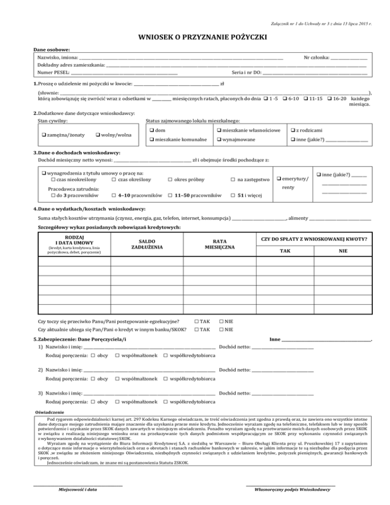Załącznik nr 1 do Uchwały nr 3 z dnia 13 lipca 2015 r. WNIOSEK O PRZYZNANIE POŻYCZKI Dane osobowe: Nazwisko, imiona: _________________________________________________________________________________________________________ Nr członka: ___________________ Dokładny adres zamieszkania: ______________________________________________________________________________________________________________________________________ Numer PESEL: _______________________________________________________ Seria i nr DO: ______________________________________________________ 1. Proszę o udzielenie mi pożyczki w kwocie: ____________________________________________ zł (słownie: _______________________________________________________________________________________________________________________________________________________________), którą zobowiązuję się zwrócić wraz z odsetkami w __________ miesięcznych ratach, płaconych do dnia 1 -5 6-10 11-15 16-20 każdego . miesiąca. 2. Dodatkowe dane dotyczące wnioskodawcy: Stan cywilny: Status zajmowanego lokalu mieszkalnego: zamężna/żonaty wolny/wolna dom mieszkanie własnościowe z rodzicami mieszkanie komunalne wynajmowane inne (jakie?) ______________________ 3. Dane o dochodach wnioskodawcy: Dochód miesięczny netto wynosi: ________________________________________ zł i obejmuje środki pochodzące z: wynagrodzenia z tytułu umowy o pracę na: □ czas nieokreślony □ czas określony Pracodawca zatrudnia: □ do 3 pracowników □ okres próbny □ na zastępstwo emerytury/ renty □ 4–10 pracowników □ 11–50 pracowników □ 51 i więcej inne (jakie?) ________ _______________________ _______________________ 4. Dane o wydatkach/kosztach wnioskodawcy: Suma stałych kosztów utrzymania (czynsz, energia, gaz, telefon, internet, konsumpcja) ____________________________, alimenty ________________________________ Szczegółowy wykaz posiadanych zobowiązań kredytowych: RODZAJ I DATA UMOWY (kredyt, karta kredytowa, linia pożyczkowa, debet, poręczenie) SALDO ZADŁUŻENIA Czy toczy się przeciwko Panu/Pani postępowanie egzekucyjne? Czy aktualnie ubiega się Pan/Pani o kredyt w innym banku/SKOK? RATA MIESIĘCZNA □ TAK □ TAK 5. Zabezpieczenie: Dane Poręczyciela/i CZY DO SPŁATY Z WNIOSKOWANEJ KWOTY? TAK NIE □ NIE □ NIE Inne ______________________________________________. 1) Nazwisko i imię: ____________________________________________________________________ Dochód netto: ________________________________ Rodzaj poręczenia: □ obcy □ współmałżonek □ współkredytobiorca 2) Nazwisko i imię: ____________________________________________________________________ Dochód netto: ________________________________ Rodzaj poręczenia: □ obcy □ współmałżonek □ współkredytobiorca 3) Nazwisko i imię: ____________________________________________________________________ Dochód netto: ________________________________ Rodzaj poręczenia: □ obcy □ współmałżonek □ współkredytobiorca Oświadczenie Pod rygorem odpowiedzialności karnej art. 297 Kodeksu Karnego oświadczam, że treść oświadczenia jest zgodna z prawdą oraz, że zawiera ono wszystkie istotne dane dotyczące mojego zatrudnienia mające znaczenie dla uzyskania przeze mnie kredytu. Jednocześnie wyrażam zgodę na telefoniczne, telefaksem lub w inny sposób potwierdzenie i uzyskanie przez SKOK danych zawartych w niniejszym oświadczeniu. Ponadto wyrażam zgodę na przetwarzanie moich danych osobowych przez SKOK w związku z realizacją niniejszego wniosku oraz na przekazywanie tych danych podmiotom współpracującym ze SKOK przy wykonaniu czynności związanych z wykonywaniem działalności statutowej SKOK. Wyrażam zgodę na wystąpienie do Biura Informacji Kredytowej S.A. z siedzibą w Warszawie – Biuro Obsługi Klienta przy ul. Pruszkowskiej 17 z zapytaniem o dotyczące mnie informacje o wierzytelnościach oraz o obrotach i stanach rachunków bankowych w zakresie, w jakim informacje te są niezbędne dla podjęcia przez SKOK ,w związku ze złożeniem niniejszego Oświadczenia, niezbędnych czynności związanych z udzielaniem kredytów, pożyczek pieniężnych, gwarancji bankowych i poręczeń. Jednocześnie oświadczam, że znane mi są postanowienia Statutu ZSKOK. ______________________________________________ Miejscowość i data ______________________________________________ Własnoręczny podpis Wnioskodawcy Załącznik nr 1 do Uchwały nr 3 z dnia 13 lipca 2015 r. CZĘŚĆ A: Wstępna ocena zdolności kredytowej Rodzaj pożyczki: ....................... Status klienta: ........................... Dochód netto: .................................. Okres kredytowania: .......................... miesięcy Rata pożyczki: ................................... Dochód netto współkredytobiorcy: ... ................................. Razem: ....................................... Miesięczne raty pożyczek: ..................... + ................... + ....................... + .......................... + ....................... Razem: ....................................... 5% wartości kart kred.: ........................... Razem: ....................................... 15% miesięcznych rat poręczanych: ........................ Kwota bazowa/stałe koszty: ............................................ Kwota po pomniejszeniu zobowiązań: ........................................... ........................................................................................ Data i podpis pracownika oddziału CZĘŚĆ B: Wykaz zadłużeń w BIK SA: Ocena scoringowa: ………………..….. Ilość i kwota zapytań (ost. 3 m-ce)………………………………… Historia: ……………………….………. 1. …................................................................................................................................................…………………………………………………………………..………