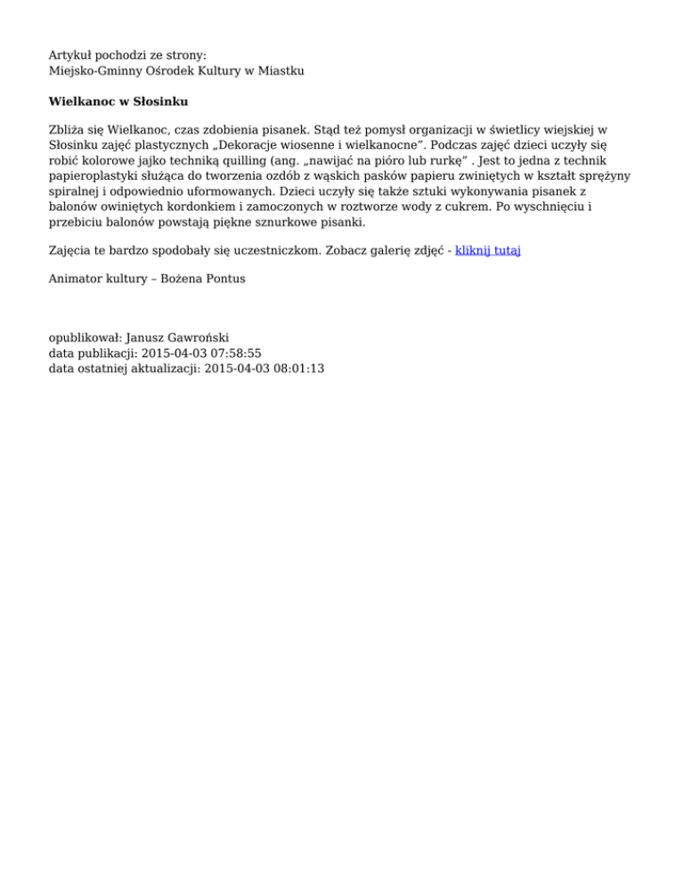 Artykuł pochodzi ze strony: Miejsko-Gminny Ośrodek Kultury w Miastku Wielkanoc w Słosinku Zbliża się Wielkanoc, czas zdobienia pisanek. Stąd też pomysł organizacji w świetlicy wiejskiej w Słosinku zajęć plastycznych „Dekoracje wiosenne i wielkanocne”. Podczas zajęć dzieci uczyły się robić kolorowe jajko techniką quilling (ang. „nawijać na pióro lub rurkę” . Jest to jedna z technik papieroplastyki służąca do tworzenia ozdób z wąskich pasków papieru zwiniętych w kształt sprężyny spiralnej i odpowiednio uformowanych. Dzieci uczyły się także sztuki wykonywania pisanek z balonów owiniętych kordonkiem i zamoczonych w roztworze wody z cukrem. Po wyschnięciu i przebiciu balonów powstają piękne sznurkowe pisanki. Zajęcia te bardzo spodobały się uczestniczkom. Zobacz galerię zdjęć - kliknij tutaj Animator kultury – Bożena Pontus opublikował: Janusz Gawroński data publikacji: 2015-04-03 07:58:55 data ostatniej aktualizacji: 2015-04-03 08:01:13