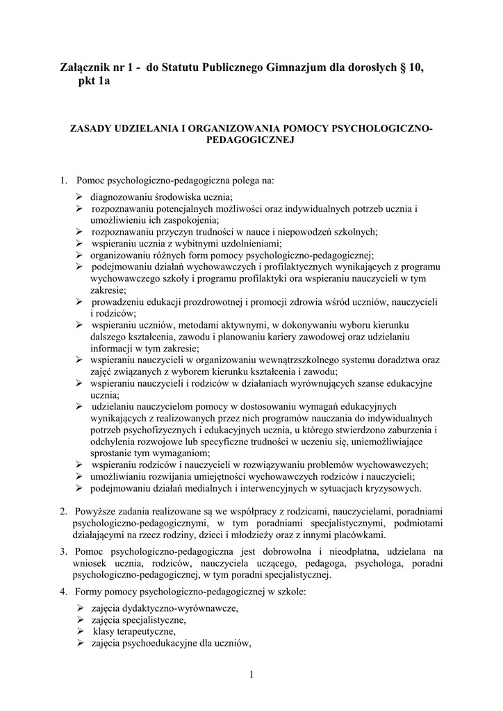Załącznik nr 1 - do Statutu Publicznego Gimnazjum dla dorosłych § 10, pkt 1a ZASADY UDZIELANIA I ORGANIZOWANIA POMOCY PSYCHOLOGICZNOPEDAGOGICZNEJ 1. Pomoc psychologiczno-pedagogiczna polega na: diagnozowaniu środowiska ucznia; rozpoznawaniu potencjalnych możliwości oraz indywidualnych potrzeb ucznia i umożliwieniu ich zaspokojenia; rozpoznawaniu przyczyn trudności w nauce i niepowodzeń szkolnych; wspieraniu ucznia z wybitnymi uzdolnieniami; organizowaniu różnych form pomocy psychologiczno-pedagogicznej; podejmowaniu działań wychowawczych i profilaktycznych wynikających z programu wychowawczego szkoły i programu profilaktyki ora wspieraniu nauczycieli w tym zakresie; prowadzeniu edukacji prozdrowotnej i promocji zdrowia wśród uczniów, nauczycieli i rodziców; wspieraniu uczniów, metodami aktywnymi, w dokonywaniu wyboru kierunku dalszego kształcenia, zawodu i planowaniu kariery zawodowej oraz udzielaniu informacji w tym zakresie; wspieraniu nauczycieli w organizowaniu wewnątrzszkolnego systemu doradztwa oraz zajęć związanych z wyborem kierunku kształcenia i zawodu; wspieraniu nauczycieli i rodziców w działaniach wyrównujących szanse edukacyjne ucznia; udzielaniu nauczycielom pomocy w dostosowaniu wymagań edukacyjnych wynikających z realizowanych przez nich programów nauczania do indywidualnych potrzeb psychofizycznych i edukacyjnych ucznia, u którego stwierdzono zaburzenia i odchylenia rozwojowe lub specyficzne trudności w uczeniu się, uniemożliwiające sprostanie tym wymaganiom; wspieraniu rodziców i nauczycieli w rozwiązywaniu problemów wychowawczych; umożliwianiu rozwijania umiejętności wychowawczych rodziców i nauczycieli; podejmowaniu działań medialnych i interwencyjnych w sytuacjach kryzysowych. 2. Powyższe zadania realizowane są we współpracy z rodzicami, nauczycielami, poradniami psychologiczno-pedagogicznymi, w tym poradniami specjalistycznymi, podmiotami działającymi na rzecz rodziny, dzieci i młodzieży oraz z innymi placówkami. 3. Pomoc psychologiczno-pedagogiczna jest dobrowolna i nieodpłatna, udzielana na wniosek ucznia, rodziców, nauczyciela uczącego, pedagoga, psychologa, poradni psychologiczno-pedagogicznej, w tym poradni specjalistycznej. 4. Formy pomocy psychologiczno-pedagogicznej w szkole: zajęcia dydaktyczno-wyrównawcze, zajęcia specjalistyczne, klasy terapeutyczne, zajęcia psychoedukacyjne dla uczniów, 1 zajęcia psychoedukacyjne dla rodziców, zajęcia związane z wyborem kierunku kształcenia i zawodu, porady dla uczniów, porady, konsultacje i warsztaty dla rodziców i nauczycieli. 5. Objęcie ucznia pomocą psychologiczno-pedagogiczną wymaga zgody rodziców. 6. Zajęcia dydaktyczno-wyrównawcze organizuje się dla uczniów, którzy mają znaczne trudności w uzyskaniu osiągnięć z zakresu określonych zajęć edukacyjnych, wynikających z podstawy programowej dla danego etapu edukacyjnego. Liczba uczestników zajęć wynosi do 8 uczniów. 7. Zajęcia specjalistyczne w tym socjoterapeutyczne organizuje się dla uczniów z dysfunkcjami i zaburzeniami utrudniającymi funkcjonowanie społeczne. Liczba uczestników zajęć wynosi od 3 do 10 uczniów. Za zgodą dyrekcji zajęcia specjalistyczne mogą być prowadzone indywidualnie. 8. Klasy terapeutyczne organizuje się dla uczniów wykazujących jednorodne lub sprzężone zaburzenia, wymagających dostosowania organizacji i procesu nauczania do ich potrzeb edukacyjnych oraz długotrwałej pomocy specjalistycznej. Nauczanie prowadzone jest według obowiązującego w szkole programu nauczania, z dostosowaniem metod i form realizacji do indywidualnych psychofizycznych i edukacyjnych potrzeb uczniów. Liczebność klasy to maksymalnie 15 uczniów. 9. Zajęcia psychoedukacyjne organizuje się w celu wspomagania wychowawczej funkcji rodziny, zapobiegania zachowaniom dysfunkcyjnym uczniów oraz wspierania ich rozwoju. 10. Zajęcia związane z wyborem kierunku kształcenia i zawodu organizuje się w celu wspomagania uczniów w podejmowaniu decyzji edukacyjnych i zawodowych, przy wykorzystaniu aktywnych metod pracy. 11. Zajęcia związane z wyborem kierunku kształcenia i zawodu prowadzą: nauczyciel, wychowawca, psycholog albo pedagog, posiadający przygotowanie do prowadzenia zajęć związanych z wyborem kierunku kształcenia i zawodu. 12. W szkole może być zatrudniony doradca zawodowy. 13. Zadania pedagoga: rozpoznawanie indywidualnych potrzeb uczniów oraz analizowanie przyczyn niepowodzeń szkolnych; określanie form i sposobów udzielania uczniom pomocy psychologicznopedagogicznej odpowiednio do rozpoznanych potrzeb; organizowanie i prowadzenie różnych form pomocy psychologiczno-pedagogicznej dla uczniów, rodziców i nauczycieli; podejmowanie działań wychowawczych i profilaktycznych wynikających z programu wychowawczego szkoły i programu profilaktyki; wspieranie działań wychowawczych i opiekuńczych nauczycieli, wynikających z programu wychowawczego szkoły i programu profilaktyki; planowanie i koordynowanie zadań realizowanych przez szkołę na rzecz uczniów kierunku kształcenia i zawodu; działanie na rzecz zorganizowania opieki i pomocy materialnej uczniom znajdującym się w trudnej sytuacji życiowej. 2 14. Zadania psychologa: prowadzenie badań i działań diagnostycznych dotyczących uczniów, w tym diagnozowanie potencjalnych możliwości oraz wspieranie mocnych stron ucznia; diagnozowanie sytuacji wychowawczych w celu wspierania rozwoju ucznia, określenia odpowiednich form pomocy psychologiczno-pedagogicznej, w tym działań profilaktycznych, mediacyjnych i interwencyjnych wobec uczniów, rodziców i nauczycieli; organizowanie i prowadzenie różnych form pomocy psychologiczno-pedagogicznej dla uczniów, rodziców i nauczycieli; zapewnianie uczniom doradztwa w zakresie wyboru kierunku kształcenia i zawodu; minimalizowanie skutków zaburzeń rozwojowych, zapobieganie zaburzeniom zachowania oraz inicjowanie różnych form pomocy wych