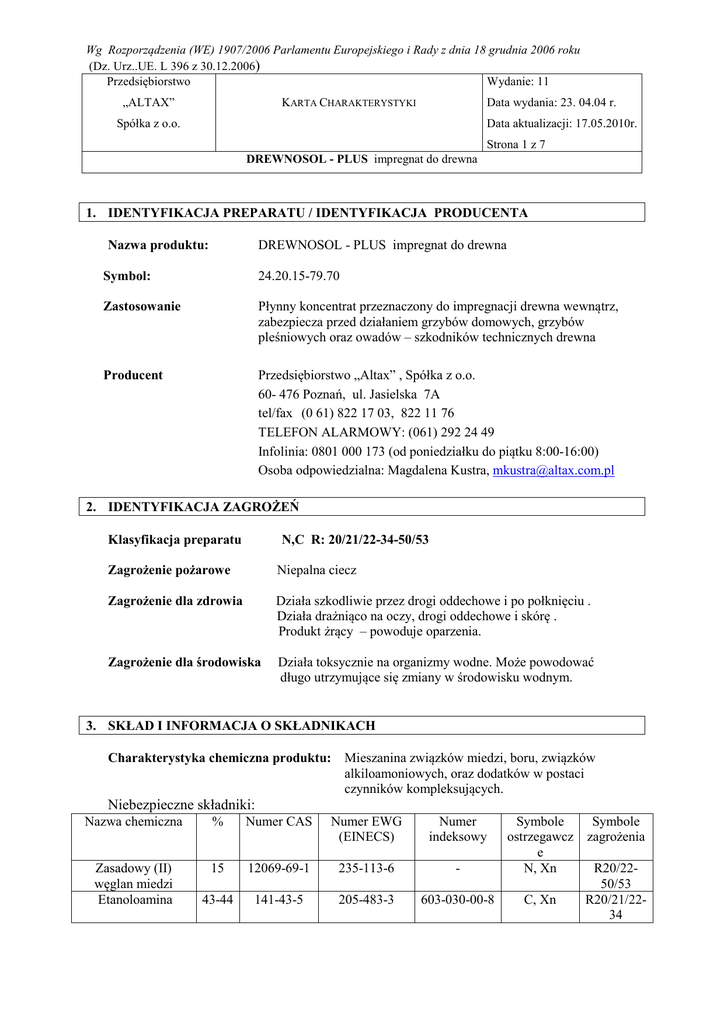 Wg Rozporządzenia (WE) 1907/2006 Parlamentu Europejskiego i Rady z dnia 18 grudnia 2006 roku (Dz. Urz..UE. L 396 z 30.12.2006) Przedsiębiorstwo Wydanie: 11 „ALTAX” KARTA CHARAKTERYSTYKI Data wydania: 23. 04.04 r. Spółka z o.o. Data aktualizacji: 17.05.2010r. Strona 1 z 7 DREWOSOL - PLUS impregnat do drewna 1. IDETYFIKACJA PREPARATU / IDETYFIKACJA PRODUCETA DREWNOSOL - PLUS impregnat do drewna azwa produktu: Symbol: 24.20.15-79.70 Zastosowanie Płynny koncentrat przeznaczony do impregnacji drewna wewnątrz, zabezpiecza przed działaniem grzybów domowych, grzybów pleśniowych oraz owadów – szkodników technicznych drewna Producent Przedsiębiorstwo „Altax” , Spółka z o.o. 60- 476 Poznań, ul. Jasielska 7A tel/fax (0 61) 822 17 03, 822 11 76 TELEFON ALARMOWY: (061) 292 24 49 Infolinia: 0801 000 173 (od poniedziałku do piątku 8:00-16:00) Osoba odpowiedzialna: Magdalena Kustra, [email protected] 2. IDETYFIKACJA ZAGROŻEŃ Klasyfikacja preparatu ,C R: 20/21/22-34-50/53 Zagrożenie pożarowe Niepalna ciecz Zagrożenie dla zdrowia Działa szkodliwie przez drogi oddechowe i po połknięciu . Działa drażniąco na oczy, drogi oddechowe i skórę . Produkt żrący – powoduje oparzenia. Zagrożenie dla środowiska Działa toksycznie na organizmy wodne. Może powodować długo utrzymujące się zmiany w środowisku wodnym. 3. SKŁAD I IFORMACJA O SKŁADIKACH Charakterystyka chemiczna produktu: Mieszanina związków miedzi, boru, związków alkiloamoniowych, oraz dodatków w postaci czynników kompleksujących. Niebezpieczne składniki: Nazwa chemiczna % Numer CAS Numer EWG (EINECS) Numer indeksowy Zasadowy (II) węglan miedzi Etanoloamina 15 12069-69-1 235-113-6 - Symbole ostrzegawcz e N, Xn 43-44 141-43-5 205-483-3 603-030-00-8 C, Xn Symbole zagrożenia R20/2250/53 R20/21/2234 Wg Rozporządzenia (WE) 1907/2006 Parlamentu Europejskiego i Rady z dnia 18 grudnia 2006 roku (Dz. Urz..UE. L 396 z 30.12.2006) Przedsiębiorstwo Wydanie: 11 „ALTAX” KARTA CHARAKTERYSTYKI Data wydania: 23. 04.04 r. Spółka z o.o. Data aktualizacji: 17.05.2010r. Strona 2 z 7 DREWOSOL - PLUS impregnat do drewna Benzylo-C12-16alkilodimetylo chlorki Kwas borowy 7 68424-85-1 270-352-2 - N, C, Xn R:21/2234-50 9 10043-35-3 233-139-2 ---- Brak Brak 4. PIERWSZA POMOC Zalecenia ogólne Natychmiast zdjąć odzież zanieczyszczoną produktem. Objawy zatrucia mogą pojawić się dopiero po kilku godzinach. Dlatego konieczna jest wizyta u lekarza w ciągu przynajmniej 48 godzin od momentu zdarzenia. Zatrucie inhalacyjne W przypadku utraty przytomności zapewnić pacjentowi pozycję boczną, bezpieczną do transportu. Skażenie skóry Skażoną skórę zmyć natychmiast wodą z dużą ilością mydła. Skażenie oczu Skażone oczy płukać dużą ilością wody oraz skonsultować się z lekarzem. Zatrucie doustne Wypłukać jamę ustną, a następnie wypić dużą ilość wody. W przypadku połknięcia nie prowokować wymiotów, natychmiast skonsultować się z lekarzem, pokazać opakowanie lub etykietę preparatu 5. POSTĘPOWAIE W PRZYPADKU POŻARU Zalecenia ogólne Brak Środki gaśnicze Produkt niepalny. Stosować środki gaśnicze odpowiednie do gaszenia palących się materiałów . Zalecenia szczegółowe Nie dopuścić do przedostania się ścieków po gaszeniu pożaru do kanalizacji i wód . Produkty spalania W środowisku pożaru mogą się wydzielać tlenki węgla, tlenki azotu, chlorowodór . Sprzęt ochronny Osoby biorące udział w gaszeniu pożaru powinny być przeszkolone, wyposażone w odzież ochronną i aparat izolujący drogi oddechowe . 6. POSTĘPOWAIE W PRZYPADKU IEZAMIERZOEGO UWOLIEIA DO ŚRODOWISKA Wg Rozporządzenia (WE) 1907/2006 Parlamentu Europejskiego i Rady z dnia 18 grudnia 2006 roku (Dz. Urz..UE. L 396 z 30.12.2006) Przedsiębiorstwo Wydanie: 11 „ALTAX” KARTA CHARAKTERYSTYKI Spółka z o.o. Data wydania: 23. 04.04 r. Data aktualizacji: 17.05.2010r. Strona 3 z 7 DREWOSOL - PLUS impregnat do drewna Środki ochrony osobistej: Stosować sprzęt ochronny. Osoby nie wyposażone w sprzęt ochronny nie powinny się zbliżać. Zabezpieczenie środowiska: Zabezpieczyć studzienki ściekowe. W przypadku skażenia wód powiadomić odpowiednie władze. Rozcieńczyć dużą ilością wody. Metody utylizacji Absorbowanie materiałami pochłaniającymi ciecze (piasek, diatomit, spoiwa kwasowe, uniwersalne, pył drzewny). Stosować środki zobojętniające. Usuwanie skażonego materiału zgodnie z przepisami (p.13). 7. POSTĘPOWAIE Z PREPARATEM I JEGO MAGAZYOWAIE Postępowanie Magazynowanie Pracować w dobrze wentylowanych pomieszczeniach. Unikać zanieczyszczenia skóry i oczu .Przestrzegać zasad higieny osobistej i stosować odzież ochronną zgodnie z informacjami zamieszczonymi w p.8 .Przestrzegać warunki stosowania określone przez producenta w Instrukcji . Przechowywać w oryginalnych , właściwie oznakowanych, szczelnie zamkniętych opakowaniach w suchych, wentylowanych, zamkniętych pomieszczeniach .Przechowywać w miejscach niedostępnych dla dzieci z dala od środków spożywczych i pasz . 8. KOTROLA ARAŻEIA I ŚRODKI OCHROY IDYWIDUALEJ Zalecenia w zakresie środków technicznych : Wentylacja ogólna pomieszczenia . Kontrola narażenia Etanoloamina - wartość dopuszczalnych stężeń NDS 3mg/m3, NDSH 10mg/m3 Środki ochrony indywidualnej Drogi oddechowe: W przypadku narażenia na wysokie stężenie mgły stosowac zatwierdzony respirator z pochłaniaczem . Ręce Rękawice ochronne powlekane . Oczy Okulary ochronne w szczelnej obudowie (gogle ) . Skóra Fartuch lub ubranie ochronne z tkaniny powlekanej . Odzież ochronna powinna być systematycznie czyszczona, sprzęt ochrony osobistej powinien być Właściwie przechowywany i konserwowany . Zalecenia higieniczne Przestrzegać podstawowe zasady higieny: nie jeść, nie pić, nie palić na stanowisku pracy . Po zakończeniu pracy zanieczyszczoną odzież wyprać przed ponownym założeniem .Natychmiast usuwać rozlany środek . Wg Ro