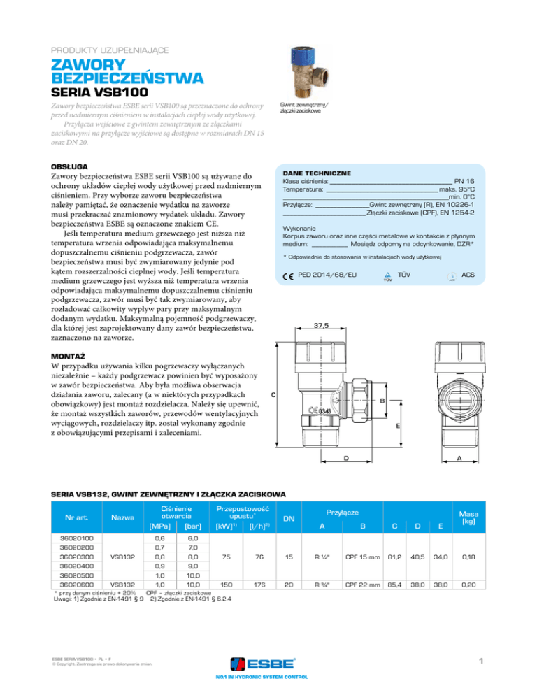 PRODUKTY UZUPEŁNIAJĄCE ZAWORY BEZPIECZEŃSTWA SERIA VSB100 Zawory bezpieczeństwa ESBE serii VSB100 są przeznaczone do ochrony przed nadmiernym ciśnieniem w instalacjach ciepłej wody użytkowej. Przyłącza wejściowe z gwintem zewnętrznym ze złączkami zaciskowymi na przyłącze wyjściowe są dostępne w rozmiarach DN 15 oraz DN 20. Gwint zewnętrzny/ złączki zaciskowe OBSŁUGA DANE TECHNICZNE Klasa ciśnienia:___________________________________ PN 16 Temperatura:________________________________ maks. 95°C ______________________________________________min. 0°C Przyłącze:________________Gwint zewnętrzny (R), EN 10226-1 _______________________ Złączki zaciskowe (CPF), EN 1254-2 Zawory bezpieczeństwa ESBE serii VSB100 są używane do ochrony układów ciepłej wody użytkowej przed nadmiernym ciśnieniem. Przy wyborze zaworu bezpieczeństwa należy pamiętać, że oznaczenie wydatku na zaworze musi przekraczać znamionowy wydatek układu. Zawory bezpieczeństwa ESBE są oznaczone znakiem CE. Jeśli temperatura medium grzewczego jest niższa niż temperatura wrzenia odpowiadająca maksymalnemu dopuszczalnemu ciśnieniu podgrzewacza, zawór bezpieczeństwa musi być zwymiarowany jedynie pod kątem rozszerzalności cieplnej wody. Jeśli temperatura medium grzewczego jest wyższa niż temperatura wrzenia odpowiadająca maksymalnemu dopuszczalnemu ciśnieniu podgrzewacza, zawór musi być tak zwymiarowany, aby rozładować całkowity wypływ pary przy maksymalnym dodanym wydatku. Maksymalną pojemność podgrzewaczy, dla której jest zaprojektowany dany zawór bezpieczeństwa, zaznaczono na zaworze. Wykonanie Korpus zaworu oraz inne części metalowe w kontakcie z płynnym medium:___________ Mosiądz odporny na odcynkowanie, DZR* * Odpowiednie do stosowania w instalacjach wody użytkowej PED 2014/68/EU TÜV ACS 37,5 MONTAŻ W przypadku używania kilku pogrzewaczy wyłączanych niezależnie – każdy podgrzewacz powinien być wyposażony w zawór bezpieczeństwa. Aby była możliwa obserwacja działania zaworu, zalecany (a w niektórych przypadkach obowiązkowy) jest montaż rozdzielacza. Należy się upewnić, że montaż wszystkich zaworów, przewodów wentylacyjnych wyciągowych, rozdzielaczy itp. został wykonany zgodnie z obowiązującymi przepisami i zaleceniami. C B E D A SERIA VSB132, GWINT ZEWNĘTRZNY I ZŁĄCZKA ZACISKOWA Nr art. Nazwa Ciśnienie otwarcia [MPa] [bar] 36020100 0,6 36020200 36020300 VSB132 36020400 36020500 36020600 VSB132 Przepustowość upustu* [l/h]2) [kW]1) DN Przyłącze A B C D E Masa [kg] 6,0 0,7 7,0 0,8 8,0 0,9 9,0 1,0 10,0 1,0 10,0 75 76 15 R ½" CPF 15 mm 81,2 40,5 34,0 0,18 150 176 20 R ¾" CPF 22 mm 85,4 38,0 38,0 0,20 * przy danym ciśnieniu + 20% CPF – złączki zaciskowe Uwagi: 1) Zgodnie z EN-1491 § 9 2) Zgodnie z EN-1491 § 6.2.4 ESBE SERIA VSB100 • PL • F © Copyright. Zastrzega się prawo dokonywania zmian. 1