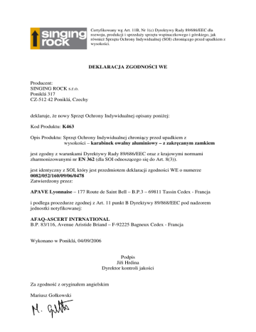 Certyfikowany wg Art. 11B, Nr 1(c) Dyrektywy Rady 89/686/EEC dla rozwoju, produkcji i sprzedaży sprzętu wspinaczkowego i górskiego, jak również Sprzętu Ochrony Indywidualnej (SOI) chroniącego przed upadkiem z wysokości. DEKLARACJA ZGODNOŚCI WE Producent: SINGING ROCK s.r.o. Poniklá 317 CZ-512 42 Poniklá, Czechy deklaruje, że nowy Sprzęt Ochrony Indywidualnej opisany poniżej: Kod Produktu: K463 Opis Produktu: Sprzęt Ochrony Indywidualnej chroniący przed upadkiem z wysokości – karabinek owalny aluminiowy – z zakręcanym zamkiem jest zgodny z warunkami Dyrektywy Rady 89/686/EEC oraz z krajowymi normami zharmonizowanymi nr EN 362 (dla SOI odnoszącego się do Art. 8(3)). jest identyczny z SOI, który jest przedmiotem deklaracji zgodności WE o numerze 0082/052/160/09/06/0478 Zatwierdzony przez: APAVE Lyonnaise – 177 Route de Saint Bell – B.P.3 – 69811 Tassin Cedex - Francja i podlega procedurze zgodnej z Art. 11 punkt B Dyrektywy 89/868/EEC pod nadzorem jednostki notyfikowanej: AFAQ-ASCERT INTRNATIONAL B.P. 83/116, Avenue Aristide Briand – F-92225 Bagneux Cedex - Francja Wykonano w Poniklá, 04/09/2006 Podpis Jiři Hrdina Dyrektor kontroli jakości Za zgodność z oryginałem angielskim Mariusz Gołkowski