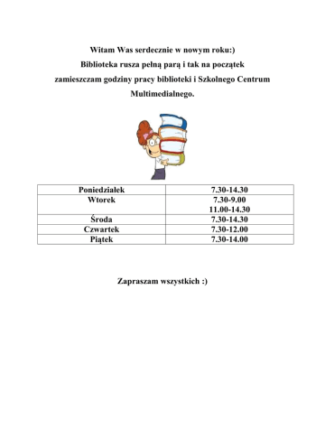 Witam Was serdecznie w nowym roku:) Biblioteka rusza pełną parą i tak na początek zamieszczam godziny pracy biblioteki i Szkolnego Centrum Multimedialnego. Poniedziałek Wtorek Środa Czwartek Piątek Zapraszam wszystkich :) 7.30-14.30 7.30-9.00 11.00-14.30 7.30-14.30 7.30-12.00 7.30-14.00