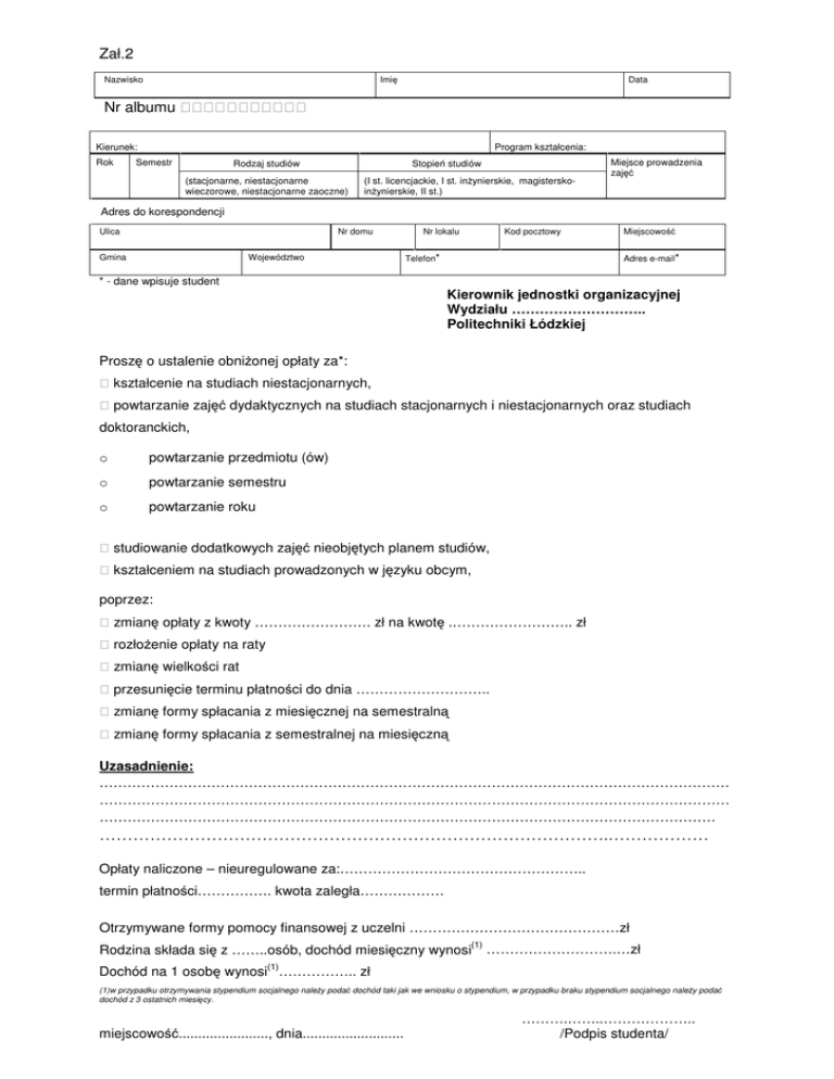 Zał.2 Nazwisko Imi Data Nr albumu Kierunek: Rok Program kształcenia: Semestr Rodzaj studiów Stopie studiów (stacjonarne, niestacjonarne wieczorowe, niestacjonarne zaoczne) (I st. licencjackie, I st. in ynierskie, magisterskoin ynierskie, II st.) Miejsce prowadzenia zaj Adres do korespondencji Ulica Nr domu Gmina Nr lokalu Kod pocztowy Telefon* Województwo * - dane wpisuje student Miejscowo Adres e-mail* Kierownik jednostki organizacyjnej Wydziału ……………………….. Politechniki Łódzkiej Prosz o ustalenie obni onej opłaty za*: kształcenie na studiach niestacjonarnych, powtarzanie zaj dydaktycznych na studiach stacjonarnych i niestacjonarnych oraz studiach doktoranckich, o powtarzanie przedmiotu (ów) o powtarzanie semestru o powtarzanie roku studiowanie dodatkowych zaj nieobj tych planem studiów, kształceniem na studiach prowadzonych w j zyku obcym, poprzez: zmian opłaty z kwoty ……………………. zł na kwot .…………………….. zł rozło enie opłaty na raty zmian wielko ci rat przesuni cie terminu płatno ci do dnia ……………………….. zmian formy spłacania z miesi cznej na semestraln zmian formy spłacania z semestralnej na miesi czn Uzasadnienie: ……………………………………………………………………………………………………………………… ……………………………………………………………………………………………………………………… …………………………………………………………………………………………………………………… ……………………………………………………………………………….……………… Opłaty naliczone – nieuregulowane za:…………………………………………….. termin płatno ci……………. kwota zaległa……………… Otrzymywane formy pomocy finansowej z uczelni ………………………………………zł (1) Rodzina składa si z ……..osób, dochód miesi czny wynosi ……………………….…zł (1) Dochód na 1 osob wynosi …………….. zł (1)w przypadku otrzymywania stypendium socjalnego nale y poda dochód taki jak we wniosku o stypendium, w przypadku braku stypendium socjalnego nale y poda dochód z 3 ostatnich miesi cy. miejscowo ......................., dnia.......................... ……….……..……………….. /Podpis studenta/ Zał.2 O wiadczam, e zapoznałem si z Zasadami ustalania obni onych opłat dla studentów za usługi edukacyjne wiadczone przez Politechnik Łódzk oraz Regulaminem Pomocy Materialnej obowi zuj cym w PŁ. …………............................ /Podpis studenta/ Opinia wła ciwej Rady Samorz du Studentów: …………………………………………………………………………………………………………… …………………………………………………………………………………………………………… …………………………………………………………………………………………………………… …………............................. /Data i podpis Przewodnicz cego Komisji/ Opinia Komisji Stypendialnej Wydziału: …………………………………………………………………………………………………………… …………………………………………………………………………………………………………… ………………………………………………………………………………………………………….. …………............................. Opinia**……………………………………………….. /Data i podpis / …………………………………………………………………………………………………………… …………………………………………………………………………………………………………… ………………………………………………………………………………………………………….. …………............................. Decyzja Kierownika jednostki organizacyjnej Wydziału: /Data i podpis / …………………………………………………………………………………………………………… …………………………………………………………………………………………………………… …………………………………………………………………………………………………………… …………………………………………………………………………………………………………… …………………………………………………………………………………………………………… …………………………………………………………………………………………………………… …………………………………………………………………………………………………………… …………………………………………………………………………………………………………… …………………………………………………………………………………………………………… ……………………………………………………………………… …………............................. /Dada i podpis / Decyzj Kierownika jednostki organizacyjnej przyj łem do wiadomo ci w dniu ………………. *-odpowiednie zakre li **-wpisa nazw organu PŁ proszonego przez Dziekana o dodatkow opini ……….……..……………….. /Data i podpis studenta/