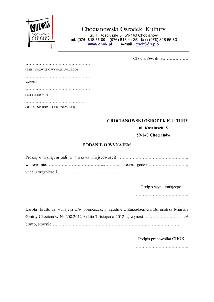 Chocianowski Ośrodek Kultury ul. T. Kościuszki 5, 59-140 Chocianów tel. (076) 818 55 80 ; (076) 818 41 35 fax: (076) 818 55 80 www.chok.pl e-mail: [email protected] Chocianów, dnia……………… ……………………………………… (IMIĘ I NAZWISKO WYNAJMUJĄCEGO) ……………………………………… (ADRES) ……………………………………… ( NR TELEFONU) …………………………………… (SERIA I NR DOWODU TOŻSAMOŚCI) CHOCIANOWSKI OŚRODEK KULTURY ul. Kościuszki 5 59-140 Chocianów PODANIE O WYNAJEM Proszę o wynajem sali w ( nazwa miejscowości) …………………………………………, w terminie…………………………………...………., liczba godzin………………………, w celu organizacji………………………………………… . Podpis wynajmującego ………………………………. Kwota brutto za wynajem w/w pomieszczeń zgodnie z Zarządzeniem Burmistrza Miasta i Gminy Chocianów Nr 208.2012 z dnia 7 listopada 2012 r., wynosi …..……………………zł brutto, słownie……………………………………………………………………………… Podpis pracownika CHOK ……………………………….