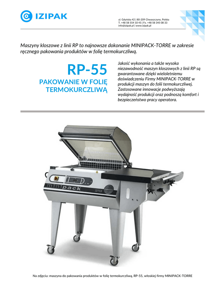 ul. Gdyńska 42 | 80-209 Chwaszczyno, Polska T. +48 58 554 10 45 | Fx. +48 58 345 08 33 [email protected] | www.izipak.pl Maszyny kloszowe z linii RP to najnowsze dokonanie MINIPACK-TORRE w zakresie ręcznego pakowania produktów w folię termokurczliwą. RP-55 PAKOWANIE W FOLIĘ TERMOKURCZLIWĄ Jakość wykonania a także wysoka niezawodność maszyn kloszowych z linii RP są gwarantowane dzięki wieloletniemu doświadczeniu Firmy MINIPACK-TORRE w produkcji maszyn do folii termokurczliwej. Zastosowane innowacje podwyższają wydajność produkcji oraz podnoszą komfort i bezpieczeństwo pracy operatora. Na zdjęciu: maszyna do pakowania produktów w folię termokurczliwą, RP-55, włoskiej firmy MINIPACK-TORRE RP-55 MINIPACK-TORRE od 40 lat wytwarza znakomite maszyny do pakowania produktów w folię termokurczliwą. Firma, bazując na długoletnim doświadczeniu, obecnie wprowadza na rynek kompaktowe, kloszowe maszyny z prestiżowej i nowatorskiej linii RP. W linii RP oferowane są maszyny proste, łatwe w użyciu, wytrzymałe i niezawodne, a jednocześnie wykonane z dużą precyzją i dbałością o detale. Maszyny z linii RP mają stalowy korpus, powiększoną powierzchnię do pakowania produktów, intuicyjne programowanie, itp. – mówiąc krótko: są niezawodne i niepowtarzalne! Cechy urządzenia RP-55: • Typ wykorzystywanej folii – poliolefina • Zgrzewanie i obkurczanie następuje w jednym cyklu • Innowacyjny sposób mocowania klosza z plexiglassu – łatwiejsza obsługa i większa stabilność • Czujnik na listwach zgrzewających zwiększa bezpieczeństwo użytkownika • Większa średnica rolki (250 mm) użyteczna przy foliach z mikroperforacją (np. przy pakowaniu pieczywa) • Blat roboczy oddzielony od rolki, dzięki czemu z jednej rolki można pakować także małe produkty • Większa powierzchnia blatu roboczego; wymiarami zbliżona do obszaru obkurczania • Innowacyjny mikro-nakłuwacz folii • Nowy membranowy, wodoodporny przełącznik elektroniczny, niezależny od panelu sterowania • 3-pozycyjny wyświetlacz cyfrowy • Panel sterowania z 10 programami • Licznik cykli • Mocniejszy i wydajniejszy wentylator, zapewniający łatwiejszą obsługę i większą wydajność • Wyższa i bezpieczniejsza płyta ochronna • Aluminiowe innowacyjne elementy grzejne, zapewniające wyższą wymianę ciepła, lepszą wydajność, większą prędkość obkurczania i mniejsze zużycie energii • Termostat bezpieczeństwa na grzałkach • Łatwa wymiana uszczelek • Produkcja: Minipack-Torre (Włochy) Dane techniczne: • Zasilanie: 230V – 1 faza – 50/60Hz • Maksymalne zużycie prądu: 3,45 kW • Wydajność: do 300 pakunków/godz. • Wymiary użytkowe prętów zgrzewających: 540 x 390 mm • Maksymalne wymiary produktów: o Długość: 500 mm o Szerokość: 380 mm o Wysokość: 200 mm • • • Maksymalna średnica rolki z folią: 250 mm Maksymalna szerokość rolki z folią: 600 mm Wysokość blatu roboczej: 925 mm (razem z nogami) • Wymiary maszyny (*z podniesioną pokrywą): o Długość: 1.260 mm o Szerokość: 810 mm o Wysokość: 1.165 (*1.310) mm • Wymiary maszyny spakowanej do transportu: o Długość: 1.330 mm o Szerokość: 1.080 mm o Wysokość: 880 mm • Waga maszyny o Sama maszyny: 90 kg o Z opakowaniem: 120 kg Opcje wyposażenia dodatkowego: • Wyciąg wentylatora, pozwalający oszczędzić ok. 20% ciepłego powietrza i zapewniający większe bezpieczeństwo pracy • Nawijak folii odpadowej • Blat roboczy wykonany ze stali nierdzewnej • Dodatkowe mocowanie na rolkę z folią termokurczliwą Zapakowany produkt: