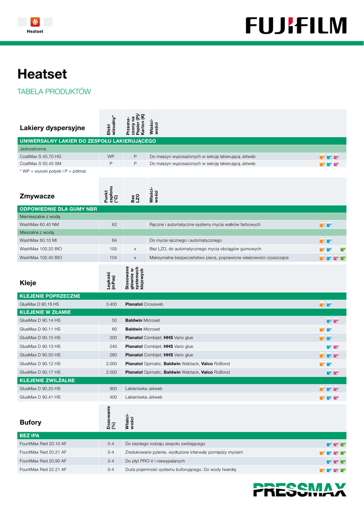 Heatset Heatset Właści wości Przezna czony na Papier (P)/ Karton (K) Lakiery dyspersyjne Efekt wizualny* Tabela produktów Uniwersalny lakier do zespołu lakierującego CoatMax S 40.70 HG WP P Do maszyn wyposażonych w sekcję lakierującą Jetweb CoatMax S 50.45 SM P P Do maszyn wyposażonych w sekcję lakierującą Jetweb Punkt zapłonu (°C) Bez LZO Jednostronne Zmywacze Właści wości * WP = wysoki połysk l P = półmat Odpowiednie dla gumy NBR Niemieszalne z wodą WashMax 60.40 NM Ręczne i automatyczne systemy mycia wałków farbowych 62 Mieszalne z wodą WashMax 60.10 MI 64 Do mycia ręcznego i automatycznego x Bez LZO, do automatycznego mycia obciągów gumowych WashMax 100.40 BIO 104 x Maksymalne bezpeczeństwo pieca, poprawione właściwości czyszczące Kleje Stosowane głównie w systemach klejowych 105 Lepkość (mPas) WashMax 100.20 BIO 3.400 Planatol Crossweb Klejenie poprzeczne GlueMax D 90.16 HS Klejenie w złamie 50 Baldwin Microset GlueMax D 90.11 HS 60 Baldwin Microset GlueMax D 90.15 HS 200 Planatol Combijet; HHS Vario glue GlueMax D 90.13 HS 240 Planatol Combijet; HHS Vario glue GlueMax D 90.50 HS 280 Planatol Combijet; HHS Vario glue GlueMax D 90.12 HS 2.000 Planatol Opimatic, Baldwin Webtack, Valco RoBond GlueMax D 90.17 HS 2.000 Planatol Opimatic, Baldwin Webtack, Valco RoBond GlueMax D 90.14 HS Klejenie zwilżalne Lakierówka Jetweb GlueMax D 90.41 HS 400 Lakierówka Jetweb Bufory Właści wości 900 Dozowanie (%) GlueMax D 90.20 HS Bez IPA FountMax Red 20.10 AF 3-4 Do każdego rodzaju zespołu zwilżającego FountMax Red 20.21 AF 3-4 Zredukowane pylenie, wydłużone interwały pomiędzy myciem FountMax Red 20.90 AF 3-4 Do płyt PRO-V i niewypalanych FountMax Red 22.21 AF 3-4 Duża pojemność systemu buforującego. Do wody twardej Właści wości Emulsje silikonowe Sucha pozosta łość (%) Dozowanie (%) Heatset Bez wosków SilMax G60 CT 6-9 20 Optymalne zwilżanie SilMax G70 CT 4-7 40 Optymalne zwilżanie SilMax G80 CT 2-5 60 Optymalne zwilżanie SilMax G60 CXT 6-9 20 Nadzwyczajna odporność na ścieranie SilMax G70 CXT 4-7 40 Nadzwyczajna odporność na ścieranie SilMax G80 CXT 2-5 60 Nadzwyczajna odporność na ścieranie Zawierające woski Dodatki Dodatki do buforów Anti Foam Odpieniacz do wody układu nawilżającego XtraMax System Cleaner F15 Koncentrat myjący do wodnych układów nawilżających FountControl Zestaw do sprawdzania koncentracji bufora w roztworze nawilżającym IPAFIX Ekonomiczny zamiennik alkoholu izopropylowego. Redukcja LZO XtraMax Water Mineral F12 Dotwardzacz do wody osmotycznej XtraMax Damp Wash F10 Zmywacz do wałków wodnych układów nawilżających Water Mineral S1 Dotwardzacz do wody. Nie oznaczany etykietą bezpieczeństwa Dodatki do lakieru Varnish Remover łagodny zmywacz do lakierów dyspersyjnych Anilox Cleaning Gel Żel do usuwania zaschniętych pozostałości lakierów dyspersyjnych z wałków anilox Dodatki czyszczące XtraMax Cylinder Wash C21 Zabezpieczający środek czyszczący do cylindrów dociskowych i innych metalowych elementów Revival Gel Środek do usuwania osadów z wałków i obciągów XtraMax Revival Wash R70 Regenerator do gumy - szybko odparowujący XtraMax Rejuvenator Wash R73 Regenerator do gumy - średnia prędkośc odparowania XtraMax Revival Wash R72 Regenerator do gumy - wolno odparowujący XtraMax Hand Cleaner C31 Łagodna dla skóry pasta do czyszczenia rąk XtraMax Ink Cleaner I45 Silny środek do czyszczenia pozostałości zaschniętej farby MULTICLEAN 2010 Uniwersalny, silny zwywacz Chemia specjalna XtraMax Anti-Static S90 Antystatyczny dodatek do gotowej do użycia emulsji silikonowej Antistat Liquid Antystatyczny płyn do części maszyn XtraMax Cylinder Oil S92 Zabezpieczający olej do wałków pracujących bez farby Roller Paste Zabezpieczająca pasta do wałków pracujących bez farby XtraMax Water Flow S85 Zabezpieczający dodatek do wody zalecany do automatów myjących Formasil Spray Uniwersalny silikon w sprayu XtraMax Cylinder Oil C15 Olej antykorozyjny do wszystkich elementów maszyny XtraMax Easy Fold S95 Płyn do zwilżania złamu Dane mogą zostać zmienione bez uprzedzenia. Nazwa i logo FUJIFILM, PRESSMAX, nazwa FountMax, CoatMax są markami firmy FUJIFILM Corporation. Pozostałe marki należą do ich właścicieli. Wszystkie prawa zastrzeżone. FUJIFILM Europe nv [email protected] www.fujifilm.eu/pressmax FUJIFILM Italia S.p.A. [email protected] www.fujifilm.it FUJIFILM Deutschland Niederlassung der FUJIFILM Europe GmbH [email protected] www.fujifilm.de FUJIFILM UK Ltd [email protected] www.fujfilm.co.uk/gs FUJIFILM Danmark A/S [email protected] www.fujifilm.dk FUJIFILM Graphic Systems France SAS [email protected] www.fujifilmgraphic.fr HEATSET_pl_1205-02 W celu uzyskania dalszych informacji prosimy o kontakt z lokalnym partnerem Fujifilm