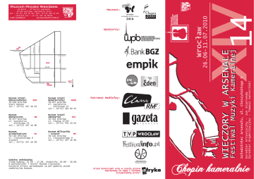 Miko³aja MSM ki iel a W Rynek Ruska MSC Kazimierza Wielkiego MH MSMd Œlê¿na Muzeum Sztuki Mieszczañskiej MSM 50-106 Wroc³aw Stary Ratusz tel.: (0*71) 347 16 93 Muzeum Sztuki Medalierskiej MSMd 50-077 Wroc³aw ul. Kazimierza Wielkiego 35 tel.: (0*71) 391 69 45 Muzeum MH Historyczne 50-077 Wroc³aw ul. Kazimierza Wielkiego 35 tel.: (0*71) 347 16 90 Muzeum Sztuki MSC Cmentarnej 50-301 Wroc³aw ul. Œlê¿na 37/39 tel.: (0*71) 791 59 03 Muzeum Archeologiczne MA 50-136 Wroc³aw ul. Cieszyñskiego 9 Arsena³ tel.: (0*71) 347 16 99 Muzeum Militariów – Arsena³ MM 50-136 Wroc³aw ul. Cieszyñskiego 9 tel.: (0*71) 347 16 96 Godziny zwiedzania: œroda-sobota: 11.00 – 17.00, niedziela: 10.00 – 18.00. W poniedzia³ki i wtorki Muzeum nieczynne. Ostatnie bilety sprzedawane s¹ pó³ godziny przed zamkniêciem Muzeum. Patronat Medialny: Przed koncertami oraz w czasie przerw zapraszamy na kawê i herbatê przygotowan¹ przez: Dyrektor Artystyczny – Jan Stanienda Dyrektor Organizacyjny – Tomasz Kwieciñski O³awska Plac Solny Œwidnicka erz imi Kaz Stwosza Szewska ego Wita Dziedziniec Arsena³u, ul. Cieszyñskiego 9 Cieszyñskiego KuŸnicza RzeŸnicza MA MM Kie³baœnicza Sponsorzy: Wroc³aw www.muzeum.miejskie.wroclaw.pl V 14 e-mail: [email protected] 26.06-11.07.2010 Mecenat: Dyrektor – dr Maciej £agiewski 50-107 Wroc³aw, Sukiennice 14/15 tel.: (0 71) 347 16 92, fax: (0 71) 344 47 85 centrala tel.: (0 71) 347 16 90/91 Chopin kameralnie Wieczory w Arsenale program Wieczór 26.06.2010 (sobota) g. 20 Ingolf Wunder – fortepian Szanowni Pañstwo, wysmakowany program, plejada wirtuozów i muzyka na urokliwym dziedziñcu: po raz czternasty w sobotê 26. czerwca rozpoczyna siê we Wroc³awiu Festiwal Muzyki Kameralnej „Wieczory w Arsenale”. Tym razem z Orkiestr¹ Kameraln¹ „Wratislavia” pod dyrekcj¹ Jana Staniendy wyst¹pi¹ m.in. wybitni pianiœci Piotr Paleczny i Ingolf Wunder, a tak¿e skrzypaczka Maria W³oszczowska. Upamiêtnione zostan¹ dwie wielkie muzyczne rocznice: 200-lecie urodzin czo³owych romantyków: Fryderyka Chopina i Roberta Schumanna. Z tej okazji publicznoœæ us³yszy wszystkie utwory kameralne Chopina, w tym Introdukcjê i Poloneza C-dur na fortepian i wiolonczelê oraz Sonatê g-moll op. 65. Wœród wydarzeñ rocznicowych ciekawie zapowiada siê równie¿ wykonanie kompletu Pieœni Chopina w interpretacji znakomitej Urszuli Kryger (mezzosopran), Jaros³awa Brêka (bas-baryton) i towarzysz¹cej im pianistki Katarzyny Jankowskiej. Inne gwiazdy „Wieczorów” to doskona³y skrzypek Krzysztof Jakowicz i zespó³ Tangata Quintet (w programie Polskie tanga), Edward Wolanin i Janusz Wawrowski. A oprócz dzie³ Chopina i Schumanna nie zabraknie interesuj¹co dobranych kompozycji kameralnych m.in. Elsnera, Roussela, Janáèka i Tansmana. Wystêpy jak zwykle na piêknym dziedziñcu wroc³awskiego Arsena³u, poœród zabytków, zieleni i œpiewu ptaków. Specjalnie rozstawiony namiot ochroni publicznoœæ i artystów przed deszczem, w przypadku ch³odnej aury koncerty przeniesione bêd¹ do jednej z sal. Zapraszamy na koncerty... Orkiestra Kameralna Wratislavia Jan Stanienda – dyrygent E. A. A. F. Grieg – 2 Elegie op. 34 Tansman – Wariacje na temat Frescobaldiego Areñski – Wariacje na temat Czajkowskiego Chopin – I Koncert fortepianowy e-moll op. 11 Bilety: 30 z³ (N) i 24 z³ (U) Wieczór 27.06.2010 (niedziela) g. 20 Janusz Wawrowski – skrzypce Tadeusz Domanowski – fortepian R. Schumann – II Sonata skrzypcowa d-moll op. 121 Fryderyk Chopin – Nokturn Es-dur op. 9 nr 2 (opr. P. Sarasate) – Nokturn D-dur op. 27 nr 2 (opr. A. Wilhelmi) – Nokturn cis-moll (opr. K. Rodionow) – Piosnka litewska op. 74 nr 16 (opr. L. Auer) R. Schumann – I Sonata skrzypcowa a-moll op. 105 I. J. Paderewski – Melodia Ges-dur op. 16 nr 2 R. Maciejewski – Nokturn M. Ravel – Tzigane Bilety: 30 z³ (N) i 24 z³ (U) Wieczór 30.06.2010 (œroda) g. 20 Dyrektor Artystyczny Biuro Festiwalowe: tel./fax: Internet: e-mail: Dyrektor Organizacyjny ul. Ruska 46B 50-079 Wroc³aw (0 71) 791 45 41 www.Wieczory-w-Arsenale.pl [email protected] g. 20 Krzysztof Stanienda – fortepian Adam Krzeszowiec – wiolonczela Bartosz Bober – skrzypce Wioletta Porêbska – skrzypce Maria Mik³aszewicz – altówka Fryderyk Chopin Introdukcja i Polonez C-dur na wiolonczelê i fortepian op. 3 Grand Duo Concertant E-dur na wiolonczelê i fortepian Sonata na wiolonczelê i fortepian g-moll op. 65 Andante spianato i Wielki Polonez Es-dur op. 22 Bilety: 30 z³ (N) i 24 z³ (U) E. Grieg – 2 Arie Norweskie op. A. Vivaldi – Koncert skrzypcowy morzu” RV 253 J. S. Bach – Koncert skrzypcowy F. Schubert – Rondo na skrzypce L. Janáèek – Suita na orkiestrê 63 Es-dur „Burza na d-moll BWV 1052 i smyczki A-dur D.438 smyczkow¹ (pi¹tek) (pi¹tek) g. 20 Krzysztof Jakowicz – skrzypce TANGATA QUINTET TANGA POLSKIE (m.in.: „Odrobina szczêœcia w mi³oœci”, „W ma³ym kinie”, „Z³ociste chryzantemy”,„Ca³ujê twoj¹ d³oñ, Madame”, „Ostatnia Niedziela”...) Bilety: 70 z³ (N) i 50 z³ (U) Wieczór 11.07.2010 (niedziela) g. 18 Piotr Paleczny – fortepian Jan Stanienda – dyrygent Bilety: 30 z³ (N) i 24 z³ (U) Wieczór 02.07.2010 Wieczór 09.07.2010 Orkiestra Kameralna Wratislavia Maria W³oszczowska – skrzypce Jan Stanienda – dyrygent Tomasz Kwieciñski (œroda) Koncert upamiêtniaj¹cy 200. rocznicê urodzin R. Schumanna Orkiestra Kameralna Wratislavia Jan Stanienda Wieczór 07.07.2010 g. 20 Edward Wolanin – fortepian Jan Stanienda – skrzypce Lidia Grzanka-Urbaniak – wiolonczela A. Roussel – Sinfonietta na smyczki op. 62 J. Suk – Serenada na smyczki Es-dur op. 6 F. Chopin – II Koncert fortepianowy f-moll op. 21 Bilety: 30 z³ (N) i 24 z³ (U) Bilety oraz karnety (w cenie 200 z³ - normalne, 160 z³ - ulgowe) do nabycia w: OKiS – Rynek-Ratusz 24, na godzinê przed koncertami w Arsenale, ul. Cieszyñskiego 9, oraz na stronach internetowych Festiwal