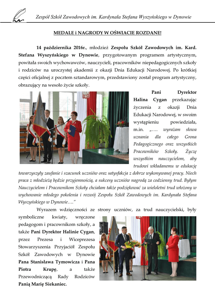 Zespół Szkół Zawodowych im. Kardynała Stefana Wyszyńskiego w Dynowie MEDALE i NAGRODY W OŚWIACIE ROZDANE! 14 października 2016r., młodzież Zespołu Szkół Zawodowych im. Kard. Stefana Wyszyńskiego w Dynowie, przygotowanym programem artystycznym, powitała swoich wychowawców, nauczycieli, pracowników niepedagogicznych szkoły i rodziców na uroczystej akademii z okazji Dnia Edukacji Narodowej. Po krótkiej części oficjalnej z pocztem sztandarowym, przedstawiony został program artystyczny, obrazujący na wesoło życie szkoły. Pani Halina Dyrektor Cygan życzenia z przekazując okazji Dnia Edukacji Narodowej, w swoim wystąpieniu m.in. „…. uznania dla powiedziała, wyrażam słowa całego Grona Pedagogicznego oraz wszystkich Pracowników wszystkim Szkoły. nauczycielom, Życzę aby trudowi wkładanemu w edukację towarzyszyły zaufanie i szacunek uczniów oraz satysfakcja z dobrze wykonywanej pracy. Niech praca z młodzieżą będzie przyjemnością, a sukcesy uczniów nagrodą za codzienny trud. Byłym Nauczycielom i Pracownikom Szkoły chciałam także podziękować za wieloletni trud włożony w wychowanie młodego pokolenia i rozwój Zespołu Szkół Zawodowych im. Kardynała Stefana Wyszyńskiego w Dynowie….” Wyrazem wdzięczności ze strony uczniów, za trud nauczycielski, były symboliczne kwiaty, wręczone pedagogom i pracownikom szkoły, a także Pani Dyrektor Halinie Cygan, przez Prezesa i Wiceprezesa Stowarzyszenia Przyjaciół Zespołu Szkół Zawodowych w Dynowie Pana Stanisława Tymowicza i Pana Piotra Krupę, Przewodniczącą a Rady Panią Marię Siekaniec. także Rodziców Zespół Szkół Zawodowych im. Kardynała Stefana Wyszyńskiego w Dynowie Natomiast w dniu 12 października 2016r. podkarpaccy nauczyciele, pracownicy oświaty zostali uhonorowani odznaczeniami państwowymi, nagrodami Ministra Edukacji Narodowej i Podkarpackiego Kuratora Oświaty. Uroczyste wręczenie odznaczeń i wyróżnień ściągnęło do Rzeszowa nauczycieli i pracowników oświaty z całego województwa. Dla naszej społeczności szkolnej była to szczególna uroczystość, ponieważ szczególne wyróżnienie – Medal Komisji Edukacji Narodowej za szczególne zasługi na rzecz oświaty i wychowania otrzymały: Pani Beata Irzyk i Pani Elżbieta Kiszka, natomiast Medal Brązowy za Długoletnią Służbę otrzymali: Pani Agata Krupa i Pan Piotr Marcinek. Odznaczeń dokonali Pani Ewa Leniart Wojewoda Podkarpacki i Pani Małgorzata Rauch Podkarpacki Kurator Oświaty. W tym Nagrodę szczególnym Starosty Rzeszowskiego Władysław nagrody dniu Powiatu otrzymał Galej, Pan natomiast Dyrektora Szkoły otrzymali: Pan Adam Bogusz, Pani Anna Fara, Pani Anna Gierula, Pani Beata Irzyk, Pan Marcin Kałamucki, Pani Renata Mazur, Pani Honorata Mikoś, Pan Jarosław Pani Agnieszka Piejko, Pani Bogusława Smolińska, Pani Barbara Wolańska, Pani Halina Wandas, Pan Piotr Zdeb. Mol, Ślemp, Pan Maciej Tymowicz, Pani Małgorzata Trybalska, Pani Magdalena