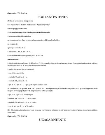 Sygn. akt I Ns 875/15 POSTANOWIENIE Dnia 16 września 2015 roku Sąd Rejonowy w Bielsku Podlaskim I Wydział Cywilny w następującym składzie: Przewodniczący SSR Małgorzata Hajduczenia Protokolant Magdalena Kalata po rozpoznaniu w dniu 16 września 2015 roku w Bielsku Podlaskim na rozprawie sprawy z wniosku R. O. z udziałem J. M., A. M. i B. M. o stwierdzenie nabycia spadku po L. M. i S. M. postanawia: I. Stwierdzić, że spadek po L. M., córce P. i M., zmarłej dnia 12 sierpnia 2011 roku w C., posiadającej ostatnie miejsce zwykłego pobytu w B. na podstawie ustawy nabyli: - mąż S. M., syn A. i A. w ¼ części - syn J. M., syn S. i L. - córka R. O., córka S. i L. - córka B. M., córka S. i L. - syn A. M., syn S. i L. – po 3/16 części każde z nich. II. Stwierdzić, że spadek po S. M., synu A. i A., zmarłym dnia 30 kwietnia 2013 roku w B., posiadającym ostatnie miejsce zwykłego pobytu w B. na podstawie ustawy nabyli: - syn J. M., syn S. i L. w ¼ części - córka R. O., córka S. i L. w ¼ części - córka B. M., córka S. i L. w ¼ części - syn A. M., syn S. i L. w ¼ części. III. Stwierdzić, że zainteresowani ponoszą we własnym zakresie koszty postępowania związane ze swym udziałem w sprawie. Sygn. akt I Ns 875/15 UZASADNIENIE Wnioskodawczyni R. O. wniosła o stwierdzenie nabycia spadku w drodze dziedziczenia ustawowego po L. M., córce P. i M., zmarłej 12 sierpnia 2011 roku w C., ostatnio stale zamieszkałej w B. przy ul. (...) przy ul. (...) oraz po S. M., synu A. i A., zmarłym 30 kwietnia 2013 roku w B., ostatnio stale zamieszkałym w B. przy ul. (...). Uczestnik postępowania A. M. przychylił się do wniosku. ( k. 26). Uczestnicy postępowania: B. M. i J. M. nie zajęli stanowiska w sprawie. Sąd Rejonowy ustalił i zważył, co następuje: Spadkodawczyni L. M., córka P. i M. zmarła C.. Posiadała ostatnie stałe miejsce zwykłego pobytu w B. (k. 5- odpis skrócony aktu zgonu, k.26 v- zapewnienie). Spadkodawczyni ze spadkobierców ustawowych pozostawiła: męża S. M. ( k. 14 – odpis skrócony aktu małżeństwa) obecnie nieżyjącego, który zmarł 30 kwietnia 2013 roku( k. 6 akt - odpis skrócony akt zgonu) oraz dzieci: syna J. M. ( k. 7 - odpis skrócony aktu urodzenia ), syna A. M.( k. 11 -odpis skrócony aktu urodzenia ), córkę B. M. ( k. 10- odpis skrócony aktu urodzenia) i córkę R. O. ( k. 8 akt- odpis skrócony aktu małżeństwa). Innych dzieci, w tym pozamałżeńskich i przysposobionych nie pozostawiła. Zmarła L. M. nie sporządziła testamentu. Nikt ze spadkobierców nie odrzucił spadku, nie zrzekł się dziedziczenia i nie został uznany za niegodnego dziedziczenia. (k. 26v- zapewnienie). Spadkodawca S. M., syn A. i A. zmarł 30 kwietnia 2013 roku w B.. Posiadał ostatnie stałe miejsce zwykłego pobytu w B. (k. 6 - odpis skrócony aktu zgonu spadkodawcy). Spadkodawca był wdowcem Spadkodawca ze spadkobierców ustawowych pozostawił dzieci: syna J. M. ( k. 7 - odpis skrócony aktu urodzenia ), syna A. M. ( k. 11 -odpis skrócony aktu urodzenia ), córkę B. M. ( k. 10- odpis skrócony aktu urodzenia) i córkę R. O. ( k. 8 akt- odpis skrócony aktu małżeństwa). Innych dzieci, w tym pozamałżeńskich i przysposobionych nie pozostawiła. Zmarła L. M. nie sporządziła testamentu. Nikt ze spadkobierców nie odrzucił spadku, nie zrzekł się dziedziczenia i nie został uznany za niegodnego dziedziczenia. (k. 26v- zapewnienie). Prawo polskie – w myśl art. 926§1 k.c.- przewiduje dwa tytuły powołania do spadku: przepisy ustawy oraz wola spadkodawcy wyrażona w testamencie odpowiadającym wymaganiom formalnym, przy czym ustawa daje pierwszeństwo porządkowi dziedziczenia określonemu przez spadkodawcę w testamencie. Dlatego też dziedziczenie na podstawie ustawy co do całości spadku ma miejsce wtedy, gdy spadkodawca nie sporządził w ogóle testamentu, sporządził testament, którego treść ogranicza się do innych rozrządzeń albo gdy spadkodawca sporządził testament, który okazał się nieważny lub bezskuteczny ( §2 i 3 ). Wobec bezspornego i niekwestionowanego przez nikogo z zainteresowanych ustalenia, że w/w spadkodawcy nie pozostawili testamentu, porządek dziedziczenia po nich określają przepisy Kodeksu cywilnego (art. 926 § 1 i 2 k.c.). Zgodnie z treścią przepisu art. LI ustawy z dnia 23 kwietnia 1964 r. Przepisy wprowadzające kodeks cywilny. (Dz.U.1964.16.94) do spraw spadkowych stosuje się prawo obowiązujące w chwili śmierci spadkodawcy, o ile przepisy poniższe nie stanowią inaczej. W myśl art. 931 § 1 k.c. w pierwszej kolejności powołane są z ustawy do spadku dzieci spadkodawcy oraz jego małżonek; dziedziczą oni w częściach równych. Jednakże część przypadająca małżonkowi nie może być mniejsza niż jedna czwarta całości spadku. Ze złożonego przez wnioskodawczynię zapewnienia spadkowego i znajdujących się w aktach sprawy aktów stanu cywilnego wynika, że spadkodawczyni L. M. w chwili śmierci była mężatką oraz miała czworo dzieci należy więc stwierdzić, że do spadku po w/w spadkodawcy z mocy ustawy powołani zostali: mąż S. M. z udziałem w wysokości ¼ części i dzieci: syn A. M., syn J. M., córka B. M. i córka R. O., a ich udziały wynoszą po 3/16 części każdego z nich. Natomiast spadkodawca S. M. w chwili śmierci był wdowcem i ze spadkobierców ustawowych pozostawił także czworo dzieci, tj. w/w spadkobierców, a zatem udziały w/w osób zostały ustalone w wysokości ¼ części każdego z nich. Biorąc pod uwagę powyższe przepisy art. 931 §1 kc Sąd rzekł jak w sentencji postanowienia. O kosztach postępowania orzeczono w myśl art. 520 § 1 kpc stwierdzając, że zainteresowani ponoszą je we własnym zakresie. SSR Małgorzata Hajduczenia