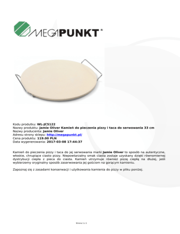 Kodu produtku: WL-JC5122 Nazwy produktu: Jamie Oliver Kamień do pieczenia pizzy i taca do serwowania 33 cm Nazwy producenta: Jamie Oliver Adresu strony sklepu: http://megapunkt.pl/ Cena produktu: 119.00 PLN Data wygenerowania: 2017-03-08 17:44:37 Kamień do pieczenia pizzy i taca do jej serwowania marki Jamie Oliver to sposób na autentyczne, włoskie, chrupiące ciasto pizzy. Niepowtarzalny smak ciasta zostaje uzyskany dzięki równomiernej dystrybucji ciepła z pieca do ciasta. Kamień utrzymuje również pizzę ciepłą na dłużej, jeśli wybierzemy oryginalny sposób zaserwowania jej gościom na gorącym kamieniu. Zapoznaj się z zasadami konserwacji i użytkowania kamienia do pizzy w pliku poniżej. Strona 1 z 1