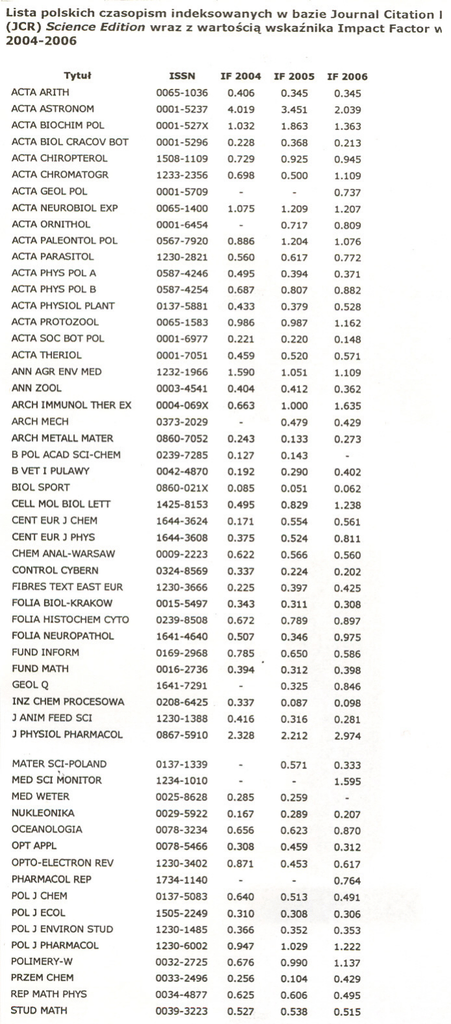 - 1.595 0.571 0.764 - czasopism 1.207 0.772 IF 2004 1.363 0.290 0.829 0.561 0.143 0.127 0.650 0.785 0.897 1.000 0.148 1.109 1.051 0.571 0.520 1.590 0.459 1232-1966 0.528 0.379 1.162 0.987 0.986 0.433 0065-1583 0.882 0.807 0.687 0.316 1.076 1.209 0.809 1.204 0.886 1.075 0.7170009-2223 0065-1400 0567-7920 0.353 0.606 0.366 0.625 0.870 0.371 1.222 0.394 0.500 0.560 0.698 IF 2006 2005 ISSN 0.306 0.104 0.945 2.039 1.863 3.451 0.729 4.019 1.032 0001-527X 0.213 0.368 0.228 0.402 0.192 0042-4870 0.062 0.051 0.811 0.524 1.238 0.495 0.375 0.085 1425-8153 0.554 0.560 0.202 0.224 0.566 0.171 0.622 0.337 0324-8569 0.425 0.308 0.311 0.975 0.346 0.586 0.398 0.312 0.397 0.225 0.507 0.343 0.394 0016-2736 0.789 0.672 0.429 0.273 1.635 0.362 0.133 0.412 0.243 0.663 0.404 0.479 0373-2029 0004-069X 0003-4541 0860-7052 0.220 0.221 0001-6977 0001-7051 0137-5881 0001-5709 0587-4254 0.098 0.087 0.281 0.416 0.459 0.308 0001-6454 0.352 0.495 0034-4877 2.974 2.212 2.328 0.259 0.289 0.623 0.617 0.453 0.207 0.871 0.285 0.167 0.656 0025-8628 0029-5922 0078-3234 0.515 0.538 1.029 0.947 0.527 0587-4246 1230-2821 1233-2356 1234-1010 0.846 0.325 0.491 0.513 0.990 1.137 0.333 0.310 0.640 0.676 0.256 1505-2249 0033-2496 0.345 0.925 0.406 1508-1109 0001-5237 0065-1036 0001-5296 0860-021X 1644-3608 1644-3624 0015-5497 0239-7285 1230-3666 1641-4640 0239-8508 0169-2968 0.737 0208-6425 1230-1388 0078-5466 0867-5910 0137-1339 1230-3402 1230-6002 1230-1485 0039-3223 1641-7291 1734-1140 0137-5083 0032-2725 Lista polskich indeksowanych I MONITOR w bazie Journal Citation I 2004-2006 (JCR) Science Edition wraz z wartoscia wskaznika Impact Factor Tytul VI