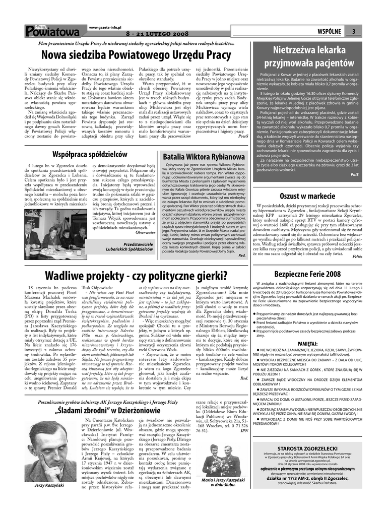 www.gazeta-info.pl WSPÓLNE - lutego Plan przeniesienia Urzędu Pracy do niedawnej siedziby zgorzeleckiej policji nabiera realnych kształtów. Nowa siedziba Powiatowego Urzędu Pracy Niewykorzystany od chwili zmiany siedziby Komendy Powiatowej Policji w Zgorzelcu budynek przy ulicy Pułaskiego zmienia właściciela. Należący do Skarbu Państwa obiekt stanie się wkrótce własnością powiatu zgorzeleckiego. Na zmianę właściciela zgodził się Wojewoda Dolnośląski i po podpisaniu aktu notarialnego dawny gmach Komendy Powiatowej Policji włączony zostanie do powiato- wego zasobu nieruchomości. Oznacza to, iż plany Zarządu Powiatu przeniesienia siedziby Powiatowego Urzędu Pracy do tego właśnie obiektu stają się coraz bardziej realne. Dokonana bowiem aktem notarialnym darowizna obwarowana będzie warunkiem takiego właśnie przeznaczenia tego budynku. Zarząd Powiatu dysponuje już stosowną kalkulacją przewidywanych kosztów remontu i adaptacji obiektu przy ulicy Pułaskiego dla potrzeb urzędu pracy, tak by spełniał on określone standardy. Warto przypomnieć, iż w chwili obecnej Powiatowy Urząd Pracy zlokalizowany jest w trzech różnych budynkach – główna siedziba przy ulicy Mickiewicza jest zbyt mała dla realizacji ustawowych zadań przez urząd. Wiąże się to z niedogodnościami dla klientów urzędu pracy oraz mało komfortowymi warunkami pracy dla pracowników Współpraca spółdzielców 4 lutego br. w Zgorzelcu doszło do spotkania przedstawicieli spółdzielców ze Zgorzelca i Lubania. Celem spotkania było i jest przyszła współpraca w przekształceniu Spółdzielni mieszkaniowej z obecnego kształtu – molocha poza kontrolą społeczną na spółdzielnie małe jednoblokowe w których mieszkań- tej jednostki. Przeniesienie siedziby Powiatowego Urzędu Pracy w jedno miejsce oraz nowoczesne jego wyposażenie umożliwiłoby w pełni realizację nałożonych na tę instytucję rynku pracy zadań. Budynek urzędu pracy przy ulicy Mickiewicza wymaga wielu nakładów, coraz to częstszych prac remontowych a jego stan nie spełnia na dzień dzisiejszy rygorystycznych norm bezpieczeństwa i higieny pracy. PowS Batalia Wiktora Rybianowa cy demokratycznie decydować będą o swojej przyszłości. Połączone siły i doświadczenie są tu fundamentem sukcesu całego przedsięwzięcia. Inicjatorzy będą wprowadzać swoją koncepcję w życie przecierając trudne do pokonania szlaki w gąszczu przepisów, których z zaciekłością bronią dotychczasowi prezesi i ich zarządy. Ta godna naśladowania inicjatywa, której inicjatorem jest dr Tomasz Wójcik spowodowana jest zeszłoroczną nowelizacją ustawy o spółdzielniach mieszkaniowych. Obserwator Przedstawiciele Lubańskich Spółdzielców Opisywana już przez nas sprawa Wiktora Rybianowa, który toczy ze Zgorzeleckim Urzędem Miasta batalię o sprawiedliwość nabiera tempa. Pan Wiktor dysponując udokumentowanymi argumentami zwraca się do Burmistrza Miasta z pretensjami i żądaniem wyjaśnienia dotychczasowego traktowania jego osoby. W skierowanym do Rafała Gronicza piśmie zarzuca władzom miejskim ignorancję i oczekuje uzasadnienia przetrzymywania przez urząd dokumentu, który był mu niezbędny do zakupu lekarstw. Był to wniosek o udzielenie pomocy społecznej. Pan Wiktor pisze też o fałszerstwach dokumentów i oszustwach wśród pracowników urzędu miasta oraz ich celowym działaniu wbrew prawu i przyjętym normom społecznym. Przypomina obecnemu Burmistrzowi, że wraz z objęciem stanowiska przyjął po poprzednich rządach sporo niewyjaśnionych i trudnych spraw w tym jego. Przypomina także, iż w Urzędzie Miasta nadal pracują ludzie, którzy mimo zmian politycznych zachowali swoje stanowiska. Oczekuje obiektywnej i sprawiedliwej oceny swojego przypadku i podjęcia przez obecną władzę miasta konkretnych działań. Kopię pisma w całości posiada Redakcja Gazety Powiatowej Dolny Śląsk. Red. Wadliwe projekty - czy polityczne gierki? 18 stycznia br. podczas konferencji prasowej Poseł Marzena Machałek omówiła kwestię projektów, które zostały skreślone przez obecną ekipę Donalda Tuska (PO) z listy przygotowanej przez poprzedni rząd Premiera Jarosława Kaczyńskiego do realizacji. Były to projekty z list indykatywnych, które miały otrzymać dotację z UE. Na liście znalazło się 176 inwestycji z zakresu ochrony środowiska. Po wykreśleniu zostało zaledwie 35 projektów. Z rejonu jeleniogórsko-legnickiego na liście znajdowały się projekty mające na celu uregulowanie gospodarki wodno ściekowej. Zapytany o tę sprawę Premier Donald Tusk Odpowiada: - Nie wiem czy Pani Poseł was poinformowała, że na razie skreśliliśmy ewidentnie polityczne projekty, które były źle przygotowane, a koncentrowały się w trzech województwach: świętokrzyskim, podlaskim i podkarpackim. Ze względu na osobiste interwencje liderów PiSu m.in. p. Gosiewskiego, realizowane w sposób bardzo niezrównoważony i krzywdzący dla tych terenów, czy dla ziem zachodnich, północnych lub Śląska. Na pewno przywrócimy równowagę w tej sprawie. Rzeczą kluczową jest aby akceptować projekty, które są tak przygotowane, że nie będą narażone na odrzucenie przez Brukselę. Ludziom się wydaje, że to co się wpisze u nas na listę marszałkowską czy indykatywną, ministerialną – że tak jak już jest wpisane - to jest zaklepane, a później te wadliwie przygotowane projekty wędrują do Brukseli i są wyrzucane. - Więc mieszkańcy mogą być spokojni? Chodzi tu o ;projekty, w jednym z których np. gmina Sulików od wielu miesięcy stara się o dofinansowanie inwestycji oczyszczenia zlewni rzeki Czerwona Woda. - Zapewniam, że w moim interesie leży zadowolenie mieszkańców Zgorzelca. Ja wiem na kogo Zgorzelec głosował, jaki kredyt zaufania dostałem ja i moja ekipa w tym województwie i konkretnie w tym mieście. Czy Poszukiwanie grobów żołnierzy AK Jerzego Kaszyńskiego i