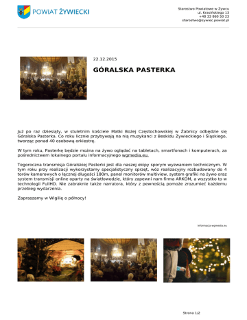 Starostwo Powiatowe w Żywcu ul. Krasińskiego 13 +48 33 860 50 23 [email protected] 22.12.2015 GÓRALSKA PASTERKA Już po raz dziesiąty, w stuletnim kościele Matki Bożej Częstochowskiej w Żabnicy odbędzie się Góralska Pasterka. Co roku licznie przybywają na nią muzykanci z Beskidu Żywieckiego i Śląskiego, tworząc ponad 40 osobową orkiestrę. W tym roku, Pasterkę będzie można na żywo oglądać na tabletach, smartfonach i komputerach, za pośrednictwem lokalnego portalu informacyjnego wgmedia.eu. Tegoroczna transmisja Góralskiej Pasterki jest dla naszej ekipy sporym wyzwaniem technicznym. W tym roku przy realizacji wykorzystamy specjalistyczny sprzęt, wóz realizacyjny rozbudowany do 4 torów kamerowych o łącznej długości 180m, panel monitorów multiview, system grafiki na żywo oraz system transmisji online oparty na światłowodzie, który zapewni nam firma ARKOM, a wszystko to w technologii FullHD. Nie zabraknie także narratora, który z pewnością pomoże zrozumieć każdemu przebieg wydarzenia. Zapraszamy w Wigilię o północy! Informacja wgmedia.eu Strona 1/2 Starostwo Powiatowe w Żywcu ul. Krasińskiego 13 +48 33 860 50 23 [email protected] Strona 2/2 Powered by TCPDF (www.tcpdf.org)