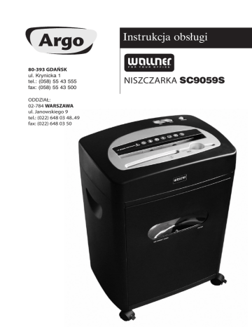 Instrukcja obsługi 80-393 GDAŃSK ul. Krynicka 1 tel.: (058) 55 43 555 fax: (058) 55 43 500 ODDZIAŁ: 02-784 WARSZAWA ul. Janowskiego 9 tel.: (022) 648 03 48..49 fax: (022) 648 03 50 NISZCZARKA SC9059S PL NISZCZARKA WALLNER SC9059S • • • • • UWAGA! Przeczytaj uważnie instrukcję zanim przystąpisz do pracy. Sprawdź czy napięcie prądu i częstotliwości podane na tabliczce znamionowej, znajdującej się na spodzie urządzenia są takie jak w twoim gniazdku. Nie używaj urządzenia jeżeli kosz nie jest zainstalowany Nie używaj urządzenia jeżeli kosz jest pełny. Wyłącz wtyczkę z gniazdka: a) zanim opróżnisz kosz, b) przed naprawą lub konserwacją, c) przed otworzeniem urządzenia w przypadku naprawy. UWAGI DOTYCZĄCE BEZPIECZEŃSTWA Urządzenie nie może być użytkowane przez więcej niż jedną osobę w tym samym czasie. Podczas niszczenia dokumentów, nie można przeprowadzać innych czynności związanych z obsługą urządzenia (np. czyszczenia itp.) Nie dopuszczać dzieci w pobliże urządzenia. Urządzenie zostało zaprojektowane pod potrzeby dorosłych i przystosowane do bezpiecznego użytkowania i obsługi tylko przez dorosłych. Naprawy muszą być dokonywane przez wykwalifikowany serwis. Należy trzymać luźne przedmioty (np. krawaty, biżuterię, włosy) z dala od szczeliny wejściowej niszczarki. Nie zastosowanie się do tego zalecenia może spowodować obrażenia! Nie należy wkładać palców do szczeliny wejściowej niszczarki. W przypadku niebezpieczeńtwa należy bezzwłocznie wyłączyć urządzenie. Należy zawsze wyłączyć wtyczkę z gniazda przed otwarciem maszyny. Niszczarka dokumentów jest przeznaczona do niszczenia papierów, kart kredytowych i płyt CD. Niszczenie innych materiałów może spowodować obrażenia bądź uszkodzenie urządzenia. W przypadku, gdy urządzenie posiada wtyczkę z uziemieniem, musi być podłączone do gniazdka z uziemieniem! © ARGO S.A. www.argo.pl 2 PL BUDOWA NISZCZARKI 1. Podwójny przycisk dla funkcji REV i FWD 2. Włącznik zasilania 3. Szczelina wejściowa dla kart plastikowych 4. Szczelina wejściowa dla papieru 5. Szczelina wejściowa dla płyt CD 6. Przezroczyste okno obudowie umożliwiające kontrolę napełnienia kosza 7. Wyjmowany kosz na ścinki 8. Obudowa na kółkach 9. Uchwyt FUNKCJE Automatyczne niszczenie papieru, płyt CD, kart plastikowych dzięki czujnikom na podczerwień; automatyczne lub ręczne uwalnianie zablokowanego papieru. Trzy szczeliny wejściowe: jedna dla papieru, druga dla płyt CD i trzecia dla kart plastikowych. Urządzenie zatrzymuje się i automatycznie włącza funkcje reverse w celu uniknięcia zaklinowania papieru w przypadku przekroczenia dopuszczalnej ilości niszczonych arkuszy. Automatycznie zatrzymuje się także, gdy silnik jest przegrzany. Obudowa na kółkach ułatwia przemieszczanie urządzenia. Osobne kosze na płyty CD i karty plastikowe umożliwiają segregację odpadów. OBSŁUGA URZĄDZENIA 1. 2. 3. 4. 5. Sprawdź czy napięcie prądu i częstotliwości podane na tabliczce znamionowej maszyny są takie jak w Twoim gniazdku. Podłącz urządzenie do gniazda i wciśnij włącznik; dioda sygnalizacyjna zaświeci się, co oznacza, że urządzenie jest w trybie Standby. Włóż papier lub płytę/kartę plastikową do szczeliny wejściowej, a czujnik automatycznie uruchomi niszczarkę, zaś po skończonej pracy ponownie przejdzie do trybu Standby. Wciśnij przycisk “REV” co uruchomi funkcję REVERSE czyli, że ostrza obracają się w przeciwną stronę, po czym po minucie-dwóch zatrzymują się W przypadku gdy urządzenie jest przeładowane, zatrzyma się automatycznie, a ostrza będą się obracać w przeciwną stronę przez 1-2 sekundy. Po zatrzymaniu należy wyjąć zaklinowany papier/płytę/kartę plastikową i nacisnąć przycisk “FWD”, a maszyna zacznie znów pracować normalnie. Cięcie maksymalnych jednorazowych ilości kartek dopuszczalnych dla danego modelu nie jest właściwym sposobem użytkowania niszczarek. Eksploatacja każdego urządzenia z maksymalnymi dopuszczalnymi wartościami obciążeń prowadzi do zmniejszenia jego żywotności. Dlatego też w celu zachowania trwałej i bezawaryjnej © ARGO S.A. www.argo.pl 3 PL pracy niszczarek zaleca się stosowanie wkładów nie przekraczających 12 arkuszy, 1 karty plastikowej lub płyty CD. 6. Zabrania się jednoczesnego niszczenia papieru i kart plastikowych lub płyt CD. 7. Silnik wyłącza się automatycznie w przypadku przeciążenia urządzenia. Po chwili urządzenie ponownie jest gotowe do pracy. 1. 2. 3. 4. 5. UWAGA! Nie używaj niszczarki do niszczenia ubrania, plastiku, metalu, mokrego lub sklejonego papieru. Nie dopuszczać dzieci i zwierząt w pobliże urządzenia. Należy trzymać luźne przedmioty (np. krawaty, biżuterię, włosy) z dala od szczeliny wejściowej niszczarki. Opróżniaj kosz za każdym razem gdy jest pełny. Wyłącz wtyczkę z gniazda przed czyszczeniem, używaj miękkiej ściereczki i wody z delikatnym mydłem lub specjalnego produktu do czyszczenia. Nie dopuszczaj do wlania sie płynu do środka urządzenia. Nie używaj wybielacza, benzyny, rozcieńczalnika do czyszczenia urządzenia. Jeżeli nie użytkujesz niszczarki przez dłuższy czas, wyłącz wtyczkę z gniazda zasilającego. PARAMETRY TECHNICZNE Model SC9059S Szerokość wejścia 220 mm Wydajność 12 arkuszy (A4/80 g) papieru 1 płyta CD 1 karta plastikowa Rozmiar ścinka (papier) 4x52 mm Rozmiar ścinka (płyta) 23.5 mm Rozmiar ścinka (karta plastik.) 6.4 mm Pojemność kosza na ścinki papieru 18 l Pojemność kosza na płyty CD, karty plastikowe Napięcie 1.0 l 230VAC 50Hz 1.2A Wymiary (L, W, H) 340 x 240 x 524 (mm) Waga netto 8.5 kg © ARGO S.A. www.argo.pl 4 PL ROZWIĄZYWANIE PROBLEMÓW Indeks Problem Przyczyna Rozwiązanie 1 Po ukończeniu niszczenia niszczarka nadala pracuje Za dużo ścinków papieru/ płyt/kart plastikowych znajduje się w koszu, tak, że nowe ścinki nie mogą spadać i