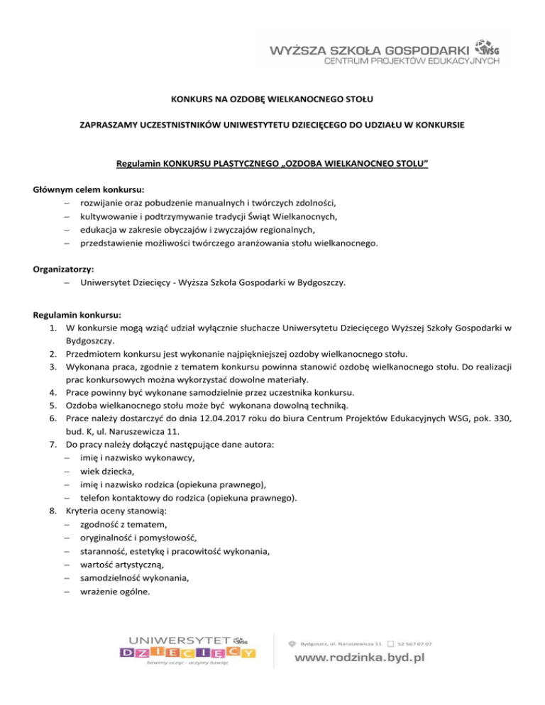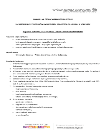 KONKURS NA OZDOBĘ WIELKANOCNEGO STOŁU ZAPRASZAMY UCZESTNISTNIKÓW UNIWESTYTETU DZIECIĘCEGO DO UDZIAŁU W KONKURSIE Regulamin KONKURSU PLASTYCZNEGO „OZDOBA WIELKANOCNEO STOLU” Głównym celem konkursu: rozwijanie oraz pobudzenie manualnych i twórczych zdolności, kultywowanie i podtrzymywanie tradycji Świąt Wielkanocnych, edukacja w zakresie obyczajów i zwyczajów regionalnych, przedstawienie możliwości twórczego aranżowania stołu wielkanocnego. Organizatorzy: Uniwersytet Dziecięcy - Wyższa Szkoła Gospodarki w Bydgoszczy. Regulamin konkursu: 1. W konkursie mogą wziąć udział wyłącznie słuchacze Uniwersytetu Dziecięcego Wyższej Szkoły Gospodarki w Bydgoszczy. 2. Przedmiotem konkursu jest wykonanie najpiękniejszej ozdoby wielkanocnego stołu. 3. Wykonana praca, zgodnie z tematem konkursu powinna stanowić ozdobę wielkanocnego stołu. Do realizacji prac konkursowych można wykorzystać dowolne materiały. 4. Prace powinny być wykonane samodzielnie przez uczestnika konkursu. 5. Ozdoba wielkanocnego stołu może być wykonana dowolną techniką. 6. Prace należy dostarczyć do dnia 12.04.2017 roku do biura Centrum Projektów Edukacyjnych WSG, pok. 330, bud. K, ul. Naruszewicza 11. 7. Do pracy należy dołączyć następujące dane autora: imię i nazwisko wykonawcy, wiek dziecka, imię i nazwisko rodzica (opiekuna prawnego), telefon kontaktowy do rodzica (opiekuna prawnego). 8. Kryteria oceny stanowią: zgodność z tematem, oryginalność i pomysłowość, staranność, estetykę i pracowitość wykonania, wartość artystyczną, samodzielność wykonania, wrażenie ogólne. 9. Prace konkursowe będzie można podziwiać na wystawie zorganizowanej 22.04.2017 roku w budynku K, przed wykładem Uniwersytetu Dziecięcego. Zdjęcia zwycięskich prac biorących udział w konkursie zostaną umieszczone na stronie internetowej Uniwersytetu Dziecięcego. 10. Autorzy trzech najciekawszych prac zostaną nagrodzeni dyplomami oraz nagrodami rzeczowymi. Wszystkie dzieci biorące udział w konkursie otrzymają dyplomy pamiątkowe, potwierdzające udział w konkursie. 11. Decyzja jury jest ostateczna. 12. Wyniki konkursu zostaną ogłoszone podczas wykładu na Uniwersytecie Dziecięcym w dniu 22.04.2017 a także umieszczone na stronie internetowej Uniwersytetu Dziecięcego Wyższej Szkoły Gospodarki w Bydgoszczy. 13. Uczestnictwo dziecka w konkursie jest jednoznaczne z akceptacją regulaminu przez rodzica/opiekuna prawnego i jego zgodą na przetwarzanie danych osobowych dziecka dla potrzeb konkursu. 14. Po zakończonej wystawie prace będą zwracane autorom. 15. Organizator zastrzega sobie prawo do nieodpłatnego reprodukowania zdjęć prac w prasie, katalogach, folderach i innych wydawnictwach promujących konkurs, Uniwersytet Dziecięcy WSG oraz Wyższej Szkoły Gospodarki. 16. Organizator zastrzega sobie prawo do zmiany miejsca wystawy oraz dnia wręczenia nagród.
