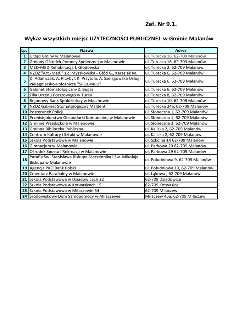 Zał. Nr 9.1. Wykaz wszystkich miejsc UŻYTECZNOŚCI PUBLICZNEJ w Gminie Malanów Lp. 1 2 3 4 5 6 7 8 9 10 11 12 13 14 15 16 17 18 19 20 21 22 23 24 Nazwa Urząd Gminy w Malanowie Gminny Ośrodek Pomocy Społecznej w Malanowie MED-MED Rehablitacja J. Głodowska NZOZ "Art.-Med." s.c. Myszkowska - Głód G., Karasiak M. D. Adamczak, A. Przybył, K. Przytuła, A. Szelągowska Usługi Pielęgniarsko-Położnicze "SPÓŁ-MED" Gabinet Stomatologiczny Z. Bugaj Filia Urzędu Pocztowego w Turku Rejonowy Bank Spółdzielczy w Malanowie NZOZ Gabinet Stomatologiczny Maldent Posterunek Policji Przedsiębiorstwo Gospodarki Komunalnej w Malanowie Gminne Przedszkole w Malanowie Gminna Biblioteka Publiczna Centrum Kultury i Sztuki w Malanowie Szkoła Podstawowa w Malanowie Gimnazjum w Malanowie Ośrodek Sportu i Rekreacji w Malanowie Parafia Św. Stanisława Biskupa Męczennika i Św. Mikołaja Biskupa w Malanowie Agencja PKO Bank Polski Cmentarz Parafialny w Malanowie Szkoła Podstawowa w Dziadowicach 22 Szkoła Podstawowa w Kotwasicach 15 Szkoła Podstawowa w Miłaczewie 34 Środowiskowy Dom Samopomocy w Miłaczewie Adres ul. Turecka 16, 62-709 Malanów ul. Turecka 16, 62-709 Malanów ul. Turecka 2, 62-709 Malanów ul. Turecka 6, 62-709 Malanów ul. Turecka 6, 62-709 Malanów ul. Turecka 6, 62-709 Malanów ul. Turecka 8, 62-709 Malanów ul. Turecka 10, 62-709 Malanów ul. Turecka 24a, 62-709 Malanów ul. Słoneczna 1, 62-709 Malanów ul. Słoneczna 1, 62-709 Malanów ul. Słoneczna 3, 62-709 Malanów ul. Kaliska 2, 62-709 Malanów ul. Kaliska 2, 62-709 Malanów ul. Szkolna 14 62-709 Malanów ul. Parkowa 29 62-709 Malanów ul. Parkowa 29 62-709 Malanów ul. Południowa 9, 62-709 Malanów ul. Południowa 10, 62-709 Malanów ul. Łąkowa , 62-709 Malanów 62-709 Dziadowice 62-709 Kotwasice 62-709 Miłaczew Miłaczew 45a, 62-709 Miłaczew
