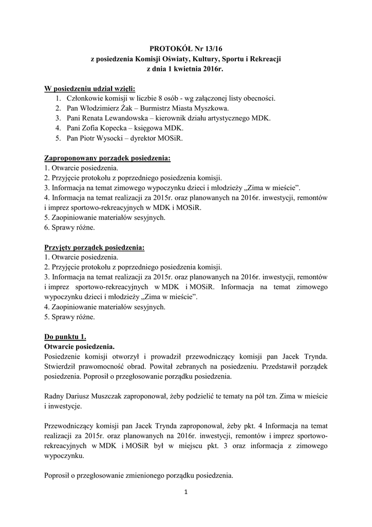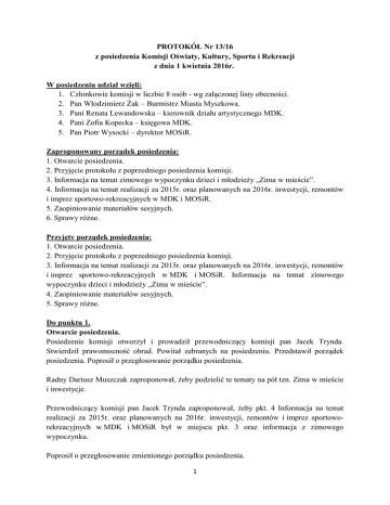 PROTOKÓŁ Nr 13/16 z posiedzenia Komisji Oświaty, Kultury, Sportu i Rekreacji z dnia 1 kwietnia 2016r. W posiedzeniu udział wzięli: 1. Członkowie komisji w liczbie 8 osób - wg załączonej listy obecności. 2. Pan Włodzimierz Żak – Burmistrz Miasta Myszkowa. 3. Pani Renata Lewandowska – kierownik działu artystycznego MDK. 4. Pani Zofia Kopecka – księgowa MDK. 5. Pan Piotr Wysocki – dyrektor MOSiR. Zaproponowany porządek posiedzenia: 1. Otwarcie posiedzenia. 2. Przyjęcie protokołu z poprzedniego posiedzenia komisji. 3. Informacja na temat zimowego wypoczynku dzieci i młodzieży „Zima w mieście”. 4. Informacja na temat realizacji za 2015r. oraz planowanych na 2016r. inwestycji, remontów i imprez sportowo-rekreacyjnych w MDK i MOSiR. 5. Zaopiniowanie materiałów sesyjnych. 6. Sprawy różne. Przyjęty porządek posiedzenia: 1. Otwarcie posiedzenia. 2. Przyjęcie protokołu z poprzedniego posiedzenia komisji. 3. Informacja na temat realizacji za 2015r. oraz planowanych na 2016r. inwestycji, remontów i imprez sportowo-rekreacyjnych w MDK i MOSiR. Informacja na temat zimowego wypoczynku dzieci i młodzieży „Zima w mieście”. 4. Zaopiniowanie materiałów sesyjnych. 5. Sprawy różne. Do punktu 1. Otwarcie posiedzenia. Posiedzenie komisji otworzył i prowadził przewodniczący komisji pan Jacek Trynda. Stwierdził prawomocność obrad. Powitał zebranych na posiedzeniu. Przedstawił porządek posiedzenia. Poprosił o przegłosowanie porządku posiedzenia. Radny Dariusz Muszczak zaproponował, żeby podzielić te tematy na pół tzn. Zima w mieście i inwestycje. Przewodniczący komisji pan Jacek Trynda zaproponował, żeby pkt. 4 Informacja na temat realizacji za 2015r. oraz planowanych na 2016r. inwestycji, remontów i imprez sportoworekreacyjnych w MDK i MOSiR był w miejscu pkt. 3 oraz informacja z zimowego wypoczynku. Poprosił o przegłosowanie zmienionego porządku posiedzenia. 1 Odbyło się głosowanie nad zmianą porządku obrad przyjęciem porządku obrad. W głosowaniu wzięło udział 6 radnych. Przy 6 głosach za, porządek obrad zmieniono jednogłośnie. Odbyło się głosowanie nad przyjęciem porządku obrad. W głosowaniu wzięło udział 6 radnych. Przy 6 głosach za, porządek obrad ze zmianami przyjęto jednogłośnie. Do punktu 2. Przyjęcie protokołu z poprzedniego posiedzenia komisji. Do protokołu uwag nie zgłoszono. Przy 6 głosach za, protokół został przyjęty jednogłośnie. Do punktu 3. Informacja na temat realizacji za 2015r. oraz planowanych na 2016r. inwestycji, remontów i imprez sportowo-rekreacyjnych w MDK i MOSiR. Informacja na temat zimowego wypoczynku dzieci i młodzieży „Zima w mieście”. Przewodniczący komisji pan Jacek Trynda poprosił kierownik działu artystycznego MDK panią Renatę Lewandowską o przedstawienie informacji. Pani Renata Lewandowska kierownik działu artystycznego powiedziała, że tegoroczna „Zima w mieście” trwała dwa tygodnie od 15 – 26 lutego. Było zapisanych około pięćdziesięciorga dzieci. Jak co roku dzieci miały zapewniony posiłek, kanapkę, coś do picia oraz program artystyczno – rozrywkowy i edukacyjny. Na miejscu głównie odbywały się zajęcia głównie rekreacyjno – integracyjne, były organizowane dwie wycieczki, jedna była do teatru w Będzinie, druga wycieczka była w parku śląskim. Były warsztaty różnorodności, składały się z trzech oddzielnych bloków. Jeden blok był przyrodniczy, dzieci obserwowały przyrodę za pomocą mikroskopu. Drugi warsztat dotyczył odnawialnych źródeł energii, to były warsztaty z robotyki, dzieciaki sobie budowały wiatraczek napędzany energią. Trzeci warsztat był ornitologiczny. Byliśmy na jednym przedstawieniu teatralnym w naszej Bibliotece Publicznej. Odwiedziła nas Komenda Powiatowa Policji, były rozmowy na temat bezpiecznego spędzania ferii oraz bezpiecznego zachowania się na drodze. Odwiedziły nas również Panie z Sanepidu, były rozmowy na temat zdrowego odżywiania się. Jeszcze jedna ciekawa wizyta była w jaskiniach w podziemiach MDK, Stowarzyszenie Speleo zorganizowało oprowadzanie, lekcję poglądową i poczęstunek. Dzieci miały okazję uczestniczyć w warsztatach baletowych i teatralnych. Tak wyglądała akcja „Zima w mieście”. Jeżeli chodzi o imprezy zorganizowane w 2015r. tak jak Państwo dostaliście w materiałach wszystkie koncerty się odbyły, koncert inaugurujący rok kulturalno – oświatowy, koncert muzyki klasycznej. Odbyły się również dwudniowe warsztaty Gospel, w których uczestniczyły chór klasyczny MDK oraz młodzież z Młodzieżowej Orkiestry Muzyki Rozrywkowej. Podsumowaniem tych warsztatów był wspólny koncert z chórem z Krakowa. Dzieci z sekcji baletowej miały bal karnawałowy. Był koncert Walentynkowy, spektakl teatru Fajrant, „Operetki czar” koncert największych przebojów operetkowych. Wszystkie imprezy wymienione w materiałach zostały zrealizowane. Jeżeli chodzi o inwestycje w 2015r. odbyło się malowanie sali nr 21 oraz kompleksowy remont sali muzycznej nr 40. Remont się 2 przeciągnął, ponieważ brakło finansów i ze swojej puli dołożyliśmy 2.000 zł, cały koszt był sfinansowany za pieniądze sponsorów, faktury są dostępne w MDK. Został zrobiony parkiet, ściany zostały wyciszone, żeby próby nie przeszkadzały innym sekcjom czy próbom kinowym. Zostały również odrestaurowane deski na scenie, podłoga jest wycyklinowana i odnowiona. Pod koniec roku zakupiliśmy nowy ekran kinowy, ponieważ ekran był stary. Jeżeli chodzi o 2016r. mamy zamiar wyremontować dach, odmalować salę nr 21, która przez załamujący się dach bardzo ucierpiała, odpadały kawałki sufitu. W tym roku zrealizowano wymianę oświetlenia scenicznego, mamy nowe oświetlenie, kolorowe lampy, bardziej oszczędne, podczas spektaklu jest możliwość gry światłem. W związku z tym musiał nastąpić mały remont instalacji elektrycznej. Radna Beat