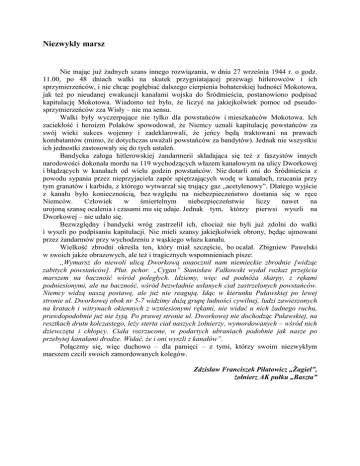Niezwykły marsz Nie mając już żadnych szans innego rozwiązania, w dniu 27 września 1944 r. o godz. 11.00, po 48 dniach walki na skutek przygniatającej przewagi hitlerowców i ich sprzymierzeńców, i nie chcąc pogłębiać dalszego cierpienia bohaterskiej ludności Mokotowa, jak też po nieudanej ewakuacji kanałami wojska do Śródmieścia, postanowiono podpisać kapitulację Mokotowa. Wiadomo też było, że liczyć na jakiejkolwiek pomoc od pseudosprzymierzeńców zza Wisły – nie ma sensu. Walki były wyczerpujące nie tylko dla powstańców i mieszkańców Mokotowa. Ich zaciekłość i heroizm Polaków spowodował, że Niemcy uznali kapitulację powstańców za swój wieki sukces wojenny i zadeklarowali, że jeńcy będą traktowani na prawach kombatantów (mimo, że dotychczas uważali powstańców za bandytów). Jednak nie wszystkie ich jednostki zastosowały się do tych ustaleń. Bandycka załoga hitlerowskiej żandarmerii składająca się też z faszystów innych narodowości dokonała mordu na 119 wychodzących włazem kanałowym na ulicy Dworkowej i błądzących w kanałach od wielu godzin powstańców. Nie dotarli oni do Śródmieścia z powodu sypania przez nieprzyjaciela zapór spiętrzających wodę w kanałach, rzucania przy tym granatów i karbidu, z którego wytwarzał się trujący gaz „acetylenowy”. Dlatego wyjście z kanału było koniecznością, bez względu na niebezpieczeństwo dostania się w ręce Niemców. Człowiek w śmiertelnym niebezpieczeństwie liczy nawet na urojoną szansę ocalenia i czasami mu się udaje. Jednak tym, którzy pierwsi wyszli na Dworkowej – nie udało się. Bezwzględny i bandycki wróg zastrzelił ich, chociaż nie byli już zdolni do walki i wyszli po podpisaniu kapitulacji. Nie mieli szansy jakiejkolwiek obrony, będąc ujmowani przez żandarmów przy wychodzeniu z wąskiego włazu kanału. Wielkość zbrodni określa ten, który miał szczęście, bo ocalał. Zbigniew Pawelski w swoich jakże obrazowych, ale też i tragicznych wspomnieniach pisze: ,,Wymarsz do niewoli ulicą Dworkową unaocznił nam niemieckie zbrodnie [widząc zabitych powstańców]. Plut. pchor. „Cygan” Stanisław Falkowski wydał rozkaz przejścia marszem na baczność wśród poległych. Idziemy, więc od podnóża skarpy, z rękami podniesionymi, ale na baczność, wśród bezwładnie usłanych ciał zastrzelonych powstańców. Niemcy widzą naszą postawę, ale już nie reagują. Idąc w kierunku Puławskiej po lewej stronie ul. Dworkowej obok nr 5-7 widzimy dużą grupę ludności cywilnej, ludzi zawieszonych na kratach i witrynach okiennych z wzniesionymi rękami, nie widać u nich żadnego ruchu, prawdopodobnie już nie żyją. Po prawej stronie ul. Dworkowej nie dochodząc Puławskiej, na resztkach drutu kolczastego, leży sterta ciał naszych żołnierzy, wymordowanych – wśród nich dziewczęta i chłopcy. Ciała rozrzucone, w podartych ubraniach podobnie jak nasze po przebytej kanałami drodze. Widać, że i oni wyszli z kanałów”. Połączmy się, więc duchowo – dla pamięci – z tymi, którzy swoim niezwykłym marszem czcili swoich zamordowanych kolegów. Zdzisław Franciszek Piłatowicz „Żagiel”, żołnierz AK pułku „Baszta” Okładka pisma powstańczego „Baszta” wydawanego na Mokotowie w czasie powstania Zdjęcie autora