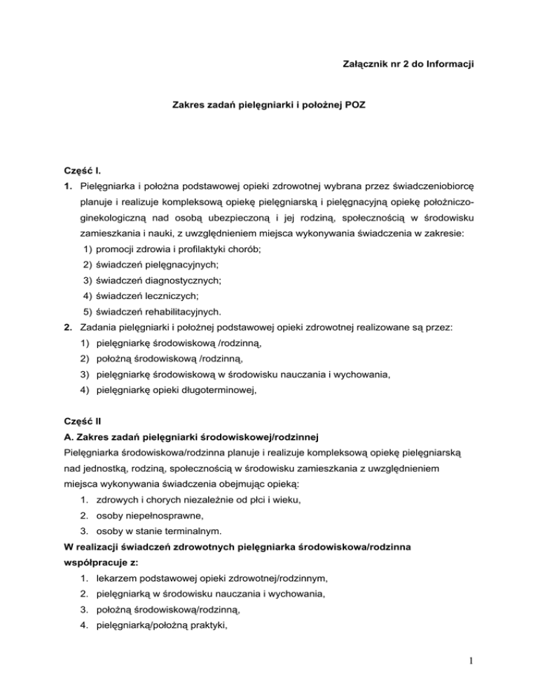 Załącznik nr 2 do Informacji Zakres zadań pielęgniarki i położnej POZ Część I. 1. Pielęgniarka i położna podstawowej opieki zdrowotnej wybrana przez świadczeniobiorcę planuje i realizuje kompleksową opiekę pielęgniarską i pielęgnacyjną opiekę położniczoginekologiczną nad osobą ubezpieczoną i jej rodziną, społecznością w środowisku zamieszkania i nauki, z uwzględnieniem miejsca wykonywania świadczenia w zakresie: 1) promocji zdrowia i profilaktyki chorób; 2) świadczeń pielęgnacyjnych; 3) świadczeń diagnostycznych; 4) świadczeń leczniczych; 5) świadczeń rehabilitacyjnych. 2. Zadania pielęgniarki i położnej podstawowej opieki zdrowotnej realizowane są przez: 1) pielęgniarkę środowiskową /rodzinną, 2) położną środowiskową /rodzinną, 3) pielęgniarkę środowiskową w środowisku nauczania i wychowania, 4) pielęgniarkę opieki długoterminowej, Część II A. Zakres zadań pielęgniarki środowiskowej/rodzinnej Pielęgniarka środowiskowa/rodzinna planuje i realizuje kompleksową opiekę pielęgniarską nad jednostką, rodziną, społecznością w środowisku zamieszkania z uwzględnieniem miejsca wykonywania świadczenia obejmując opieką: 1. zdrowych i chorych niezależnie od płci i wieku, 2. osoby niepełnosprawne, 3. osoby w stanie terminalnym. W realizacji świadczeń zdrowotnych pielęgniarka środowiskowa/rodzinna współpracuje z: 1. lekarzem podstawowej opieki zdrowotnej/rodzinnym, 2. pielęgniarką w środowisku nauczania i wychowania, 3. położną środowiskową/rodzinną, 4. pielęgniarką/położną praktyki, 1 5. pielęgniarką opieki długoterminowej, 6. innymi Świadczeniodawcami zgodnie z potrzebami podopiecznych , 7. przedstawicielami organizacji i instytucji działających na rzecz zdrowia rodziny. 1. Świadczenia w zakresie promocji zdrowia i profilaktyki. 1) Rozpoznawanie, ocena i zapobieganie zagrożeniom zdrowotnym podopiecznych. 2) Rozpoznawanie potrzeb pielęgnacyjnych i problemów zdrowotnych podopiecznych. 3) Prowadzenie edukacji zdrowotnej w tym dokonywanie oceny poziomu wiedzy, umiejętności i motywacji podopiecznych do zachowań prozdrowotnych. 4) Prowadzenie poradnictwa w zakresie zdrowego stylu życia. 5) Realizacja programów promocji zdrowia i profilaktyki chorób. 6) Organizacja grup wsparcia. 7) Realizacja szczepień ochronnych 8) Prowadzenie działań profilaktycznych u podopiecznych z grup ryzyka zdrowotnego. 2. Świadczenia diagnostyczne. 1) Przeprowadzanie wywiadów środowiskowych. 2) Wykonywanie badania fizykalnego. 3) Wykonywanie pomiarów i ich ocena. 4) Wykonywanie testów. 5) Prowadzenie bilansu wodnego 6) Ocena stanu ogólnego chorego oraz procesu jego zdrowienia 7) Ocena i monitorowanie bólu w opiece paliatywnej 3. Świadczenia pielęgnacyjne. 1) Realizacja opieki pielęgnacyjnej u pacjentów w różnych fazach życia i choroby zgodnie z aktualną wiedzą medyczną i współczesnymi standardami opieki pielęgniarskiej. 2) Wykonywanie zabiegów pielęgnacyjnych. 3) Przygotowywanie do samoopieki i samopielęgnacji w chorobie i niepełnosprawności. 4. Świadczenia lecznicze. 1) Ustalanie diety w żywieniu przewlekle chorych 2) Dobór technik karmienia w zależności od stanu chorego 3) Zabiegi z zastosowaniem ciepła i zimna 4) Cewnikowanie pęcherza 5) Wykonywanie wlewów doodbytniczych. 6) Podawanie leków różnymi drogami i technikami. 7) Wykonywanie zleceń lekarskich. 8) Zakładanie opatrunków ran, odleżyn, oparzeń. 9) Wykonywanie zabiegów pielęgnacyjno-leczniczych w stomiach, przetokach i ranach trudno gojących 2 10) Wykonywanie inhalacji, doraźne podawanie tlenu. 11) Zdejmowanie szwów. 12) Stawianie baniek lekarskich. 13) Udzielanie pierwszej pomocy w stanach zagrożenia życia i w nagłych zachorowaniach w tym prowadzenie resuscytacji krążeniowo-oddechowej. 5. Świadczenia usprawniające. 1) Koordynacja i współdziałanie w rehabilitacji przyłóżkowej w celu zapobiegania powikłaniom wynikającym z procesu chorobowego, długotrwałego unieruchomienia i stosowania udogodnień. 2) Usprawnienie ruchowe. 3) Drenaż ułożeniowy, prowadzenie gimnastyki oddechowej. 4) Ćwiczenia ogólnousprawniające. B. Zakres zadań położnej środowiskowej/rodzinnej Położna środowiskowa/rodzinna realizuje kompleksową pielęgnacyjną opiekę położniczoginekologiczną obejmującą: 1. edukację w zakresie planowania rodziny, 2. opiekę w okresie ciąży, porodu i połogu 3. opiekę nad kobietą, noworodkiem, niemowlęciem i rodziną, 4. opiekę w schorzeniach ginekologicznych i onkologicznych, 5. opiekę nad kobieta w każdym okresie jej życia. W realizacji świadczeń zdrowotnych położna środowiskowa/rodzinna współpracuje z: 1. lekarzem ginekologiem / położnikiem udzielającym świadczeń specjalistycznych w obszarze jej działania, 2. pielęgniarką/położną praktyki 3. lekarzem podstawowej opieki zdrowotnej/rodzinnym, 4. pielęgniarką środowiskową/rodzinną, 5. pielęgniarką w środowisku nauczania i wychowania, 6. pielęgniarką opieki długoterminowej, 7. innymi Świadczeniodawcami zgodnie z potrzebami podopiecznych, 8. przedstawicielami organizacji i instytucji działających na rzecz zdrowia rodziny. 1. Świadczenia w zakresie promocji zdrowia i profilaktyki 1) Diagnozowanie, ocena i zapobieganie zagrożeniom zdrowotnym kobiet w przebiegu ciąży. 2) Ocena zagrożeń zdrowotnych wynikających z działania czynników szkodliwych w środowisku. 3 3) Edukacja kobiety we wszystkich okresach życia do prowadzenia samoobserwacji, do podejmowania działań wczesnego wykrywania i likwidacji czynników ryzyka nowotworowego. 4) Poradnictwo w zakresie samoopieki i samopielęgnacji w zdrowiu, profilaktyce chorób. 5) Edukacji prozdrowotna. 6) Organizacja grup wsparcia. 7) Prowadzenie czynnego poradnictwa w zakresie profilaktyki chorób wieku dziecięcego i chorób ginekologicznych, onkologicznych. 8) Prowadzenie programu przygotowania do porodu z uwzględnieniem porodu