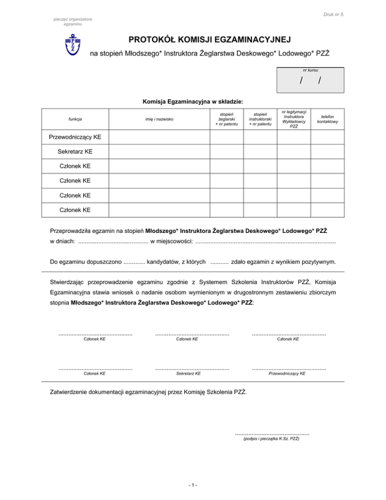 Druk nr 5. pieczęć organizatora egzaminu PROTOKÓŁ KOMISJI EGZAMINACYJNEJ na stopień Młodszego* Instruktora Żeglarstwa Deskowego* Lodowego* PZŻ nr kursu / / Komisja Egzaminacyjna w składzie: funkcja stopień żeglarski + nr patentu imię i nazwisko stopień instruktorski + nr patentu nr legitymacji Instruktora Wykładowcy PZŻ telefon kontaktowy Przewodniczący KE Sekretarz KE Członek KE Członek KE Członek KE Członek KE Przeprowadziła egzamin na stopień Młodszego* Instruktora Żeglarstwa Deskowego* Lodowego* PZŻ w dniach: .......................................... w miejscowości: .................................................................................... Do egzaminu dopuszczono ............. kandydatów, z których ........... zdało egzamin z wynikiem pozytywnym. Stwierdzając przeprowadzenie egzaminu zgodnie z Systemem Szkolenia Instruktorów PZŻ, Komisja Egzaminacyjna stawia wniosek o nadanie osobom wymienionym w drugostronnym zestawieniu zbiorczym stopnia Młodszego* Instruktora Żeglarstwa Deskowego* Lodowego* PZŻ: ............................................. Członek KE ............................................. Członek KE ............................................. ............................................. Członek KE Członek KE ............................................. ............................................. Sekretarz KE Przewodniczący KE Zatwierdzenie dokumentacji egzaminacyjnej przez Komisję Szkolenia PZŻ. ............................................. (podpis i pieczątka K.Sz. PZŻ) -1- Druk nr 5. pieczęć organizatora egzaminu ZESTAWIENIE ZBIORCZE DO PROTOKOŁU KE nr ........ /........ /........ na stopień Młodszego* Instruktora Żeglarstwa Deskowego* Lodowego* PZŻ lp. imię i nazwisko ocena ogólna egzaminu opłata za egzamin opłata za patent 1. 2. 3. 4. 5. 6. 7. 8. 9. 10. 11. 12. 13. 14. 15. 16. 17. 18. 19. 20. 21. 22. 23. 24. 25. RAZEM .................................................. , dnia ............................ (miejscowość) ............................................. .............................................. (podpis i pieczątka Sekretarza KE) (podpis i pieczątka Przewodniczącego KE) -2- uwagi