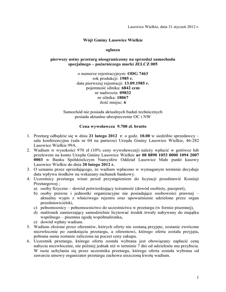 Lasowice Wielkie, dnia 31 styczeń 2012 r. Wójt Gminy Lasowice Wielkie ogłasza pierwszy ustny przetarg nieograniczony na sprzedaż samochodu specjalnego – pożarniczego marki JELCZ 005 o numerze rejestracyjnym: ODG 7463 rok produkcji: 1985 r. data pierwszej rejestracji: 13.09.1985 r. pojemność silnika: 6842 ccm nr nadwozia: 09832 nr silnika: 18067 ilość miejsc: 6 Samochód nie posiada aktualnych badań technicznych posiada aktualne ubezpieczenie OC i NW Cena wywoławcza 9.700 zł. brutto 1. Przetarg odbędzie się w dniu 21 lutego 2012 r. o godz. 10.00 w siedzibie sprzedawcy – sala konferencyjna (sala nr 04 na parterze) Urzędu Gminy Lasowice Wielkie, 46-282 Lasowice Wielkie 99A. 2. Wadium w wysokości 970 zł (10% ceny wywoławczej) należy wpłacić w gotówce lub przelewem na konto Urzędu Gminy Lasowice Wielkie nr 08 8890 1053 0000 1094 2007 0003 w Banku Spółdzielczym Namysłów Oddział Lasowice Małe punkt kasowy Lasowice Wielkie do dnia 20 lutego 2012 r. 3. O uznaniu przez sprzedającego, że wadium wpłacono w wymaganym terminie decyduje data wpływu środków na wskazany rachunek bankowy. 4. Uczestnicy przetargu winni przed przystąpieniem do licytacji przedstawić Komisji Przetargowej ; a) osoby fizyczne – dowód potwierdzający tożsamość (dowód osobisty, paszport), b) osoby prawne i jednostki organizacyjne nie posiadające osobowości prawnej – aktualny wypis z właściwego rejestru oraz upoważnienie udzielone przez organ przedstawicielski, c) pełnomocnicy – pełnomocnictwo do uczestnictwa w przetargu (w formie pisemnej), d) małżonek zamierzający samodzielnie licytować środek trwały nabywany do majątku wspólnego – pisemna zgodę współmałżonka, e) dowód wpłaty wadium. 5. Wadium złożone przez oferentów, których oferty nie zostaną przyjęte, zostanie zwrócone niezwłocznie po zamknięciu przetargu, a oferentowi, którego oferta została przyjęta, pobrana suma zostanie zaliczona na poczet ceny zakupu. 6. Uczestnik przetargu, którego oferta została wybrana jest obowiązany zapłacić cenę nabycia niezwłocznie, nie później jednak niż w terminie 7 dni od udzieleniu mu przybicia. W razie uchylania się przez uczestnika przetargu, którego oferta została wybrana od zawarcia umowy organizator przetargu zachowa uiszczoną kwotę wadium. 1 7. Z regulaminem przetargu można zapoznać się w Urzędzie Gminy Lasowice Wielkie, pokój nr 3 , I p. jak również na stronie www.bip.lasowicewielkie.pl 8. Samochód można oglądać w dniach od 09.02.2012 r. do 20.02.2012 r. od poniedziałku do piątku w godz. 9.00 – 14.00 w Gronowicach – remiza OSP, w uzgodnieniu z Panem Józefem Kubicą ( tel. 77 - 413 22 02 ). 9. Wójt Gminy Lasowice Wielkie zastrzega sobie prawo unieważnienia przetargu bez podania przyczyny. Wójt Gminy Lasowice Wielkie Daniel Gagat 2