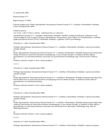 Zarząd Ronson Europe N.V. z siedzibą w Rotterdamie, Holandia ("Spółka") podaje do publicznej wiadomości treść