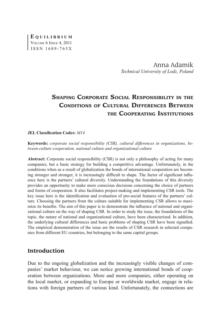 Equilibrium Volume 6 Issue 4, 2011 ISSN 1689-765X Anna Adamik Technical University of Lodz, Poland Shaping Corporate Social Responsibility in the Conditions of Cultural Differences Between the Cooperating Institutions JEL Classification Codes: M14 Keywords: corporate social responsibility (CSR), cultural differences in organizations, between-culture cooperation, national culture and organizational culture Abstract: Corporate social responsibility (CSR) is not only a philosophy of acting for many companies, but a basic strategy for building a competitive advantage. Unfortunately, in the conditions when as a result of globalization the bonds of international cooperation are becoming stronger and stronger, it is increasingly difficult to shape. The factor of significant influence here is the partners’ cultural diversity. Understanding the foundations of this diversity provides an opportunity to make more conscious decisions concerning the choice of partners and forms of cooperation. It also facilitates project-making and implementing CSR tools. The key issue here is the identification and evaluation of pro-social features of the partners’ culture. Choosing the partners from the culture suitable for implementing CSR allows to maximize its benefits. The aim of this paper is to demonstrate the influence of national and organizational culture on the way of shaping CSR. In order to study the issue, the foundations of the topic, the nature of national and organizational culture, have been characterized. In addition, the underlying cultural differences and basic problems of shaping CSR have been signalled. The empirical demonstration of the issue are the results of CSR research in selected companies from different EU countries, but belonging to the same capital groups. Introduction Due to the ongoing globalization and the increasingly visible changes of companies’ market behaviour, we can notice growing international bonds of cooperation between organizations. More and more companies, either operating on the local market, or expanding to Europe or worldwide market, engage in relations with foreign partners of various kind. Unfortunately, the connections are 80 Anna Adamik not as lasting and beneficial as both parties would wish. There is much evidence that an important reason for this type of problems is cultural mismatch or misunderstandings. Often originating from different cultures (both national and organizational), the partners perceive and evaluate the world differently, and not infrequently make contact with it and react to changes in a way which is incomprehensible for the other party. There is also a difference in a way they treat their social responsibility. It is the differing values and behavior types that actually form the character of an organization (its personality) distinct for each culture, as well as its potential, which together can significantly determine (strengthen or limit) the economic effectiveness of the parties which originate from it1. It is worth analyzing the origins of such phenomena (the stronger influence of some cultures on higher efficiency and faster development of organizations originating from it) and how to use the knowledge to improve the efficiency of organizing international connections for cooperation between companies. It is also crucial to identify the influence of cultural differences on the perception, as well as extent and effectiveness of socially responsible actions (CSR) taken by the partners, as for many companies social responsibility is not only the accepted philosophy of conduct, but a strategy for building up competitive advantage based on ensuring lasting values not only to direct participants, but other stakeholders as well. Thus, the aim of this paper will be demonstration of the role and influence of culture (national and organizational) on way of shaping social responsibility of companies involved in international connections. Theoretical analyses will be supported by the results of studies in several companies which are parts of two international capital groups: Recticel, with headquarters in Belgium, and Eurofoam, with headquarters in Austria. The nature of companies’ culture and cultural differences Organizations differ not only with their size, structure or the type of operations, but also culture. There are three basic reasons for cultural differences among 1 Such potential is built, for example, by Western-European culture. As it was already noticed in 1820, the West of Europe and its colonies and territories related to it (Australia, New Zealand, Canada and the USA) outdid other countries in terms of their income per capita. Over the years, the results have been confirmed by numerous studies, like the ones proving that in 1990 among the 30 richest countries in the world, as many as 21 were from Western Europe, or were related to it (the remaining ones were Japan, South Korea, Hong kong, Singapore, Taiwan and Kuwait, the United Arab Emirates, Chile and Israel). Although the population of the richest countries constitutes merely 16 per cent of the Earth population, it generates 87 per cent of scientific publications and 99 per cent of all European patents (Lewandowski 2008, p. 57). Shaping Corporate Social Responsibility in the Conditions of Cultural... 81 companies: 1) organizations are formed in a given cultural environment, which means a country of particular national culture and a region of distinctive regional culture, 2) each organization creates its own organizational culture, which is in some way a derivative of values followed by its management and employees (people coming from a given region, country, followers of a given religion, brought up in certain environments and according to certain family traditions), 3) culture is an entity composed of cognitive, emotional, intellectual and interpersonal elements of psychological and mental life; the whole of skills an individual acquires, uses and processes while taking