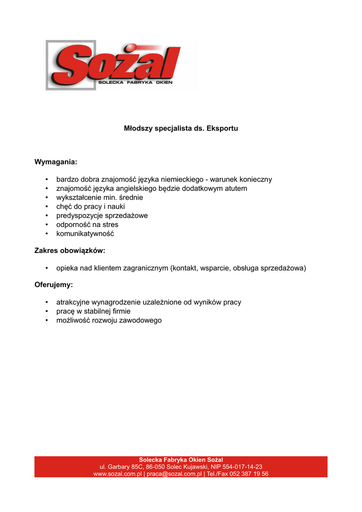 Młodszy specjalista ds. Eksportu Wymagania: • • • • • • • bardzo dobra znajomość języka niemieckiego - warunek konieczny znajomość języka angielskiego będzie dodatkowym atutem wykształcenie min. średnie chęć do pracy i nauki predyspozycje sprzedażowe odporność na stres komunikatywność Zakres obowiązków: • opieka nad klientem zagranicznym (kontakt, wsparcie, obsługa sprzedażowa) Oferujemy: • • • atrakcyjne wynagrodzenie uzależnione od wyników pracy pracę w stabilnej firmie możliwość rozwoju zawodowego Solecka Fabryka Okien Sożal ul. Garbary 85C, 86-050 Solec Kujawski, NIP 554-017-14-23 www.sozal.com.pl | [email protected] | Tel./Fax 052 387 19 56