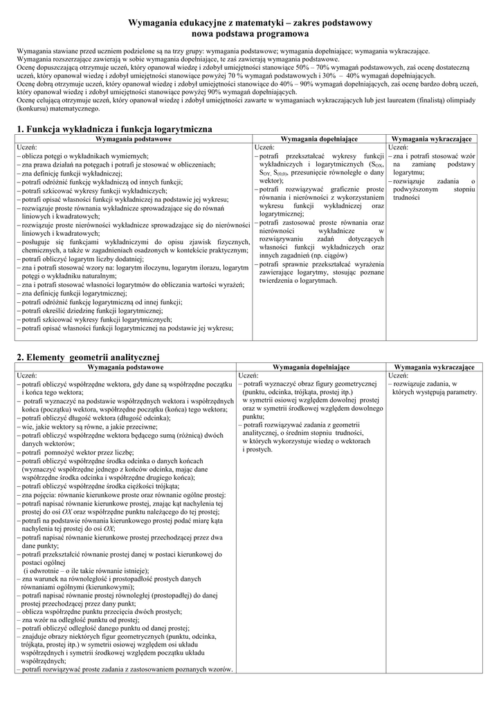 Wymagania edukacyjne z matematyki – zakres podstawowy nowa podstawa programowa Wymagania stawiane przed uczniem podzielone są na trzy grupy: wymagania podstawowe; wymagania dopełniające; wymagania wykraczające. Wymagania rozszerzające zawierają w sobie wymagania dopełniające, te zaś zawierają wymagania podstawowe. Ocenę dopuszczającą otrzymuje uczeń, który opanował wiedzę i zdobył umiejętności stanowiące 50% – 70% wymagań podstawowych, zaś ocenę dostateczną uczeń, który opanował wiedzę i zdobył umiejętności stanowiące powyżej 70 % wymagań podstawowych i 30% – 40% wymagań dopełniających. Ocenę dobrą otrzymuje uczeń, który opanował wiedzę i zdobył umiejętności stanowiące do 40% – 90% wymagań dopełniających, zaś ocenę bardzo dobrą uczeń, który opanował wiedzę i zdobył umiejętności stanowiące powyżej 90% wymagań dopełniających. Ocenę celującą otrzymuje uczeń, który opanował wiedzę i zdobył umiejętności zawarte w wymaganiach wykraczających lub jest laureatem (finalistą) olimpiady (konkursu) matematycznego. 1. Funkcja wykładnicza i funkcja logarytmiczna Wymagania podstawowe Uczeń: − oblicza potęgi o wykładnikach wymiernych; − zna prawa działań na potęgach i potrafi je stosować w obliczeniach; − zna definicję funkcji wykładniczej; − potrafi odróżnić funkcję wykładniczą od innych funkcji; − potrafi szkicować wykresy funkcji wykładniczych; − potrafi opisać własności funkcji wykładniczej na podstawie jej wykresu; − rozwiązuje proste równania wykładnicze sprowadzające się do równań liniowych i kwadratowych; − rozwiązuje proste nierówności wykładnicze sprowadzające się do nierówności liniowych i kwadratowych; − posługuje się funkcjami wykładniczymi do opisu zjawisk fizycznych, chemicznych, a także w zagadnieniach osadzonych w kontekście praktycznym; − potrafi obliczyć logarytm liczby dodatniej; − zna i potrafi stosować wzory na: logarytm iloczynu, logarytm ilorazu, logarytm potęgi o wykładniku naturalnym; − zna i potrafi stosować własności logarytmów do obliczania wartości wyrażeń; − zna definicję funkcji logarytmicznej; − potrafi odróżnić funkcję logarytmiczną od innej funkcji; − potrafi określić dziedzinę funkcji logarytmicznej; − potrafi szkicować wykresy funkcji logarytmicznych; − potrafi opisać własności funkcji logarytmicznej na podstawie jej wykresu; Wymagania dopełniające Wymagania wykraczające Uczeń: Uczeń: − potrafi przekształcać wykresy funkcji − zna i potrafi stosować wzór wykładniczych i logarytmicznych (SOX, na zamianę podstawy SOY, S(0,0), przesunięcie równoległe o dany logarytmu; wektor); − rozwiązuje zadania o stopniu − potrafi rozwiązywać graficznie proste podwyższonym równania i nierówności z wykorzystaniem trudności wykresu funkcji wykładniczej oraz logarytmicznej; − potrafi zastosować proste równania oraz nierówności wykładnicze w rozwiązywaniu zadań dotyczących własności funkcji wykładniczych oraz innych zagadnień (np. ciągów) − potrafi sprawnie przekształcać wyrażenia zawierające logarytmy, stosując poznane twierdzenia o logarytmach. 2. Elementy geometrii analitycznej Wymagania podstawowe Wymagania dopełniające Wymagania wykraczające Uczeń: Uczeń: Uczeń: – rozwiązuje zadania, w − potrafi obliczyć współrzędne wektora, gdy dane są współrzędne początku – potrafi wyznaczyć obraz figury geometrycznej (punktu, odcinka, trójkąta, prostej itp.) których występują parametry. i końca tego wektora; − potrafi wyznaczyć na podstawie współrzędnych wektora i współrzędnych w symetrii osiowej względem dowolnej prostej oraz w symetrii środkowej względem dowolnego końca (początku) wektora, współrzędne początku (końca) tego wektora; punktu; − potrafi obliczyć długość wektora (długość odcinka); – potrafi rozwiązywać zadania z geometrii − wie, jakie wektory są równe, a jakie przeciwne; analitycznej, o średnim stopniu trudności, − potrafi obliczyć współrzędne wektora będącego sumą (różnicą) dwóch w których wykorzystuje wiedzę o wektorach danych wektorów; i prostych. − potrafi pomnożyć wektor przez liczbę; − potrafi obliczyć współrzędne środka odcinka o danych końcach (wyznaczyć współrzędne jednego z końców odcinka, mając dane współrzędne środka odcinka i współrzędne drugiego końca); − potrafi obliczyć współrzędne środka ciężkości trójkąta; − zna pojęcia: równanie kierunkowe proste oraz równanie ogólne prostej: − potrafi napisać równanie kierunkowe prostej, znając kąt nachylenia tej prostej do osi OX oraz współrzędne punktu należącego do tej prostej; − potrafi na podstawie równania kierunkowego prostej podać miarę kąta nachylenia tej prostej do osi OX; − potrafi napisać równanie kierunkowe prostej przechodzącej przez dwa dane punkty; − potrafi przekształcić równanie prostej danej w postaci kierunkowej do postaci ogólnej (i odwrotnie – o ile takie równanie istnieje); – zna warunek na równoległość i prostopadłość prostych danych równaniami ogólnymi (kierunkowymi); – potrafi napisać równanie prostej równoległej (prostopadłej) do danej prostej przechodzącej przez dany punkt; – oblicza współrzędne punktu przecięcia dwóch prostych; – zna wzór na odległość punktu od prostej; – potrafi obliczyć odległość danego punktu od danej prostej; – znajduje obrazy niektórych figur geometrycznych (punktu, odcinka, trójkąta, prostej itp.) w symetrii osiowej względem osi układu współrzędnych i symetrii środkowej względem początku układu współrzędnych; – potrafi rozwiązywać proste zadania z zastosowaniem poznanych wzorów. 3. Kombinatoryka i rachunek prawdopodobieństwa, elementy statystyki opisowej Wymagania podstawowe Uczeń: − zlicza obiekty w prostych sytuacjach kombi