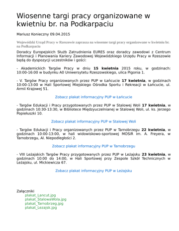 Wiosenne targi pracy organizowane w kwietniu br. na Podkarpaciu Mariusz Konieczny 09.04.2015 Wojewódzki Urząd Pracy w Rzeszowie zaprasza na wiosenne targi pracy organizowane w kwietniu br. na Podkarpaciu Doradcy Europejskich Służb Zatrudnienia EURES oraz doradcy zawodowi z Centrum Informacji i Planowania Kariery Zawodowej Wojewódzkiego Urzędu Pracy w Rzeszowie będą do dyspozycji uczestników i gości: - Akademickich Targów Pracy w dniu 15 kwietnia 2015 roku, w godzinach: 10:00-16:00 w budynku A0 Uniwersytetu Rzeszowskiego, ulica Pigonia 1. - V. Targów Pracy organizowanych przez PUP w Łańcucie 17 kwietnia, w godzinach 10:00-13:00 w Hali Sportowej Miejskiego Ośrodka Sportu i Rekreacji w Łańcucie, ul. Armii Krajowej 51. Zobacz plakat informacyjny PUP w Łańcucie - Targów Edukacji i Pracy przygotowanych przez PUP w Stalowej Woli 17 kwietnia, w godzinach 10:30-13:30, w Bibliotece Międzyuczelnianej w Stalowej Woli, ul. ks. Jerzego Popiełuszki 10. Zobacz plakat informacyjny PUP w Stalowej Woli - Targów Edukacji i Pracy organizowanych przez PUP w Tarnobrzegu 22 kwietnia, w godzinach 10:00-13:00, w hali widowiskowo-sportowej MOSiR im. A. Freyera, w Tarnobrzegu, Al. Niepodległości 2. Zobacz plakat informacyjny PUP w Tarnobrzegu - VIII Leżajskich Targów Pracy przygotowanych przez PUP w Leżajsku 23 kwietnia, w godzinach 10:00 do 14:00, w Hali Sportowej przy Zespole Szkół Technicznych w Leżajsku, ul. Mickiewicza 67. Zobacz plakat informacyjny PUP w Leżajsku Załączniki plakat_Lancut.jpg plakat_StalowaWola.jpg plakat_Tarnobrzeg.jpg plakat_Lezajsk.jpg