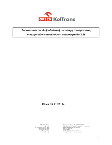 Zaproszenie do akcji ofertowej na usługę transportową maszynistów samochodem osobowym do 3,5t Płock 19.11.2012r. ORLEN KolTrans Sp. z o.o. ul. Chemików 7, 09-411 Płock tel. (+48 24) 256 64 44 fax (+48 24) 367 90 14 [email protected] www.orlenkoltrans.pl Rejestr Przedsiębiorców Nr KRS 0000028251 Sąd Rejonowy XIV Wydział Gospodarczy w Warszawie Kapitał zakładowy: 40.859.000,00 zł NIP: 774-26-58-299 Zarząd Spółki: Jarosław Szaliński – Prezes Zarządu Andrzej Łobodziński – Członek Zarządu 1 I. Zlecający : ORLEN KolTrans Sp. z o.o. 09-411 Płock Ul. Chemików 7 NIP: 774-26-58-299 http://www.orlenkoltrans.pl, II. Informacje o postępowaniu ofertowym : Postępowanie ofertowe prowadzone jest według wewnętrznych procedur obowiązujących w ORLEN KolTrans Sp. z o.o. III. Przedmiot zlecenia: Usługa transportowa od 2 do 4 maszynistów samochodami osobowymi do 3,5t na n/w trasach: 1. Trasy z Płocka ok. 20 000 km/miesięcznie: • Płock-Kutno-Płock • Płock-Sierpc-Płock • Płock-Warszawa Główna Towarowa - Płock • Płock-Nasielsk-Płock • Płock-Tłuszcz -Płock • Kutno-Poznań • Inne zlecone na szlakach obsługiwanych przez ORLEN KolTrans Sp. z o.o. tj.: Płock-Emilianów, Płock-Gutkowo, Płock-Sokółka, Płock-Świnoujście, jazdy lokalne np. PKN ORLEN - Stara Biała, itp. Do wykonywania usługi transportowej na w/w trasach wymagamy min. 2 samochodów osobowych. 2. Trasy z Ostrowa Wielkopolskiego ok. 10 000 km/miesięcznie • Ostrów Wlkp.- Piekary Śląskie Szarlej (Radzionków) - Ostrów Wlkp. • Ostrów Wlkp.- Wrocław Swojczyce - Ostrów Wlkp. • Ostrów Wlkp.- Nowa Sól - Ostrów Wlkp. • Ostrów Wlkp.- Szczecin - Ostrów Wlkp. • Inne zlecone Do wykonywania usługi transportowej na w/w trasach wymagamy min. 1 samochód osobowy. Uwaga: 1. ORLEN KolTrans Sp. z o. o dopuszcza możliwość złożenia oferty częściowej na trasy z Płocka lub trasy z Ostrowa Wlkp. 2. Średnia miesięczna ilość km może ulec zmianie w trakcie trwania umowy. IV. Wymogi formalne: Warunkiem przyjęcia oferty jest przedłożenie części technicznej i części handlowej w oddzielnych zamkniętych opisanych kopertach. Oferty nie spełniające powyższego nie będą rozpatrywane i zostaną odesłane do nadawcy. 2 Część techniczna: 1. Nazwa firmy, adres, telefon kontaktowy, fax. 2. Nazwiska osób reprezentujących firmę. Odpis z Krajowego Rejestru Sądowego, w przypadku spółek Prawa Handlowego, lub zaświadczenie o wpisie do ewidencji działalności gospodarczej w przypadku osób fizycznych. 3. Decyzja w sprawie nadania nr Identyfikacji Podatkowej NIP. 4. Podpisane Oświadczenie oferentów PZSZ07/F01 – załącznik nr 1. 5. Wskazanie osoby do kontaktu sprawującej nadzór nad ofertą. 6. Termin ważności oferty (nie krócej niż do 31.12.2013r.) 7. Czas reakcji od chwili telefonicznego powiadomienia przez Dyspozytora ORLEN KolTrans max 2h. 8. Dyspozycyjność 24 godziny na dobę, 7 dni w tygodniu, 365 dni w roku. 9. Samochody muszą posiadać ważne ubezpieczenie OC, NW oraz przegląd techniczny. Część handlowa: 1. Stawka jednostkowa netto za km. 2. Deklaracja niezmienności stawki w okresie obowiązywania umowy tj. do 31.12.2013r. 3. Sposób rozliczenia – z uwzględnieniem 30 dniowego terminu płatności faktur licząc od dnia otrzymania przez ORLEN KolTrans Sp. z o.o. prawidłowo wystawionej faktury, tj. jedna faktura na koniec miesiąca. 4. Warunkiem zapłacenia faktury VAT będzie załącznik pod fakturę miesięczną zawierający następujące dane: data przejazdu, trasa przejazdu, długość trasy (przejechane kilometry), dane osoby przewożonej (imię i nazwisko maszynisty). Długość trasy weryfikowana będzie np. przy wykorzystaniu Google Maps. 5. W stawce należy uwzględnić wszystkie opłaty dodatkowe związane z realizacją przedmiotu zlecenia/umowy. 6. Kryterium wyboru Oferenta jest stawka jednostkowa netto za 1km. Pytania dodatkowe dotyczące zakresu ogłoszonej akcji ofertowej prosimy przesyłać na adres email: [email protected]. Odpowiedź będzie przekazywana tą samą drogą. V. Sposób złożenia oferty: Oferta winna być podpisana przez osoby uprawnione do reprezentowania firmy i składać się z dwóch części: technicznej i handlowej. Ofertę należy przesłać w opisanych i zamkniętych kopertach w terminie do dnia 30-11-2012 roku do godz. 14.00 do sekretariatu Prezesa Zarządu ORLEN KolTrans Sp. z o.o. na ul. Chemików 7, 09-411 Płock. Na obydwu kopertach należy podać nazwę, dokładny adres Oferenta, tytuł zaproszenia do składania ofert: „akcja ofertowa na transport maszynistów” oraz wskazać część techniczną i część handlową. VI. Zastrzeżenia zapraszającego do składania ofert: 1. ORLEN KolTrans Sp. z o. o. zastrzega sobie prawo do dowolnego wyboru podmiotu/podmiotów, z którymi będą prowadzone negocjacje w odniesieniu do części lub całości zakresu złożonych odpowiedzi oraz do zawarcia umowy z więcej niż jednym dostawcą wyłonionym w drodze negocjacji, przy czym 3 2. 3. 4. 5. 6. 7. zakres umowy może obejmować całość lub część zakresu złożonej odpowiedzi na zapytanie ofertowe. ORLEN KolTrans Sp. z o. o. zastrzega sobie prawo do odwołania zamknięcia procesu wyboru dostawcy i odstąpienia od negocjacji bez podania przyczyn. Z tego tytułu nie przysługują żadne roszczenia wobec zapraszającego. Niniejsze zapytanie stanowi zaproszenie do negocjacji w rozumieniu art. 72 k.c. Oferent ponosi wszystkie koszty związane z przygotowaniem i złożeniem oferty i nie przysługuje mu prawo do zwrotu tych kosztów. Wyboru oferenta wg przedstawionych kryteriów oceny. Dokonania korekt i uściśleń zakresu w trakcie analizy ofert, proszenia o ewentualną jego aktualizację. Przeprowadzenie dodatkowych negocjacji cen. Z poważaniem Przewodniczący Zespołu Oceniającego Trawiński Robert 4 Załącznik nr 1 PZSZ07/F01 Oświadczenie Oferenta Dotyczy postępowania na: usługę transportową maszyn