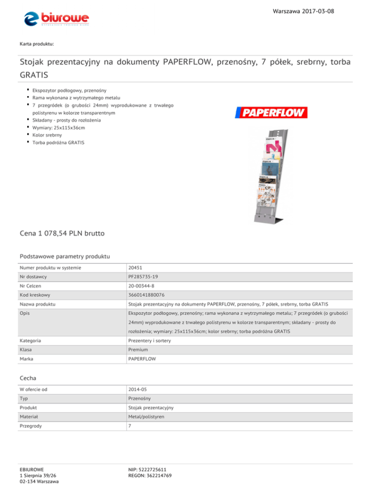 Warszawa 2017-03-08 Karta produktu: Stojak prezentacyjny na dokumenty PAPERFLOW, przenośny, 7 półek, srebrny, torba GRATIS Ekspozytor podłogowy, przenośny Rama wykonana z wytrzymałego metalu 7 przegródek (o grubości 24mm) wyprodukowane z trwałego polistyrenu w kolorze transparentnym Składany - prosty do rozłożenia Wymiary: 25x115x36cm Kolor srebrny Torba podróżna GRATIS Cena 1 078,54 PLN brutto Podstawowe parametry produktu Numer produktu w systemie 20451 Nr dostawcy PF285735-19 Nr Celcen 20-00344-8 Kod kreskowy 3660141880076 Nazwa produktu Stojak prezentacyjny na dokumenty PAPERFLOW, przenośny, 7 półek, srebrny, torba GRATIS Opis Ekspozytor podłogowy, przenośny; rama wykonana z wytrzymałego metalu; 7 przegródek (o grubości 24mm) wyprodukowane z trwałego polistyrenu w kolorze transparentnym; składany - prosty do rozłożenia; wymiary: 25x115x36cm; kolor srebrny; torba podróżna GRATIS Kategoria Prezentery i sortery Klasa Premium Marka PAPERFLOW Cecha W ofercie od 2014-05 Typ Przenośny Produkt Stojak prezentacyjny Materiał Metal/polistyren Przegrody 7 EBIUROWE 1 Sierpnia 39/26 02-134 Warszawa NIP: 5222725611 REGON: 362214769 Warszawa 2017-03-08 Karta katalogowa produktu cd. Stojak prezentacyjny na dokumenty PAPERFLOW, przenośny, 7 półek, srebrny, torba GRATIS Wymiary Wymiary (mm) 250x1150x360 Rozmiar 7 półek Wspólny słownik zamówień CPV 30193500-3 Stojak na materiały reklamowe Ilość Ilość kartek B.d. Certyfikaty Nowy produkt w ofercie Standard Hit Standard Kolor Kolor Srebrny Pozostałe zdjęcia produktu Serdecznie zapraszamy do współpracy EBIUROWE zespół. EBIUROWE 1 Sierpnia 39/26 02-134 Warszawa NIP: 5222725611 REGON: 362214769
