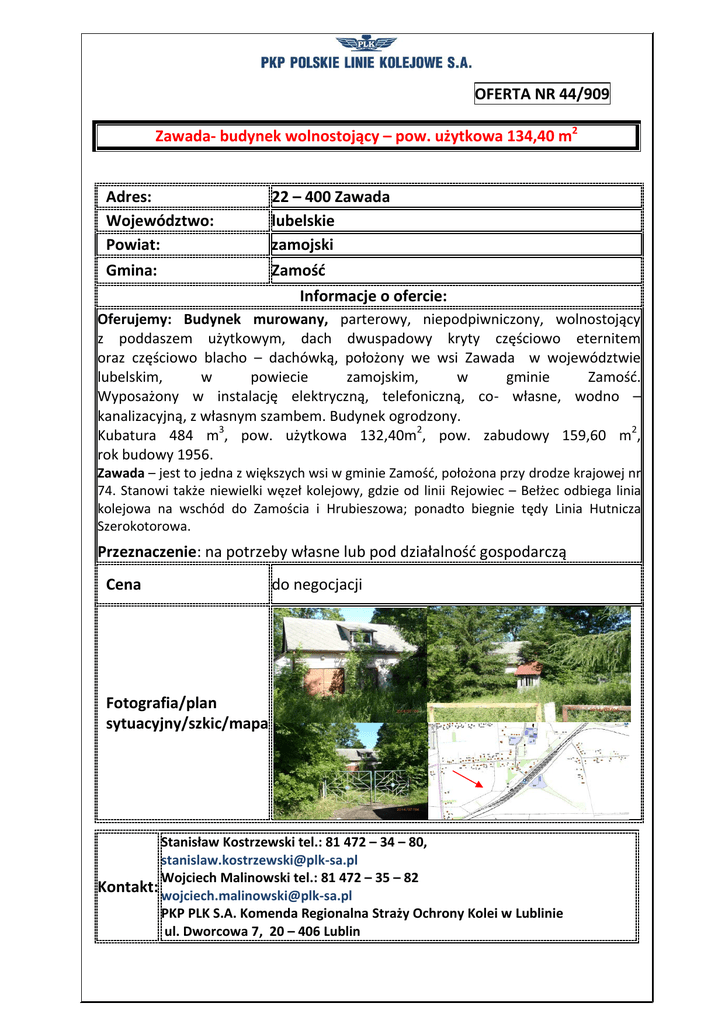 OFERTA NR 44/909 Zawada- budynek wolnostojący – pow. użytkowa 134,40 m2 Adres: Województwo: Powiat: 22 – 400 Zawada lubelskie zamojski Gmina: Zamość Informacje o ofercie: Oferujemy: Budynek murowany, parterowy, niepodpiwniczony, wolnostojący z poddaszem użytkowym, dach dwuspadowy kryty częściowo eternitem oraz częściowo blacho – dachówką, położony we wsi Zawada w województwie lubelskim, w powiecie zamojskim, w gminie Zamość. Wyposażony w instalację elektryczną, telefoniczną, co- własne, wodno – kanalizacyjną, z własnym szambem. Budynek ogrodzony. Kubatura 484 m3, pow. użytkowa 132,40m2, pow. zabudowy 159,60 m2, rok budowy 1956. Zawada – jest to jedna z większych wsi w gminie Zamość, położona przy drodze krajowej nr 74. Stanowi także niewielki węzeł kolejowy, gdzie od linii Rejowiec – Bełżec odbiega linia kolejowa na wschód do Zamościa i Hrubieszowa; ponadto biegnie tędy Linia Hutnicza Szerokotorowa. Przeznaczenie: na potrzeby własne lub pod działalność gospodarczą Cena do negocjacji Fotografia/plan sytuacyjny/szkic/mapa Stanisław Kostrzewski tel.: 81 472 – 34 – 80, [email protected] Wojciech Malinowski tel.: 81 472 – 35 – 82 Kontakt: [email protected] PKP PLK S.A. Komenda Regionalna Straży Ochrony Kolei w Lublinie ul. Dworcowa 7, 20 – 406 Lublin