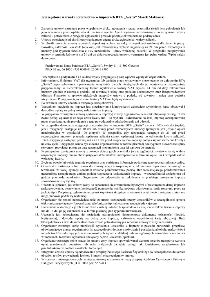 Szczegółowe warunki uczestnictwa w imprezach BTA „Gertis” Marek Makowski 1. 2. 3. Zawarcie umowy następuje przez wypełnienie druku zgłoszenia - przez uczestnika (jeŜeli jest pełnoletni) lub jego opiekuna i przez wpłatę zaliczki na konto agenta. Agent wystawia uczestnikowi - po otrzymaniu wpłaty zaliczki - potwierdzenie przyjęcia zgłoszenia i przesyła pocztą elektroniczną na podany adres. Umowa obowiązuje od chwili otrzymania przez agenta druku zgłoszenia i wpłaty zaliczki. W chwili zawarcia umowy uczestnik (opiekun) wpłaca zaliczkę w wysokości ustalonej dla danej imprezy. Pozostałą naleŜność uczestnik (opiekun) jest zobowiązany wpłacić najpóźniej na 21 dni przed rozpoczęciem imprezy pod rygorem skreślenia z listy uczestników i utraty wpłaconej zaliczki. W przypadku podpisywania umowy w terminie krótszym niŜ 21 dni do dnia rozpoczęcia umowy, wymagana jest pełna wpłata. Wpłat naleŜy dokonywać: Przelewem na konto bankowe BTA „Gertis”, Świdry 11, 11-500 GiŜycko PKO BP nr: 56 1020 4753 0000 0102 0041 8996 4. 5. 6. 7. 8. 9. 10. 11. 12. 13. 14. 15. 16. 17. 18. 19. Przy wpłacie z podpunktu b i c za datę wpłaty przyjmuje się datę wpływu wpłaty do organizatora. Informujemy, iŜ faktury VAT dla uczestnika lub zakładu pracy wystawiamy niezwłocznie po zgłoszeniu BTA „Gertis” zapotrzebowania i przekazania wszystkich danych niezbędnych do jej wystawienia. Jednocześnie przypominamy, iŜ nieprzekraczalny termin wystawienia faktury VAT wynosi 14 dni od daty zakończenia imprezy zgodnie z ustawą o podatku od towarów i usług oraz podatku dochodowym oraz Rozporządzeniem Ministra Finansów w sprawie niektórych przepisów ustawy o podatku od towarów i usług oraz podatku akcyzowym. Po upływie tego terminu faktury VAT nie będą wystawiane. Po zawarciu umowy uczestnik otrzymuje kartę obozową. Warunkiem przyjęcia na imprezę jest przedstawienie kierownikowi całkowicie wypełnionej karty obozowej i dowodów wpłaty na pełną kwotę naleŜności za imprezę. W przypadku rozwiązania umowy (odwołania imprezy) z winy organizatora uczestnik otrzymuje w ciągu 7 dni zwrot pełnej wpłaconej do tego czasu kwoty lub - do wyboru - skierowanie na inną imprezę zaproponowaną przez organizatora, nie przysługują z tego powodu Ŝadne odszkodowania ani odsetki. W przypadku dokonania rezygnacji z uczestnictwa w imprezie BTA „Gertis” zwraca 100% zaliczki (wpłat), jeŜeli rezygnacja następuje na 30 dni lub dłuŜej przed rozpoczęciem imprezy (potrącana jest jedynie opłata manipulacyjna w wysokości 100 złotych). W przypadku, gdy rezygnacja następuje do 21 dni przed rozpoczęciem imprezy, przepada wpłacona zaliczka (zwrot wpłaconej kwoty po odliczeniu kwoty zaliczki). JeŜeli rezygnacja następuje później niŜ na 21 dni przed rozpoczęciem imprezy potrąca się nie zwrócone koszty i naleŜny zysk. Rezygnacja winna być złoŜona organizatorowi w formie pisemnej pod rygorem niewaŜności (przy rezygnacji przysłanej pocztą za datę rezygnacji przyjmuje się datę jej wpływu do agenta). W przypadku rozwiązania umowy z powodu dotyczących uczestnika (w szczególności: niestawienia się w dniu rozpoczęcia imprezy, braku obowiązujących dokumentów, niezapłacenia w terminie opłat i in.) przepada całość wpłaconej kwoty. śycie na obozie lub rejsie reguluje regulamin oraz codzienne informacje podawane rano podczas odprawy załóg. Organizator zastrzega sobie prawo do zmiany miejsca rozpoczęcia i zakończenia rejsu oraz przesunięć w terminach. W takiej sytuacji uczestnik zostanie poinformowany pocztą. Bez wcześniejszego poinformowania uczestników nastąpić mogą zmiany godzin rozpoczęcia i zakończenia imprezy – w szczególności uzaleŜnione od godzin przyjazdu autokarów. Organizator nie odpowiada za zakłócenia w przebiegu programu imprezy spowodowane siłą wyŜszą. Uczestnik (opiekun) jest zobowiązany do zapoznania się z warunkami bytowymi oferowanymi na danej imprezie (zakwaterowanie, wyŜywienie, konieczność ponoszenia wysiłku podczas wiosłowania, jazdy rowerem, pracy na jachcie itp.). Podpisując zgłoszenie uczestnik (opiekun) akceptuje te warunki i uciąŜliwości związane z nimi nie mogą stanowić podstawy reklamacji. Organizator nie ponosi odpowiedzialności za utratę, uszkodzenia rzeczy uczestników w szczególności sprzętu elektronicznego (aparaty fotograficzne, telefoniczne itp.) uŜywane na sprzęcie pływającym. Ewentualne reklamacje - jeŜeli to moŜliwe - naleŜy składać bezpośrednio na miejscu w trakcie trwania imprezy lub do 14 dni po jej zakończeniu w formie pisemnej pod rygorem niewaŜności. Uczestnik jest zobowiązany do posiadania następujących dokumentów: dokumentu toŜsamości (dowód, legitymacja), dowodu wpłaty na pełną cenę imprezy, całkowicie wypełnionej karty obozowej. Brak któregokolwiek z ww. dokumentów moŜe zostać potraktowany jak zerwanie umowy z winy uczestnika. Organizator zastrzega sobie moŜliwość wydalenia uczestnika z imprezy z powodu naruszenia przepisów obowiązującego prawa, regulaminów (w szczególności dotyczy spoŜywania i posiadania alkoholu, narkotyków i innych środków odurzających, oraz samowolnych kąpieli i oddaleń) lub szczegółowych warunków uczestnictwa w imprezach. Kosztami wydalenia obciąŜony będzie uczestnik (opiekun). Organizator zastrzega sobie prawo do zmiany ceny imprezy spowodowanej wzrostu kosztów transportu wzrostu opłat urzędowych, podatków lub opłat naleŜnych za takie usługi, jak lotniskowe, załadunkowe lub przeładunkowe w portach morskich i lotniczych. Integralną częścią umowy są odpowiednie przepisy Polskiego Związku śeglarskiego (w szczególności dotyczące obozów, rejsów, prowadzenia jachtów i innych) oraz regulaminy imprez. W sprawach nieuregulowanych niniejszą umową zastosowanie mają przepisy Kodeksu Cywilnego i Ustawy o Usługach Turystycznych (D.U. 2001 poz. 55.578.)