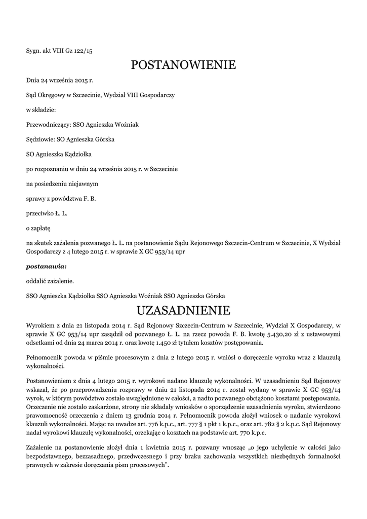 Sygn. akt VIII Gz 122/15 POSTANOWIENIE Dnia 24 września 2015 r. Sąd Okręgowy w Szczecinie, Wydział VIII Gospodarczy w składzie: Przewodniczący: SSO Agnieszka Woźniak Sędziowie: SO Agnieszka Górska SO Agnieszka Kądziołka po rozpoznaniu w dniu 24 września 2015 r. w Szczecinie na posiedzeniu niejawnym sprawy z powództwa F. B. przeciwko Ł. L. o zapłatę na skutek zażalenia pozwanego Ł. L. na postanowienie Sądu Rejonowego Szczecin-Centrum w Szczecinie, X Wydział Gospodarczy z 4 lutego 2015 r. w sprawie X GC 953/14 upr postanawia: oddalić zażalenie. SSO Agnieszka Kądziołka SSO Agnieszka Woźniak SSO Agnieszka Górska UZASADNIENIE Wyrokiem z dnia 21 listopada 2014 r. Sąd Rejonowy Szczecin-Centrum w Szczecinie, Wydział X Gospodarczy, w sprawie X GC 953/14 upr zasądził od pozwanego Ł. L. na rzecz powoda F. B. kwotę 5.430,20 zł z ustawowymi odsetkami od dnia 24 marca 2014 r. oraz kwotę 1.450 zł tytułem kosztów postępowania. Pełnomocnik powoda w piśmie procesowym z dnia 2 lutego 2015 r. wniósł o doręczenie wyroku wraz z klauzulą wykonalności. Postanowieniem z dnia 4 lutego 2015 r. wyrokowi nadano klauzulę wykonalności. W uzasadnieniu Sąd Rejonowy wskazał, że po przeprowadzeniu rozprawy w dniu 21 listopada 2014 r. został wydany w sprawie X GC 953/14 wyrok, w którym powództwo zostało uwzględnione w całości, a nadto pozwanego obciążono kosztami postępowania. Orzeczenie nie zostało zaskarżone, strony nie składały wniosków o sporządzenie uzasadnienia wyroku, stwierdzono prawomocność orzeczenia z dniem 13 grudnia 2014 r. Pełnomocnik powoda złożył wniosek o nadanie wyrokowi klauzuli wykonalności. Mając na uwadze art. 776 k.p.c., art. 777 § 1 pkt 1 k.p.c., oraz art. 782 § 2 k.p.c. Sąd Rejonowy nadał wyrokowi klauzulę wykonalności, orzekając o kosztach na podstawie art. 770 k.p.c. Zażalenie na postanowienie złożył dnia 1 kwietnia 2015 r. pozwany wnosząc „o jego uchylenie w całości jako bezpodstawnego, bezzasadnego, przedwczesnego i przy braku zachowania wszystkich niezbędnych formalności prawnych w zakresie doręczania pism procesowych”. Skarżący wskazał, że pozew w sprawie dostał mu doręczony w dniu 5 czerwca 2014 r. Zgodnie z pouczeniem wniósł sprzeciw od wydanego przez Sąd Rejonowy nakazu zapłaty, po czym sprawa była rozpoznawana w trybie zwykłym. Wskazał dalej, że w sprzeciwie wnosił o oddalenie powództwa wskazując okoliczności i fakty uzasadniające brak zasadności roszczenia powoda, oraz leżące po stronie powoda błędy i niedopełnienia czynności mających wpływ na treść realizacji zawartej umowy dotyczącej zleceniodawcy zagranicznego. Wskazał również, że po zawiadomieniu go przez Sąd Rejonowy o wyznaczeniu terminu rozprawy na dzień 21 listopada 2014 r. wysłał pismo do Sądu Rejonowego, w którym oświadczył, że podtrzymuje swoje stanowisko wyrażone w sprzeciwie od nakazu zapłaty i wnosi o oddalenie powództwa w całości i obciążenie kosztami sądowymi, które - jak napisał w uzasadnieniu zażalenia - „w tej sprawie są znaczne i moim zdaniem nie znajdują potwierdzenia ani w wymaganym nakładzie prac, ani zawiłości sprawy, ani też w przepisach”. Podniósł także, iż nie otrzymał do dnia wniesienia zażalenia żadnego orzeczenia Sądu Rejonowego, a w szczególności nie otrzymał orzeczenia stanowiącego tytuł wykonawczy w sprawie, tj. wyroku z dnia 21 listopada 2014 r. wydanego w sprawie X GC 953/14. Skarżący dodał, że z przyczyn zdrowotnych i trudnej sytuacji rodzinnej nie mógł wziąć udziału w rozprawie przed Sądem Rejonowym, a ponieważ nie doręczono mu orzeczenia, nie mógł go zaskarżyć „w normlanym trybie procesowym”. Wskazał również, że jak wynika z zawiadomienia Komornika Sądowego przy Sądzie Rejonowym w Łowiczu M. C. wyrokowi temu Sąd Rejonowy nadał klauzulę wykonalności, co skarżący uważa za „bezpodstawne i bezzasadne oraz przedwczesne i bez głębszego zbadania przedmiotowej sprawy”. W związku z tym pozwany wniósł „o pozbawienie tytułu wykonawczego wykonalności w całości”. W odpowiedzi na zobowiązanie Przewodniczącego w piśmie złożonym w dniu 2 czerwca 2015 r. skarżący wskazał, że zawiadomienie o wszczęciu postępowania egzekucyjnego od Komornika Sądowego przy Sądzie Rejonowym w Łowiczu M. C., sygn. akt Km(...), otrzymał w dniu 27 marca 2015 r., oraz że postępowanie komornicze toczy się pod sygnaturą Km (...) w oparciu o wyrok z dnia 21 listopada 2014 r., wydany w sprawie o sygn. akt X GC 953/14 upr. Sąd Okręgowy zważył, co następuje: Zażalenie okazało się niezasadne. Sąd Rejonowy prawidłowo wskazał podstawę prawną swojego rozstrzygnięcia wskazując na art. 776 k.p.c., art. 777 § 1 pkt 1 k.p.c. oraz art. 782 § 1 k.p.c. W art. 776 k.p.c. jest mowa o tym, że podstawą egzekucji jest tytuł wykonawczy. Tytułem wykonawczym jest tytuł egzekucyjny zaopatrzony w klauzulę wykonalności, chyba że ustawa stanowi inaczej. Zgodnie z art. 777 § 1 pkt 1 k.p.c. tytułem egzekucyjnym jest orzeczenie sądu prawomocne lub podlegające natychmiastowemu wykonaniu, jak również ugoda zawarta przed sądem. Natomiast stosownie do art. 782 § 1 k.p.c. klauzulę wykonalności nadaje sąd jednoosobowo na wniosek wierzyciela. Analiza akt sprawy prowadzi do stwierdzenia, że wydano wyrok, który jest tytułem wykonawczym, wyrok ten uprawomocnił się z dniem 13 grudnia 2014 r., pełnomocnik powoda, który wygrał proces, wniósł po dacie uprawomocnienia się wyroku (w dniu 2 lutego 2015 r.) o nadanie klauzuli wykonalności, co Sąd Rejonowy uczynił dnia 4 lutego 2015 r. Niezasadne zatem w świetle wskazanych wyżej przepisów są zarzuty skarżącego, iż klauzulę wykonalności nadano bezpodstawnie, bezzasadnie i przedwcześnie. Odnosząc się do zarzutu naruszenia przez Sąd Rejonowy przepisów postępowania dotyczących doręczeń Sąd Okręgowy stwierdził, że naruszenia takie nie mi