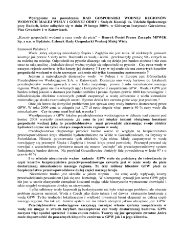 Wystąpienie na posiedzeniu RAD GOSPODARKI WODNEJ REGIONÓW WODNYCH MAŁEJ WISŁY i GÓRNEJ ODRY i Stałych Komisji ds. Udziału Społecznego przy Radach, które odbędzie się w dniu 19 lutego 2009r. w Głównym Instytucie Górnictwa; Plac Gwarków 1 w Katowicach. „Koszty gospodarki wodami a cena wody do picia” – Henryk Postel Prezes Zarządu MPWIK Sp. z o.o. w Będzinie. Członek Rady Gospodarki Wodnej Małej Wisły Szanowni Państwo ! Woda ,którą uŜywają mieszkańcy Śląska i Zagłębia nie jest tania. W niektórych gminach kosztuje juŜ prawie 5 złoty netto Rachunki za wodę i ścieki przekroczyły granicę 50,- złotych na na rodzinę na miesiąc. Odpowiedź na pytanie dlaczego tak się dzieje jest bardzo złoŜona i nie czas teraz na taką analizę . JednakŜe dosyć waŜną wydaje się odpowiedź na pytanie – Czy cena wody w naszym rejonie zawiera tylko koszty jej dostawy ? I czy w tej cenie nie ma zawartych kosztów gospodarki wodami w duŜo szerszym zakresie niŜ tylko komunalne zastosowanie ? Jednym z największych dostawców wody w Polsce i w Europie jest Górnośląskie Przedsiębiorstwo Wodociągowe S.A. w Katowicach. Dostarcza ono wodę hurtowo do lokalnych przedsiębiorstw wodociągowych a one z kolei zaopatrują prawie 3 mln mieszkańców naszego regionu. Wiele gmin nie ma własnych ujęć i korzysta tylko z zaopatrzenia GPW. Woda z GPW jest bardzo dobrej jakości a dostawa jest bardzo stabilna i pewna. System prawie 1000 km rurociągów i kilkudziesięciu obiektów sieciowych ,potrafi zaopatrzyć w wodę odbiorców z wielu kierunków minimalizując skutki ewentualnych awarii. System działa bez zarzutu gdzie więc jest problem ? OtóŜ jak łatwo się domyśleć problemem jest sprawa ceny wody hurtowo dostarczanej przez GPW. W roku 2009 cena ta osiągnie juŜ 1,77 zł netto sięgnie więc prawie 40 % ceny wody dla mieszkańców. Czy ta cena musi być tak wysoka ? Współpracujące z GPW lokalne przedsiębiorstwa wodociągowe w debacie nad cenami pod koniec 2008 wyraziły przekonanie ,Ŝe cena ta jest między innymi obciąŜona kosztami gospodarki wodnej jaką to przedsiębiorstwo musi prowadzić utrzymując swoje obiekty hydrotechniczne nie tylko słuŜące zaopatrzeniu regionu w wodę. Przedsiębiorstwo eksploatuje przecieŜ bardzo waŜne ze względu na bezpieczeństwo przeciwpowodziowe kraju zbiorniki hydrotechniczne na Wiśle w Goczałkowicach, na Brynicy w Świerklańcu. Historia powstawania tych obiektów była róŜna. Miały zaopatrywać w wodę rozwijający się przemysł Śląska i Zagłębia i bronić kraju przed powodzią. Przemysł przestał się rozwijać a wszechobecne górnictwo nawet się mocno “zwinęło” ale przeciwpowodziowy system funkcjonuje bardzo dobrze. Na przykład Goczałkowice obniŜyły falę powodziową w lecie 97 r o prawie 40 % I to właśnie niezmiernie waŜne zadanie GPW stało się podstawą do twierdzenia Ŝe część kosztów bezpieczeństwa przeciwpowodziowego zawarta jest w cenie wody do picia dostarczanej mieszkańcom naszego regionu. Te trzy miliony klientów GPW płaci za bezpieczeństwo przeciwpowodziowe duŜej części naszego kraju. Niezmiernie trudno jest określić w jakim stopniu na cenę wody wpływają koszty przeciwdziałania powodziom i jak się one kształtują. W niezręcznej sytuacji jest samo GPW gdyŜ nie jest w stanie elastycznie zarządzać kosztami mając takie historycznie wyznaczone obowiązki i takie niegdyś strategiczne obiekty na utrzymaniu. I póki odbiorcy wody kupowali ją bezkrytycznie nie było większego problemu ale obecnie problem zaczyna narastać. Woda z Czech jako duŜo tańsza i od dawna skutecznie konkuruje z wodą GPW .Tylko trudności lokalizacyjne i wielkość inwestycji broni ekspansji na dalszą część naszego regionu. No tak ale tamten system nie ma takich obciąŜeń jakimi obciąŜone jest GPW. Przedsiębiorstwa wodociągowe zaczynają rozwijać własne systemy zaopatrzenia w wodę nie mogąc w swoich taryfach zaakceptować cen wody dostarczanej hurtowo. GPW zaczyna więc spadać sprzedaŜ i cena znowu rośnie. Tworzy się juŜ sprzęŜenie zwrotne ,które moŜe doprowadzić do powaŜnych kłopotów zarówno w GPW jak i u jego klientów. Czas moim zdaniem objąć ten problem powaŜną dyskusją i w konsekwencji wypracować takie rozwiązania organizacyjne i finansowe, które pomogą GPW, jego klientom a przede wszystkim mieszkańcom, którym się naleŜy tania woda i bezpieczna rzeki. Henryk Postel